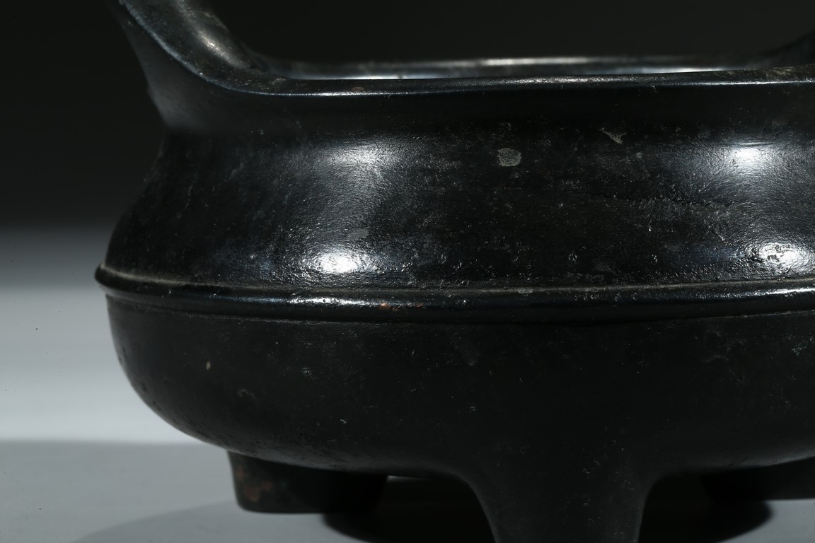 The compressed globular body supported on three short short legs, the mouthrim surmounted by a pair of arched handles, the base cast with a recessed rectangular panel enclosing an inscription reading Xuande Nianzhi, the patinated bronze surface of dark brown color. Qing Dynasty period.