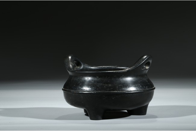 爐為橋耳,扁寬,雙耳窈窕,耳孔扁圓,口薄壁薄,膛底稍厚,腹圓垂,足精巧,無處不工,皮色呈黑漆古,實蘊藏經,寶光溢彩,珠瑩玉潤,銅質優良,為混合精煉銅也,柔綿如絨,細密膩實,“宣德年製”款識。整器包漿沉厚,入手沉穩,實屬難得。