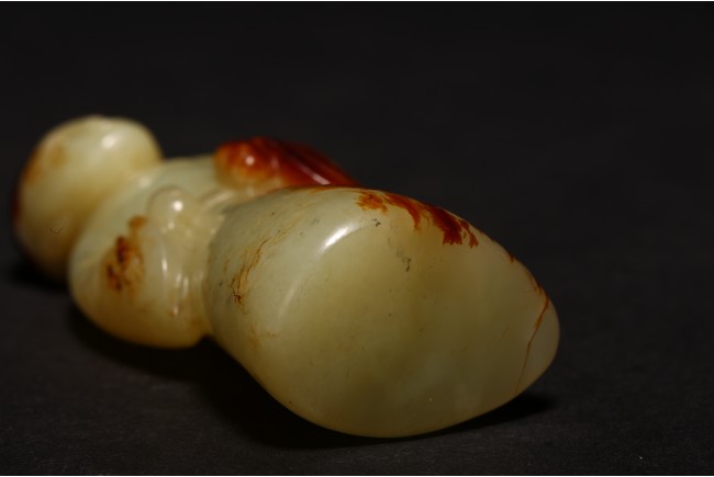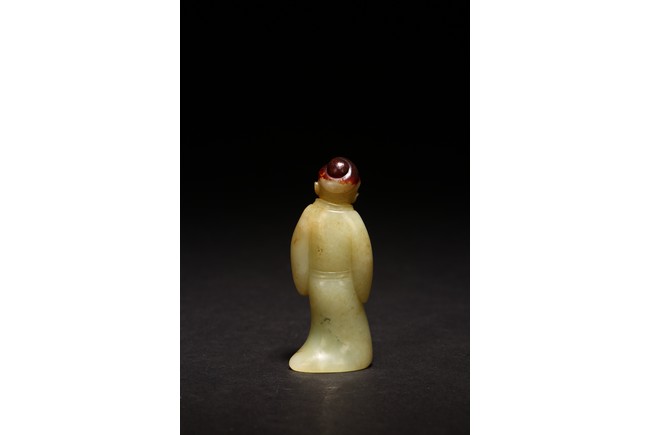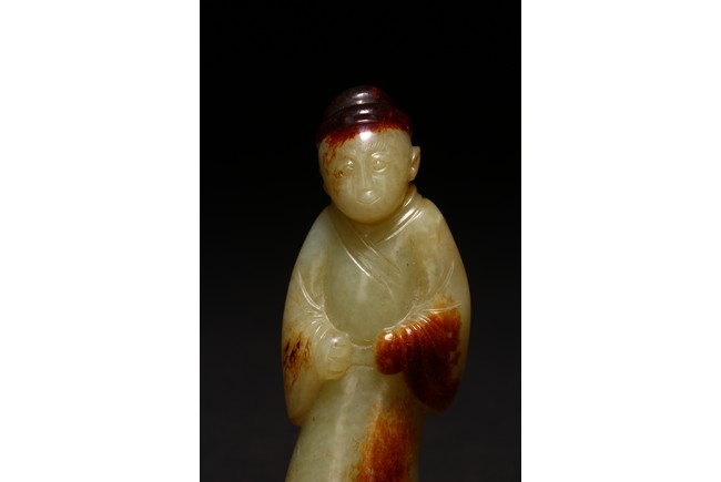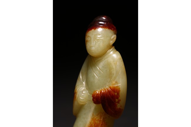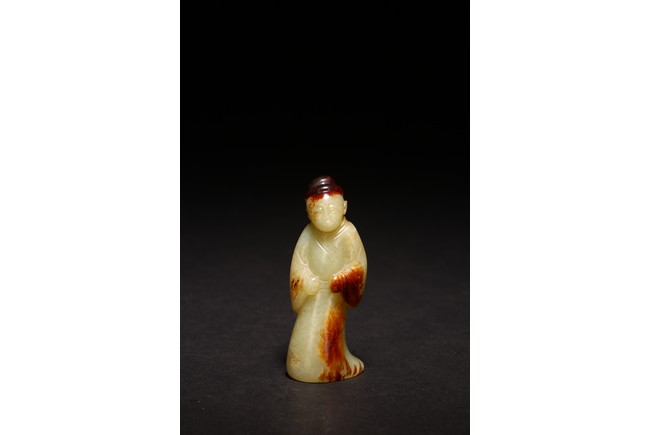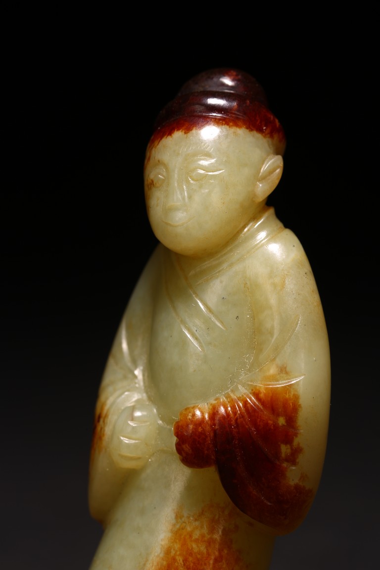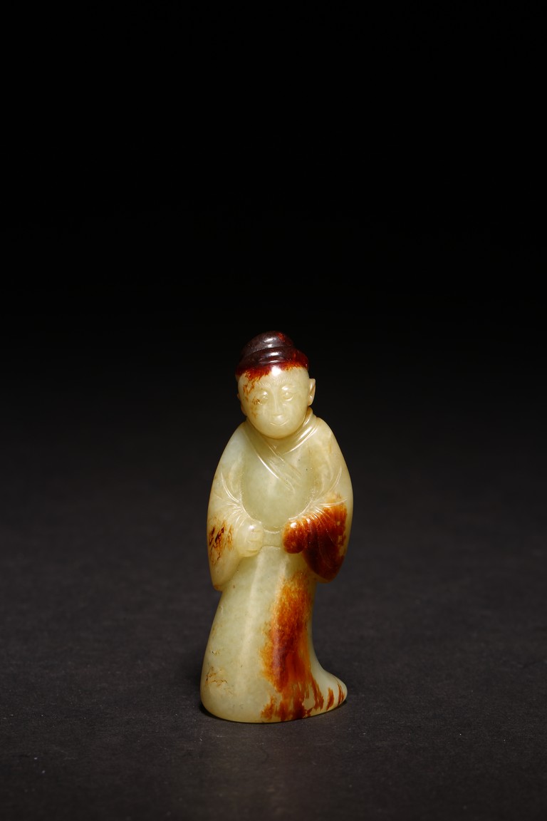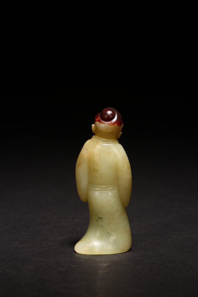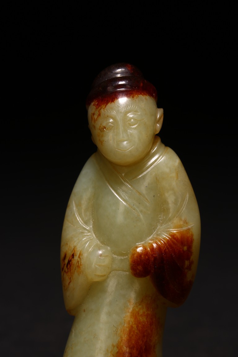 白玉製成,玉質潔白細膩,瑩潤光潔,局部帶有紅褐色沁色。圓雕製成,人物細長眉,圓眼,闊鼻,小嘴,身著通體長袍,衣紋清晰自然。來源:紐約資深藏家收藏 Provenance: Property from an important private collection, New York