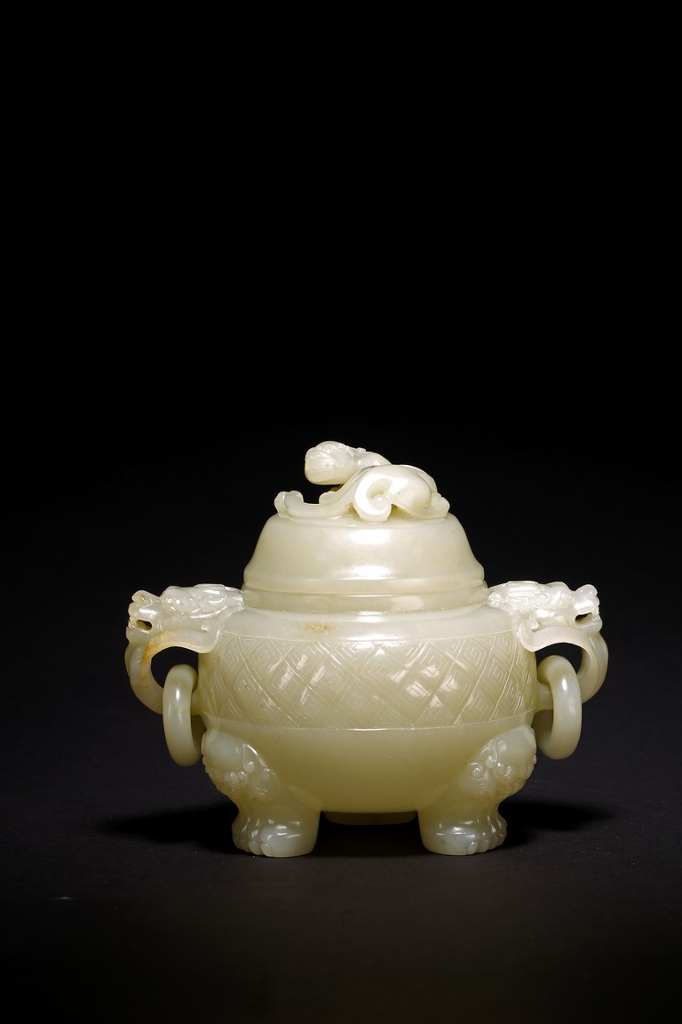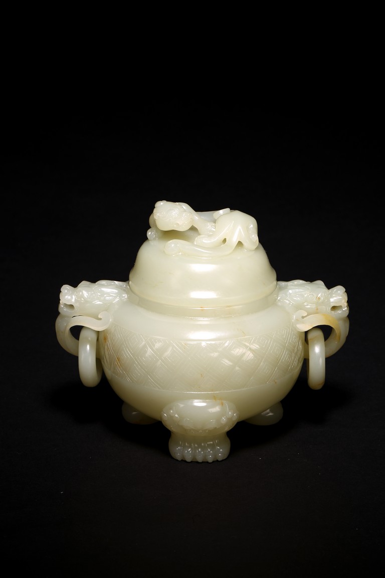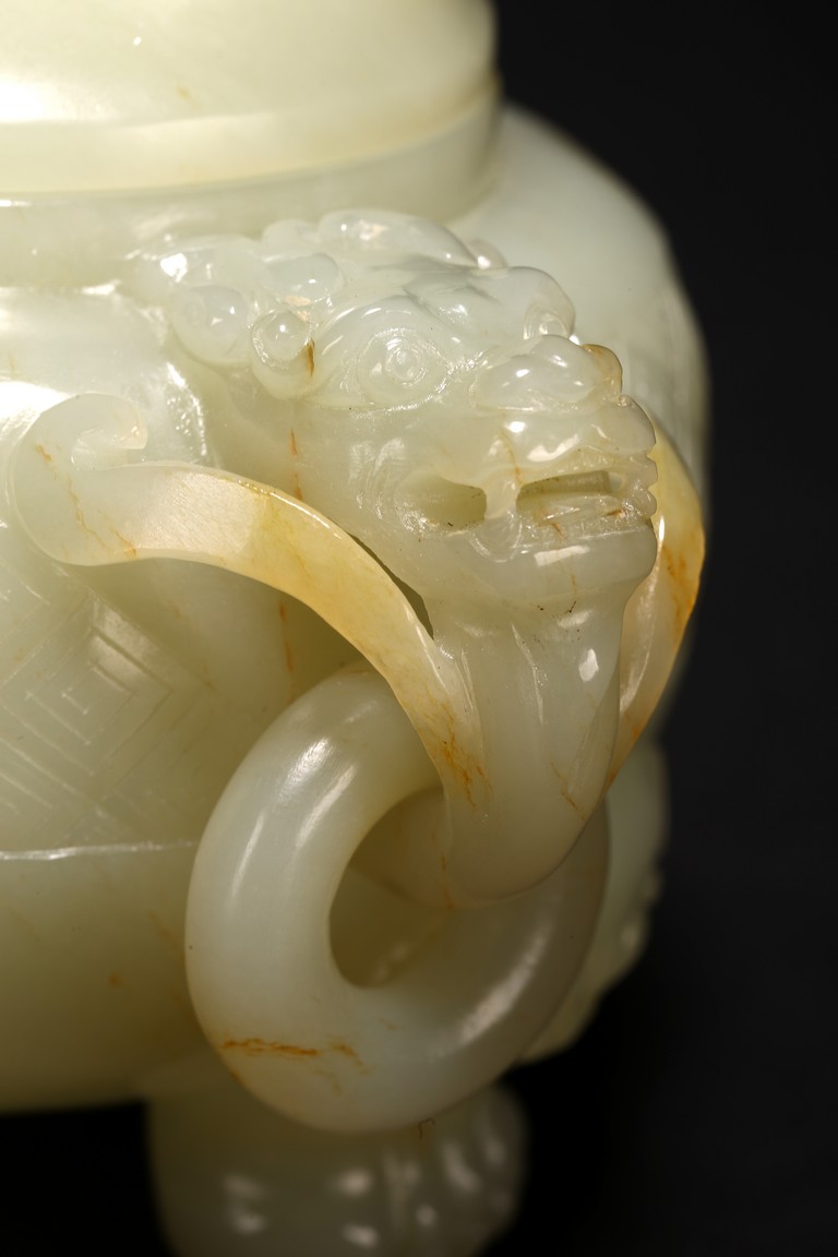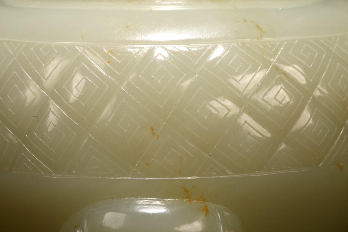 Of globular form, set with lion-mask ring handles to either side, raised on three short cabriole legs, the cover with a 'chilong' knop, the body carved with a raised band of geometric key-fret pattern, the stone is of well polished white tone. Qing Dynasty period.