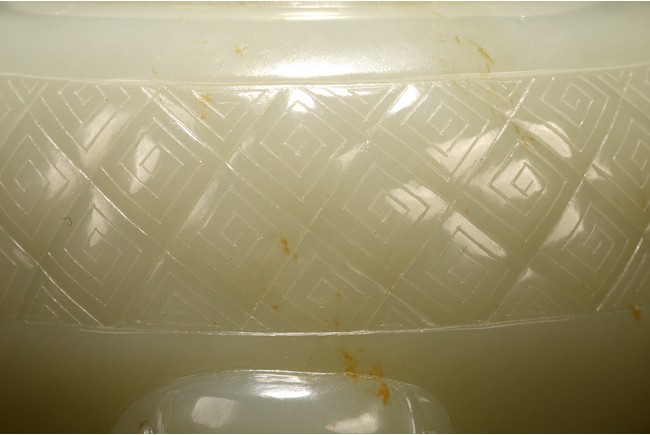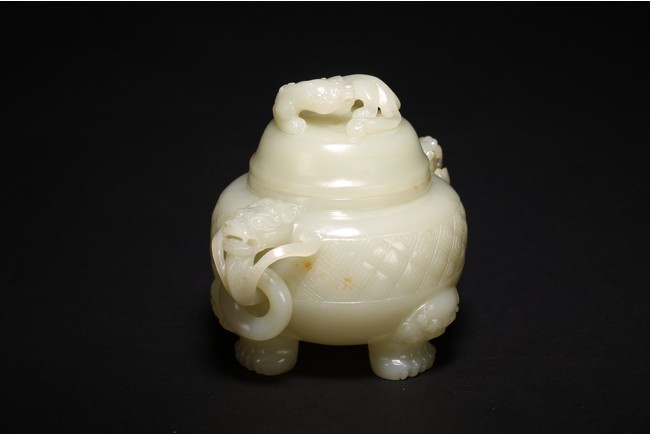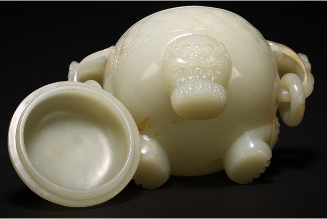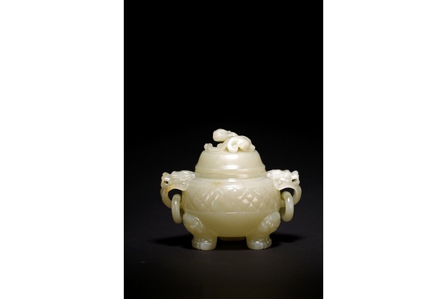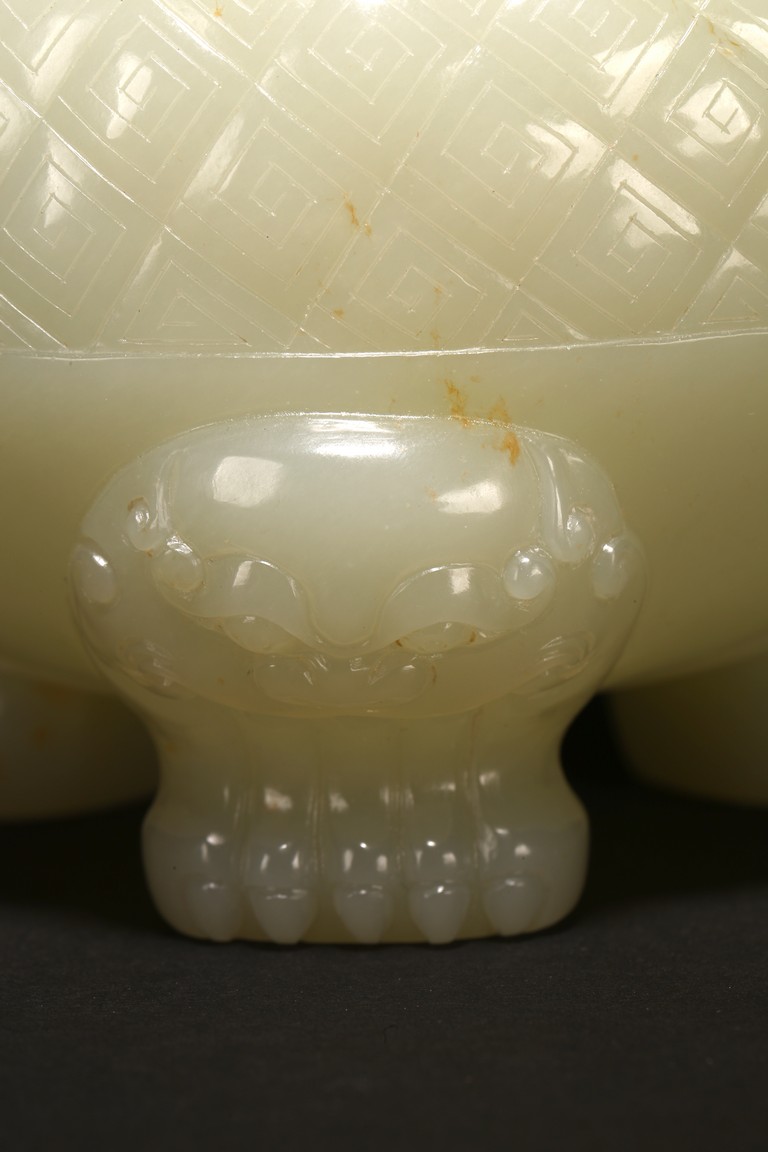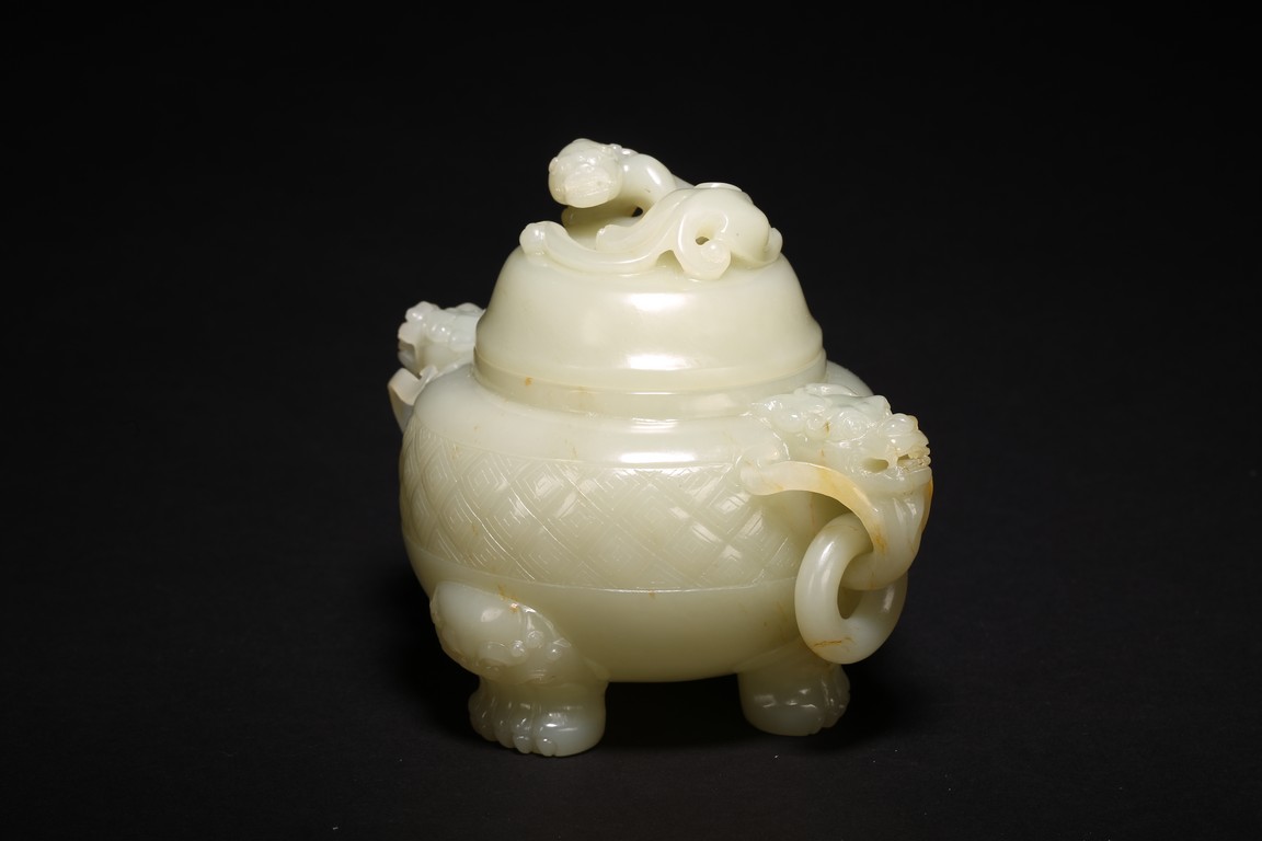 Of globular form, set with lion-mask ring handles to either side, raised on three short cabriole legs, the cover with a 'chilong' knop, the body carved with a raised band of geometric key-fret pattern, the stone is of well polished white tone. Qing Dynasty period.
