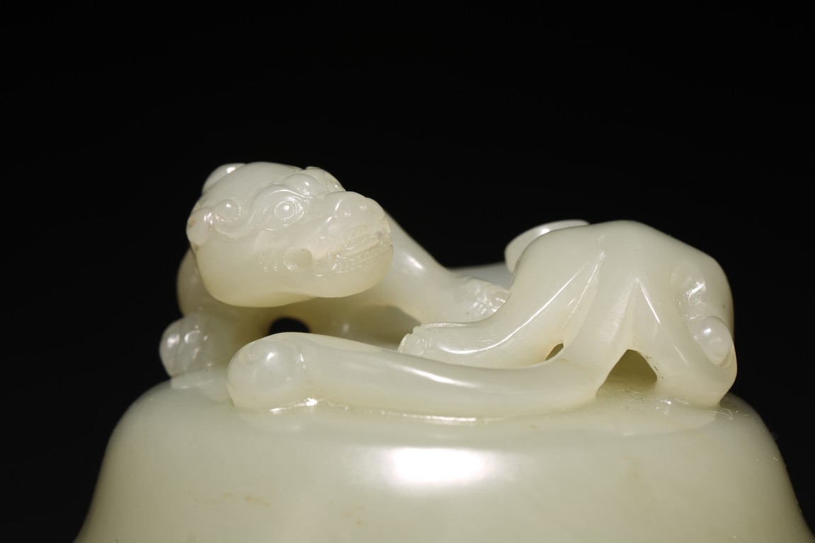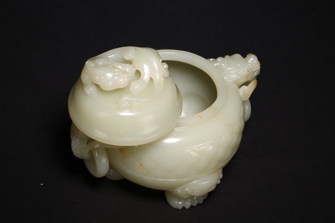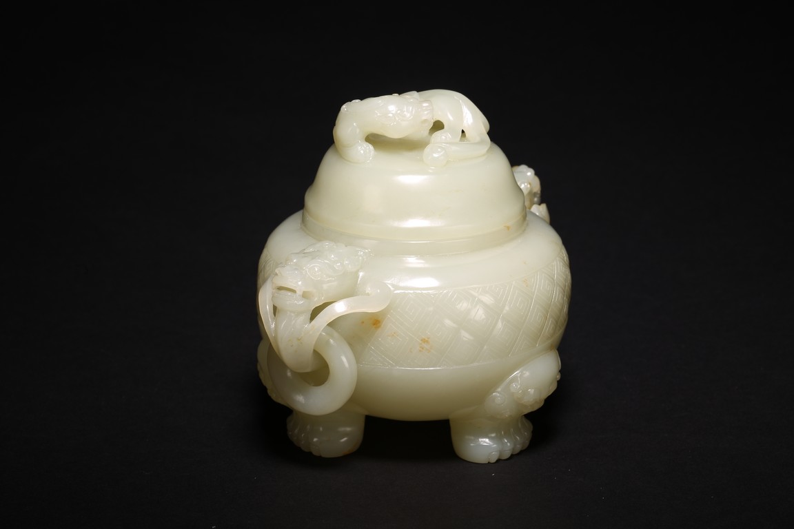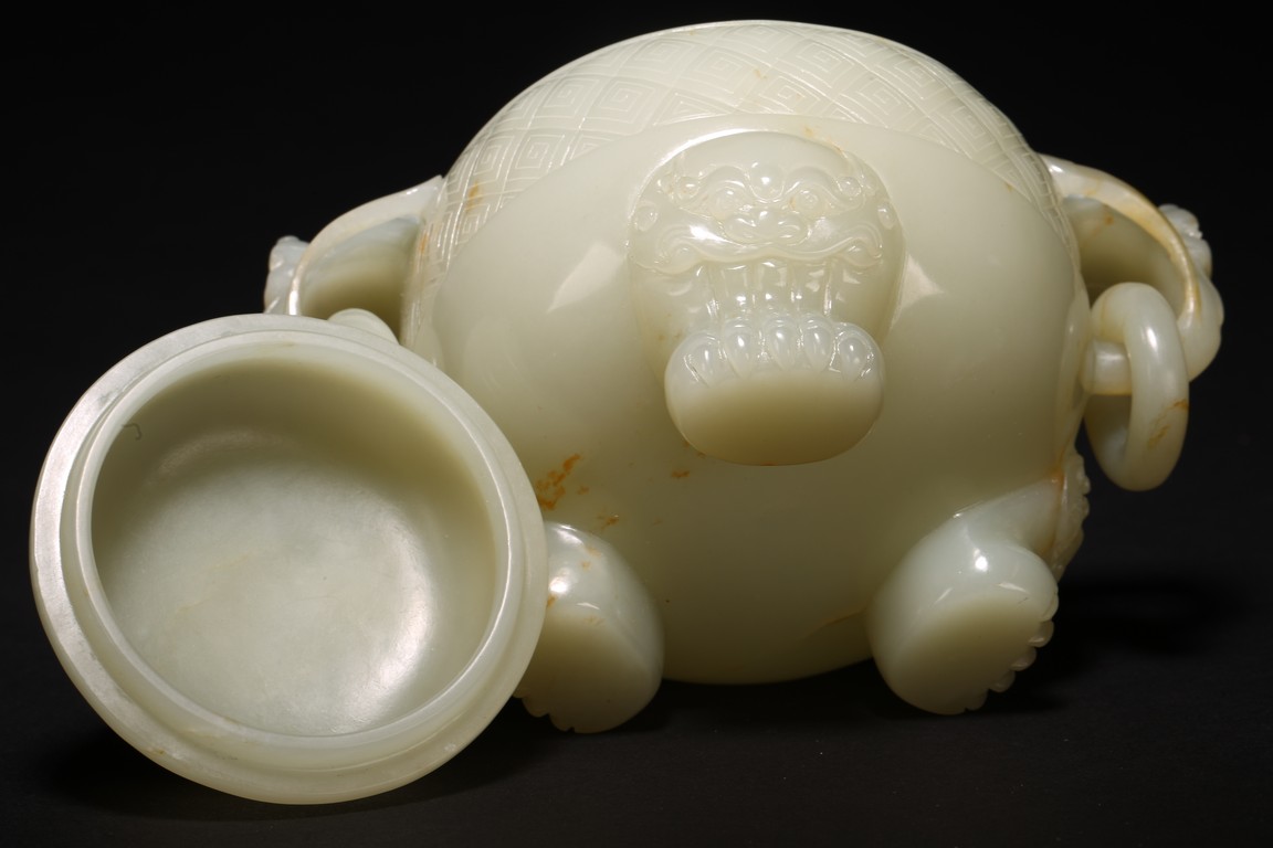此爐白玉為材,玉質潔潤,凝若濃脂。蓋頂圓雕螭龍鈕。蓋身素麵不琢,盡顯玉質之美。兩側肩部雕琢雙龍耳,下承活環。圜底接三足,均為獅首柱形,足端外撇。此爐選料極精,刀工細膩流暢,造型古樸厚重,琢刻規整,拋光極好,實為難得。