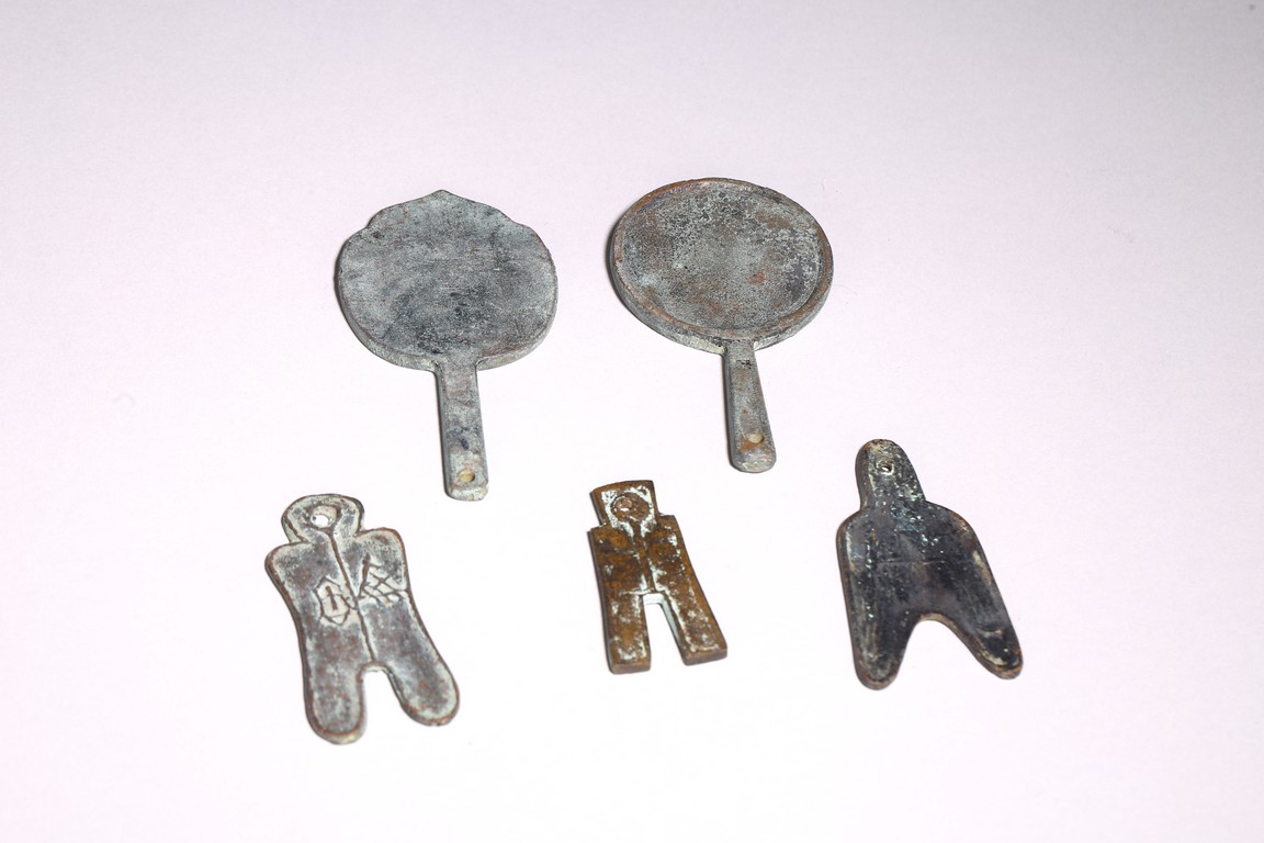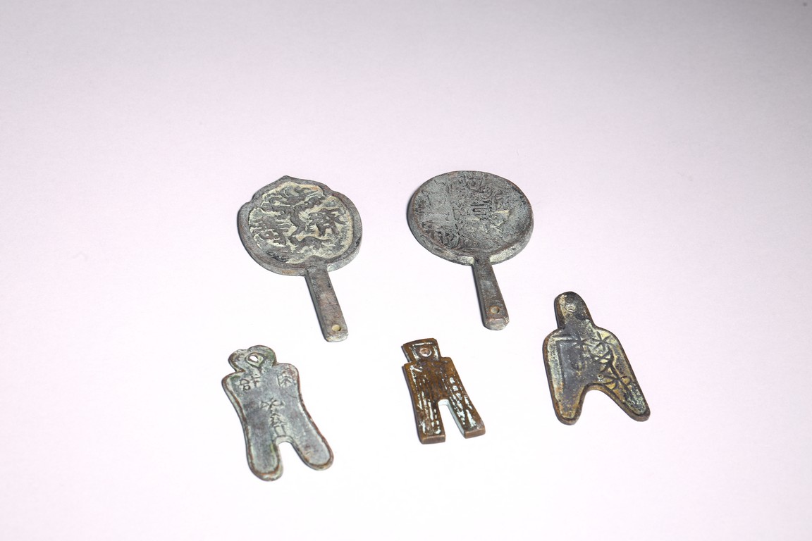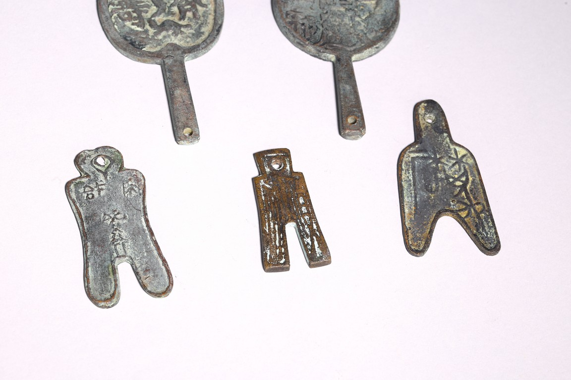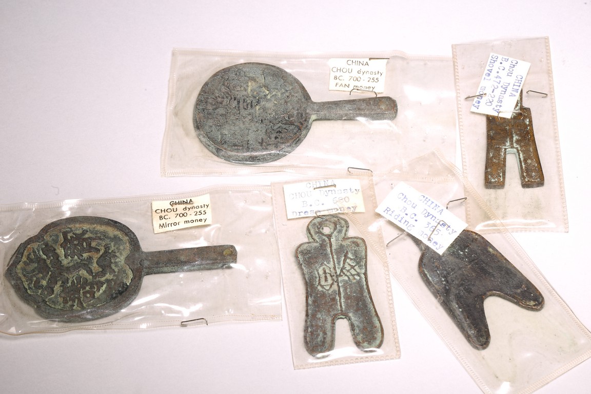 Consisting of five various bronze coins, all with inscriptions or pictographs. Eastern Zhou Dynasty period.