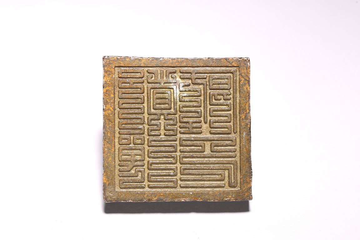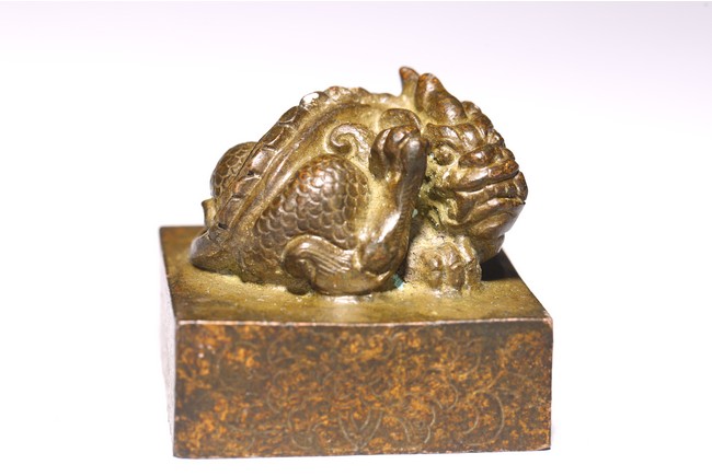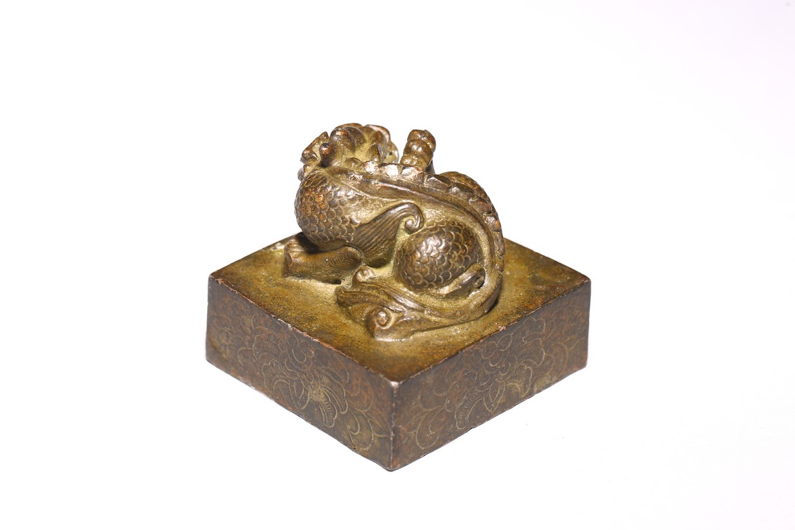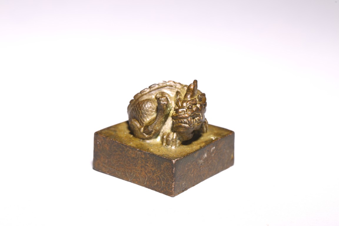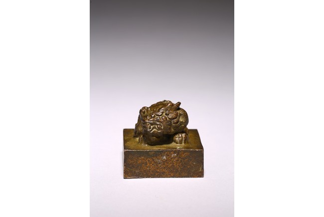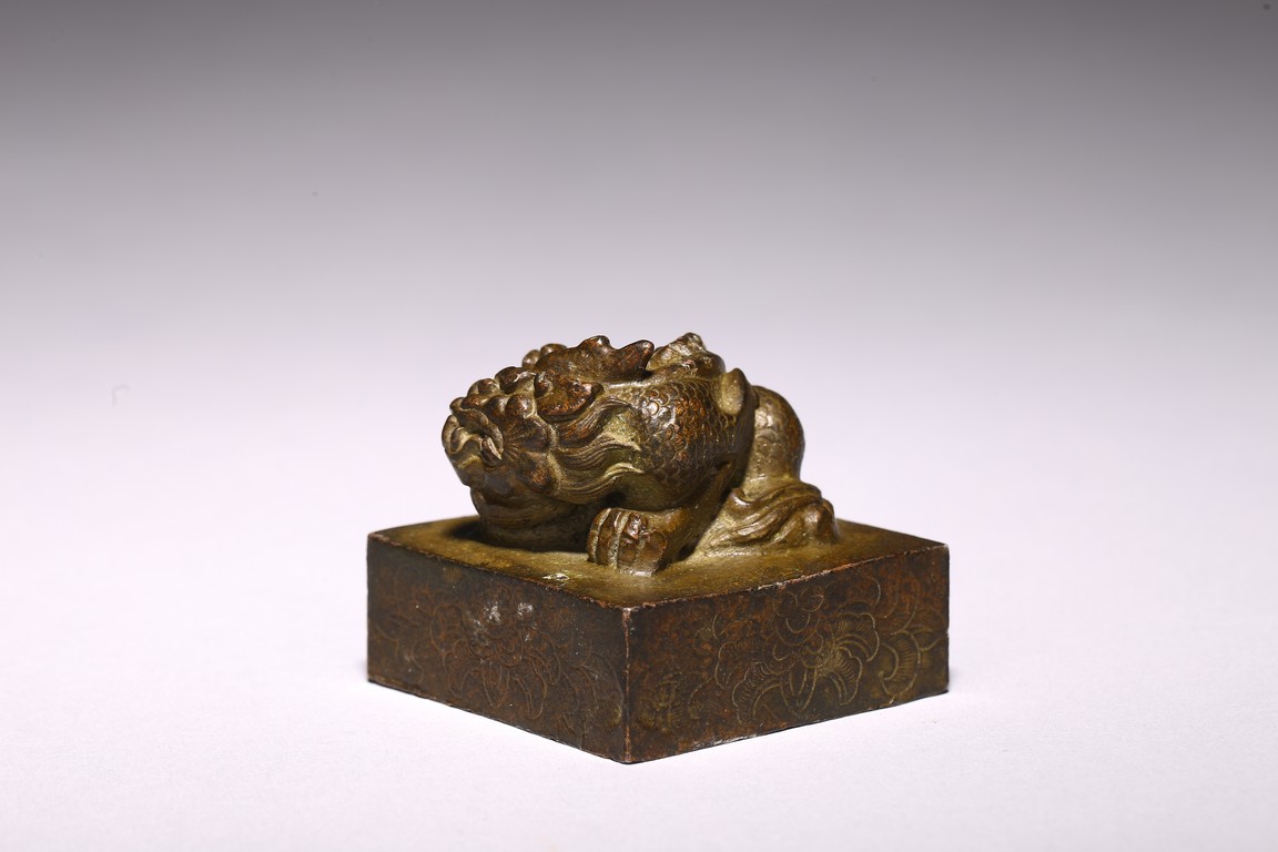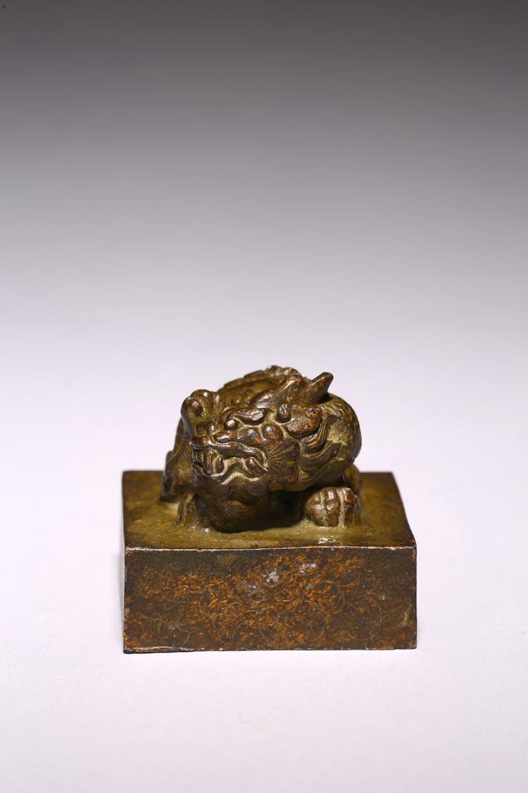 Chinese. Of square form, the seal cat with a ferocious recumbent mythical beast, the seal face carved with four characters. Qing Dynasty period.