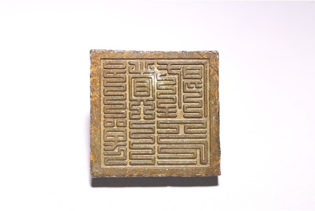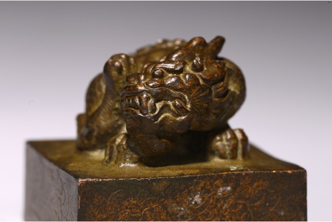 銅製而成,色澤深沉,包漿溫潤古樸。頂立獨角,雙耳舒展,雙眼外凸,炯炯有神,張口卷鼻,身軀豐滿而堅實,四肢強健粗壯,整體造型生動逼真,神態威武,神形兼備,底部印文雕刻清晰。