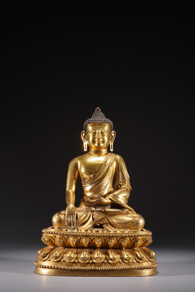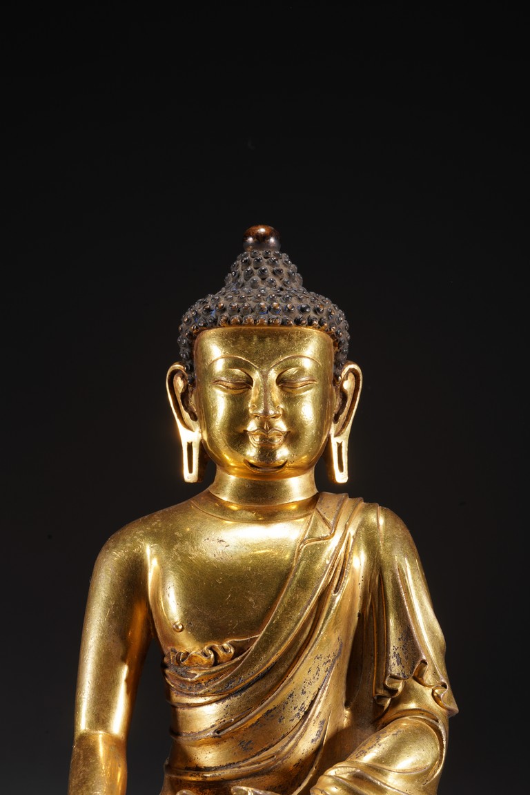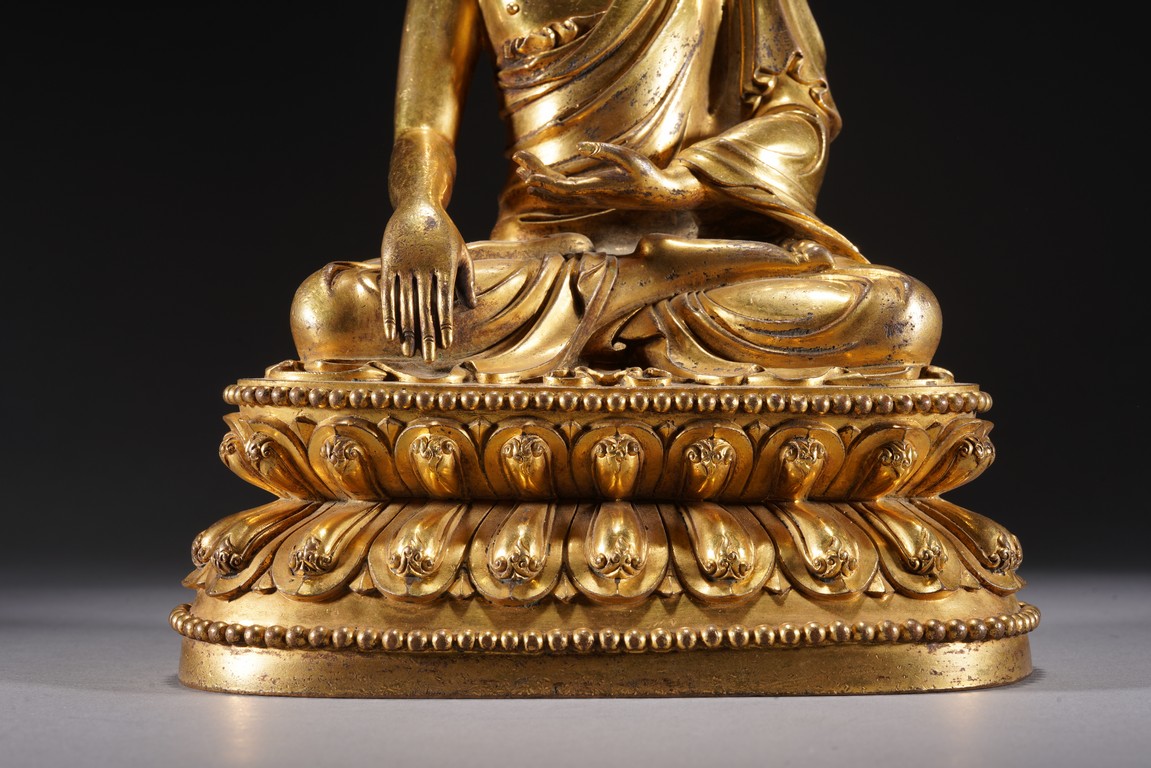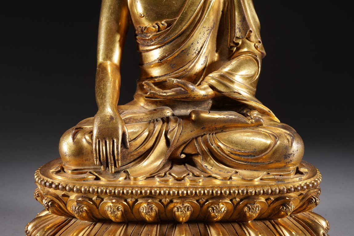 此件釋迦牟尼像身軀挺拔,肢體比例把握準確,表現出極高的造型功力。螺髪排列規整,頂部肉髻圓凸,上飾寶珠頂嚴。面部臉頰豐滿,雙目微合,眉間白毫,雙眉細長,鼻樑堅挺,雙眉與鼻準相連成優美曲線,顯得格外俊朗,氣度恢宏。雙腿結全跏趺坐,左手置腹前結禪定印,右手於垂膝前結觸地印,指頭柔軟生動。身著袒右式袈裟,一角反搭蓋住右肩,胸部露出內束裙腰,轉折流暢自然,袈裟上鏨刻有細緻精美花紋,明顯借鑒了織繡上的裝飾圖案。蓮座為仰覆蓮式,沉穩寬大,上下層均飾有細密的連珠紋,珠粒晶圓,雖是銅鑄,卻讓人感覺到玉石的圓潤,蓮瓣造型寬闊,每一瓣均有兩層,瓣尖有捲草紋裝飾,是典型的明代造像製式。來源: 重要紐約藏家收藏 Provenance: Important private collection, New York