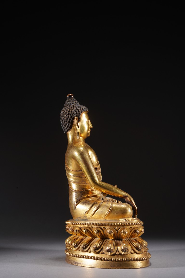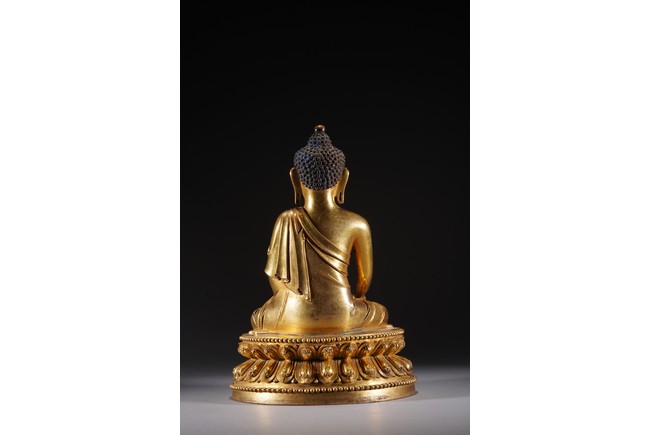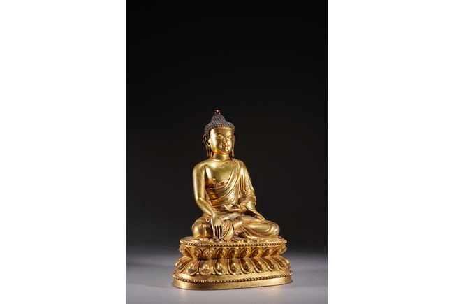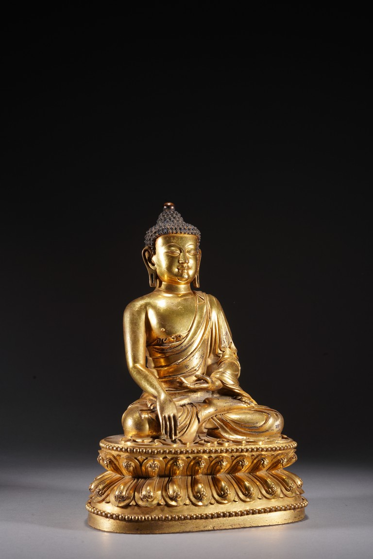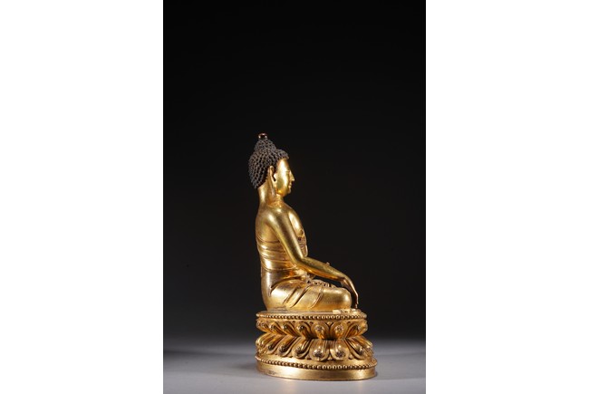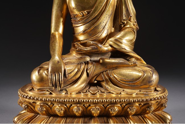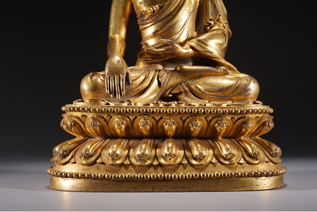 此件釋迦牟尼像身軀挺拔,肢體比例把握準確,表現出極高的造型功力。螺髪排列規整,頂部肉髻圓凸,上飾寶珠頂嚴。面部臉頰豐滿,雙目微合,眉間白毫,雙眉細長,鼻樑堅挺,雙眉與鼻準相連成優美曲線,顯得格外俊朗,氣度恢宏。雙腿結全跏趺坐,左手置腹前結禪定印,右手於垂膝前結觸地印,指頭柔軟生動。身著袒右式袈裟,一角反搭蓋住右肩,胸部露出內束裙腰,轉折流暢自然,袈裟上鏨刻有細緻精美花紋,明顯借鑒了織繡上的裝飾圖案。蓮座為仰覆蓮式,沉穩寬大,上下層均飾有細密的連珠紋,珠粒晶圓,雖是銅鑄,卻讓人感覺到玉石的圓潤,蓮瓣造型寬闊,每一瓣均有兩層,瓣尖有捲草紋裝飾,是典型的明代造像製式。來源: 重要紐約藏家收藏 Provenance: Important private collection, New York
