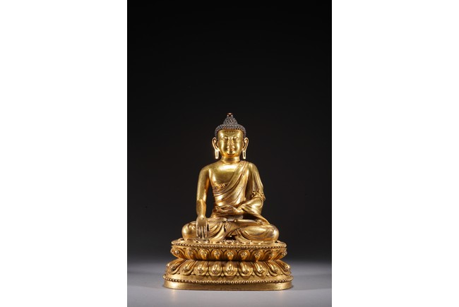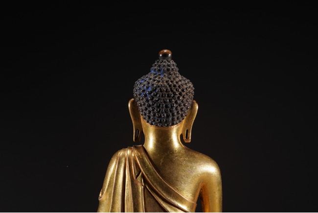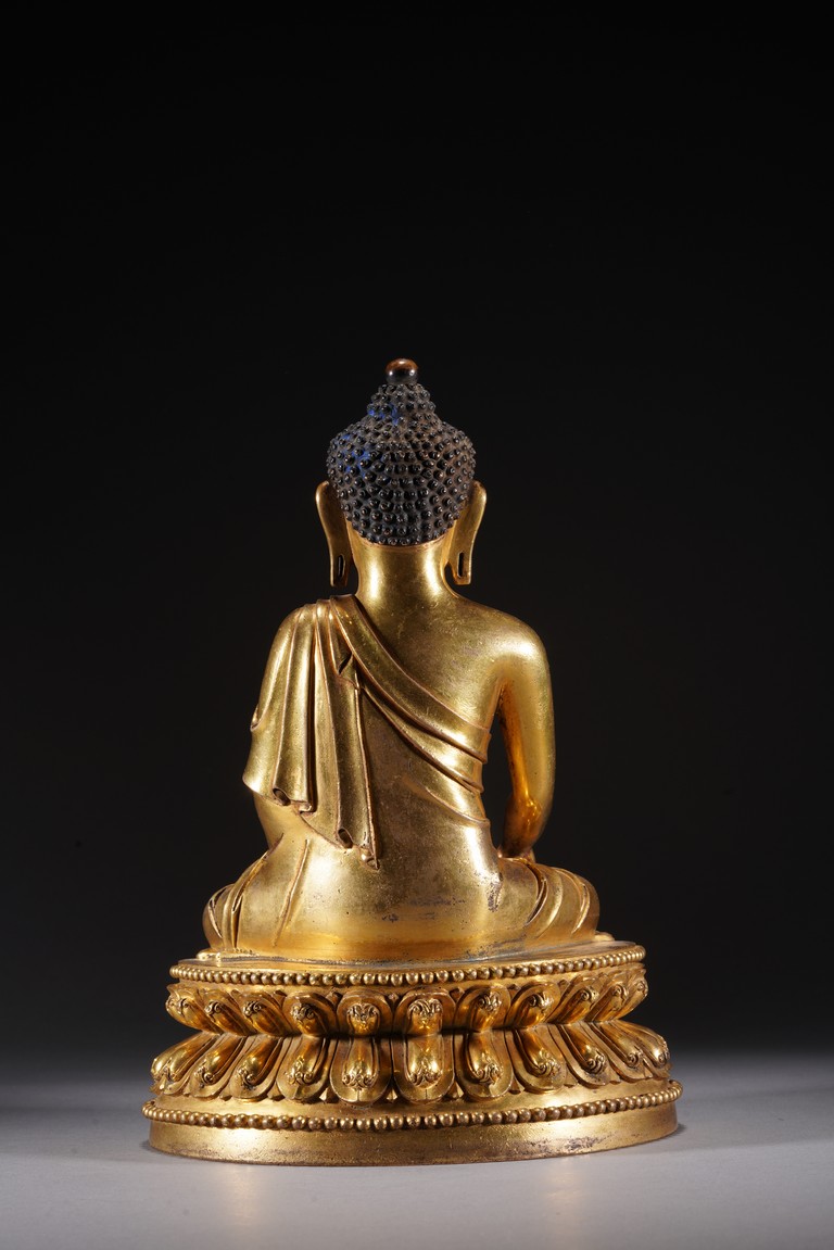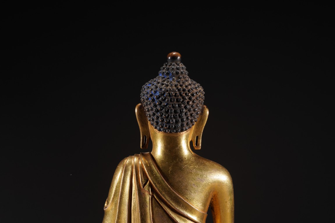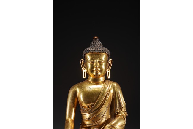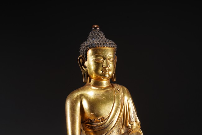 Seated in dhyanasana on a double lotus base, the right hand extended in bhumisparsha mudra and the left in dhyanamudra, wearing a shawl draped over the left shoulder with the undergarment gathered at the chest, the serene face with downcast eyes and a meditative expression, flanked by a pair of long pendulous ears, the hair gathered in tight curls surmounted by a domed ushnisha. Ming Dynasty period.