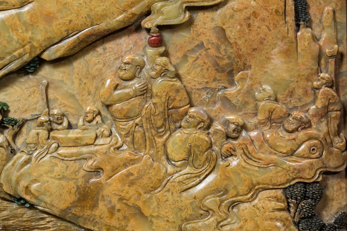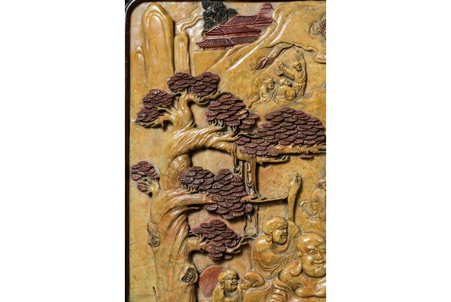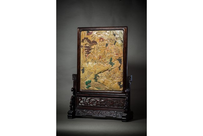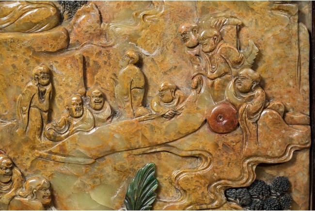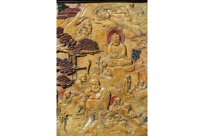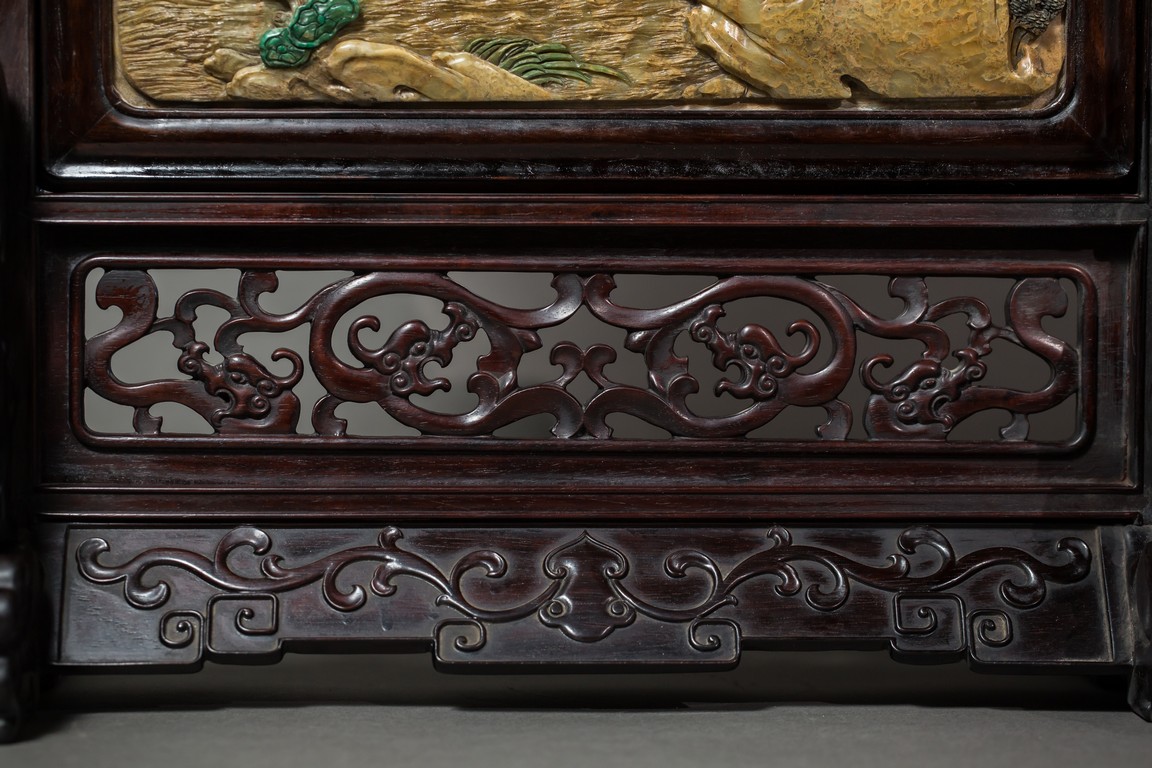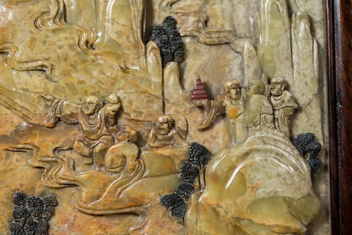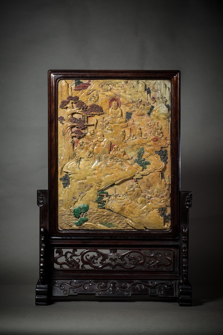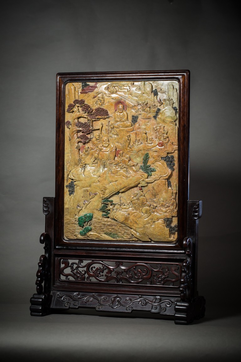 此對插屏不惜用料,體型巨大,質地溫潤細膩,顏色濃鬱飽和。山石嶙峋、蒼松翠柏、亭台深深,老者策杖而行,蒼松之下談笑風生,水面上遊船緩緩駛來,彷若置身仙境,美輪美奐,令人陶醉。另一片淺浮雕描繪佛祖與羅漢說法的畫面,各種各樣奇貌羅漢形象,或形容枯槁、或長眉及膝、或肥頭大耳,有超脫凡俗之禪意。整體刻工細膩生動,刀法深峻圓潤,細膩流暢,佈局景物如畫,質料均佳,包漿潤澤,實為雋品。此對插屏寓意美好,不僅描繪了山中隱居的悠閒,還描繪了對佛學的虔誠。配有原配紅木框子及座子,成對保存完好,實為不可多得的佳品。
