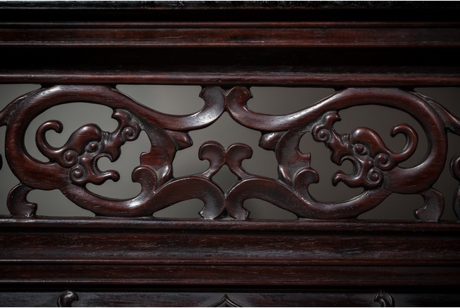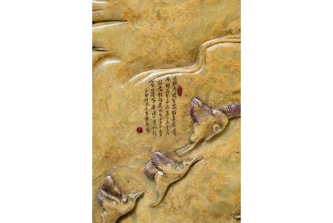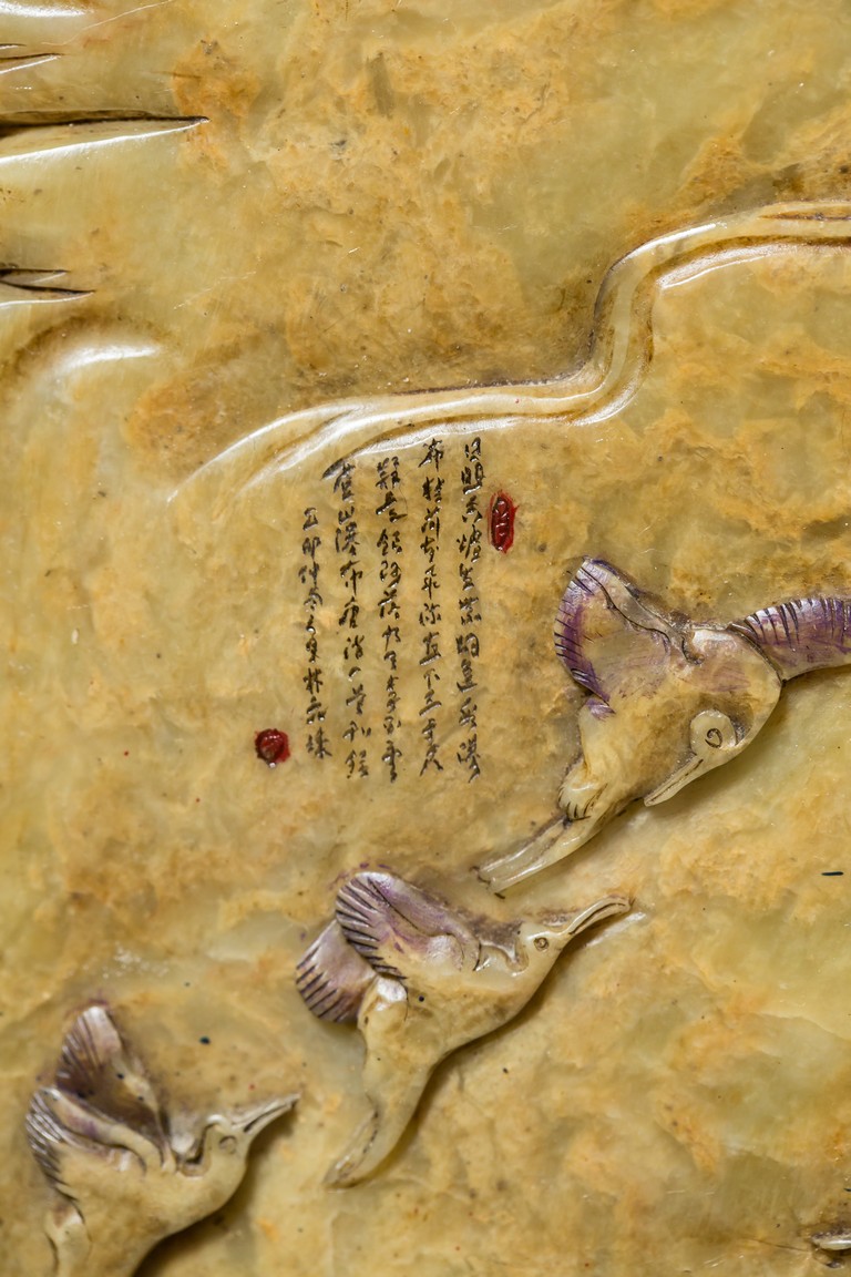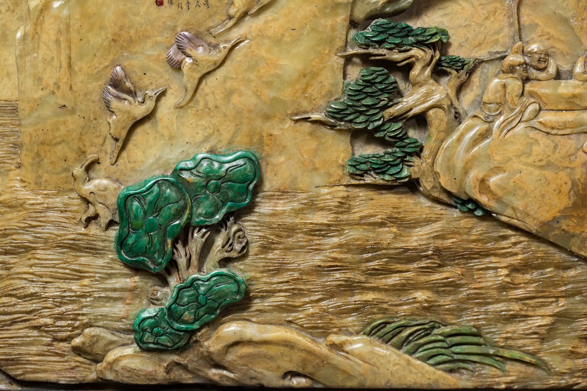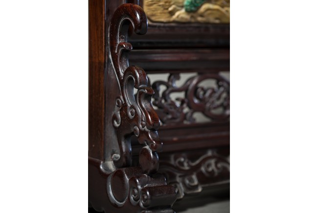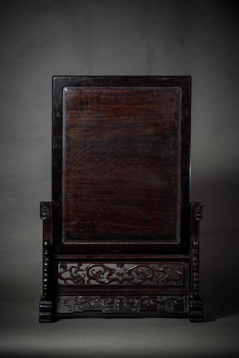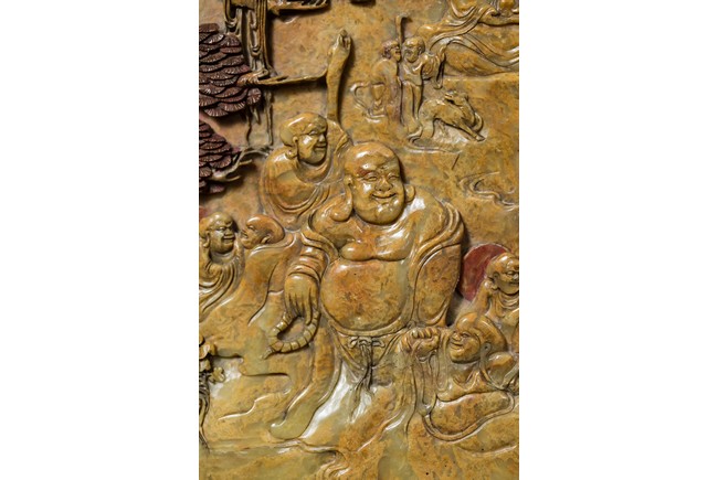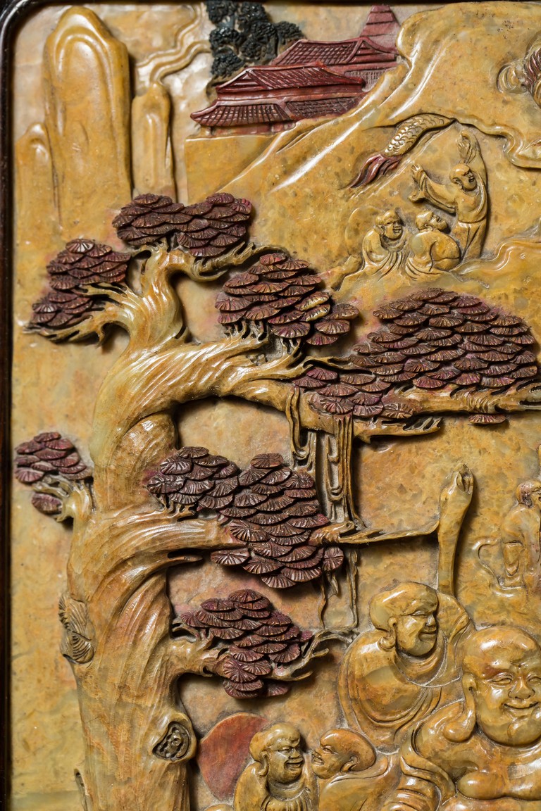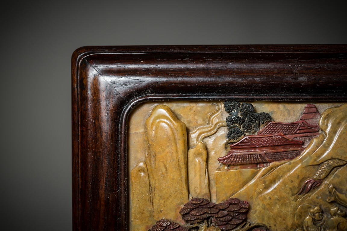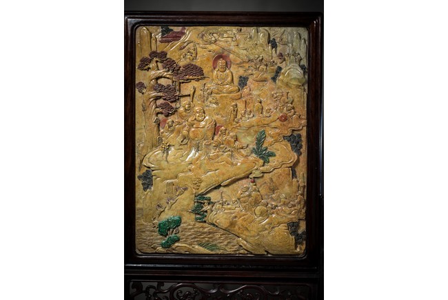 此對插屏不惜用料,體型巨大,質地溫潤細膩,顏色濃鬱飽和。山石嶙峋、蒼松翠柏、亭台深深,老者策杖而行,蒼松之下談笑風生,水面上遊船緩緩駛來,彷若置身仙境,美輪美奐,令人陶醉。另一片淺浮雕描繪佛祖與羅漢說法的畫面,各種各樣奇貌羅漢形象,或形容枯槁、或長眉及膝、或肥頭大耳,有超脫凡俗之禪意。整體刻工細膩生動,刀法深峻圓潤,細膩流暢,佈局景物如畫,質料均佳,包漿潤澤,實為雋品。此對插屏寓意美好,不僅描繪了山中隱居的悠閒,還描繪了對佛學的虔誠。配有原配紅木框子及座子,成對保存完好,實為不可多得的佳品。