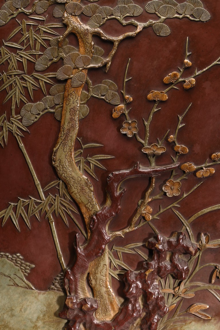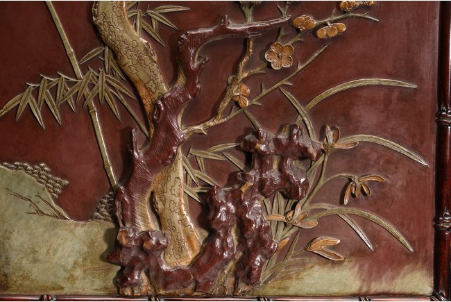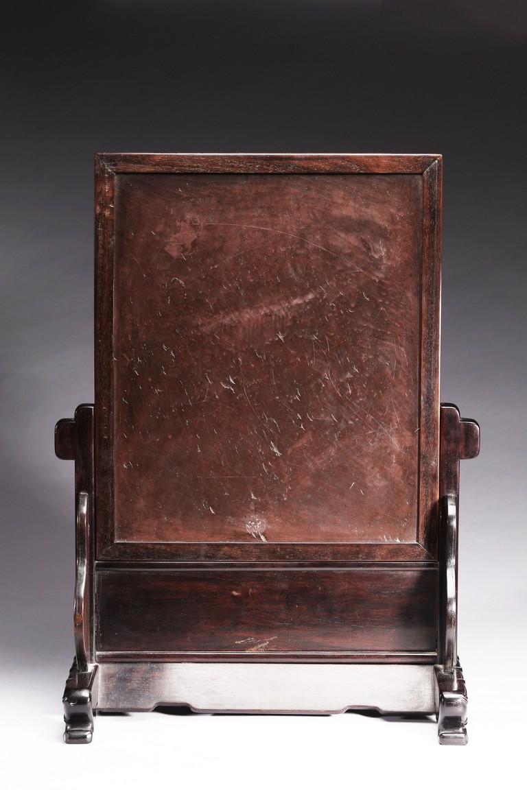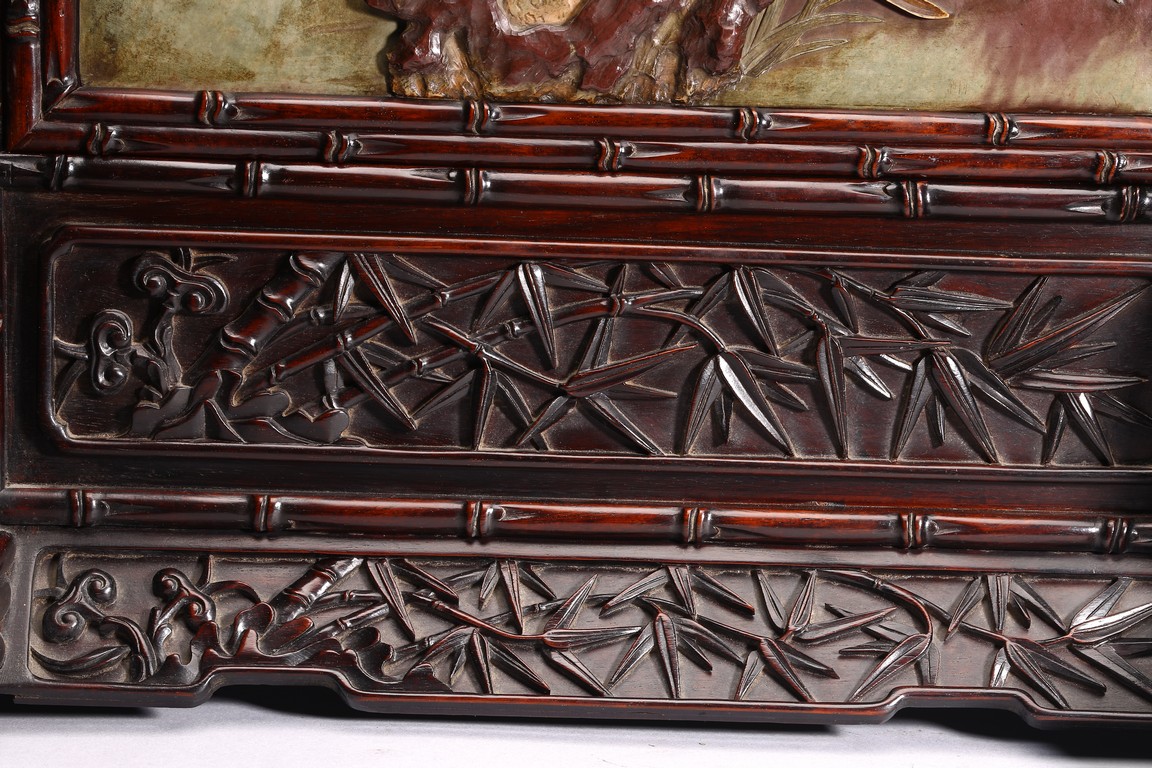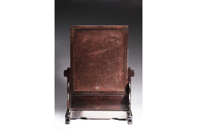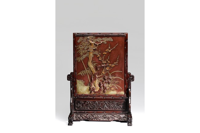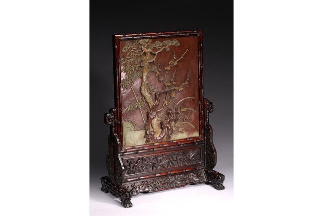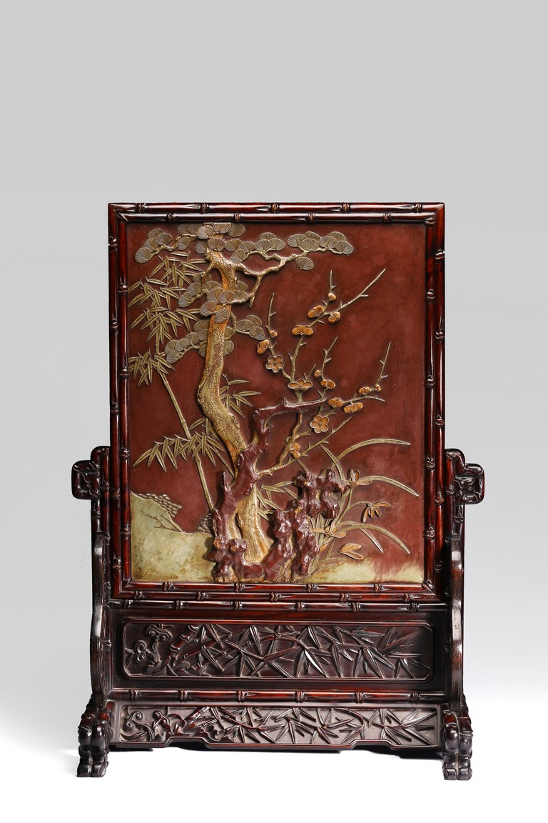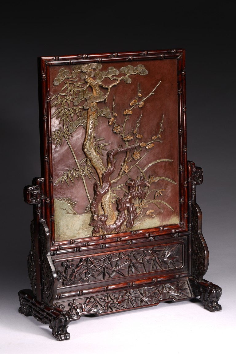 The screen is of rectangular shape and carved in high relief depicting bamboo, chrysanthemum, pines, and orchids branches all issuing from rocks. The stone is of three colors, consisting of dark red, light green and sand yellow color. The stone is set into a bamboo trunk shaped and decorated rosewood stand with scrolling supports. Mid-Qing Dynasty period.