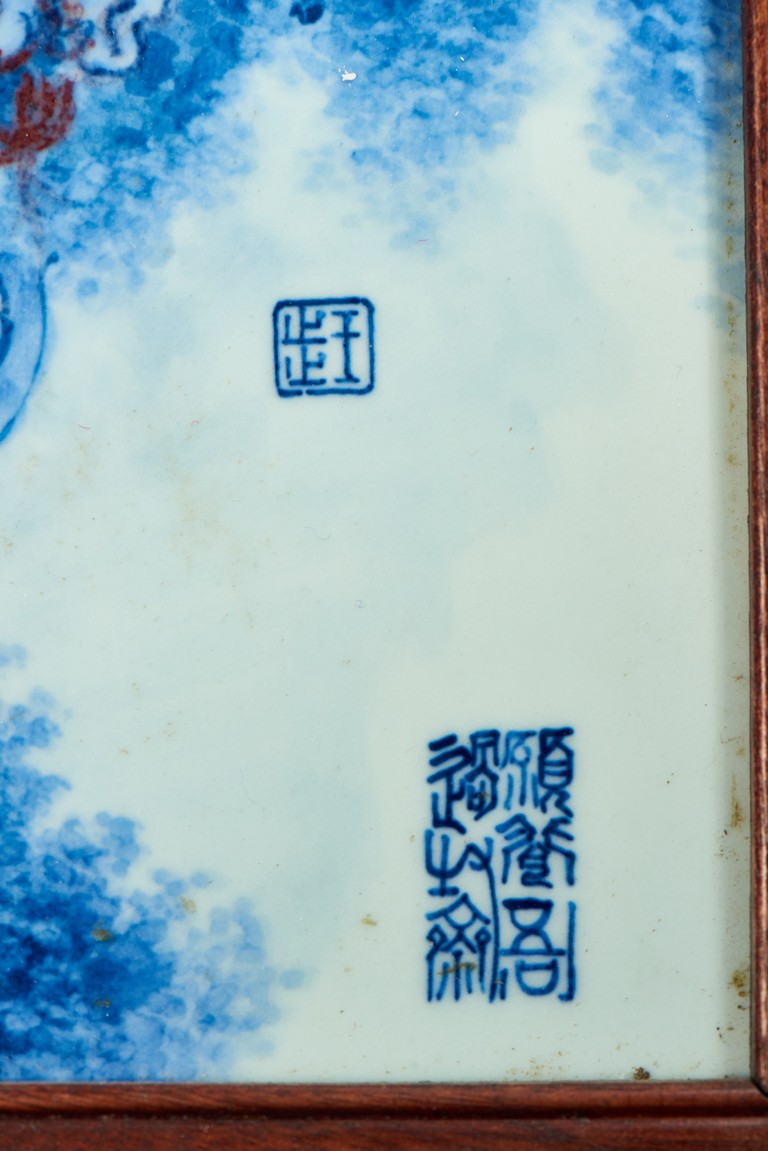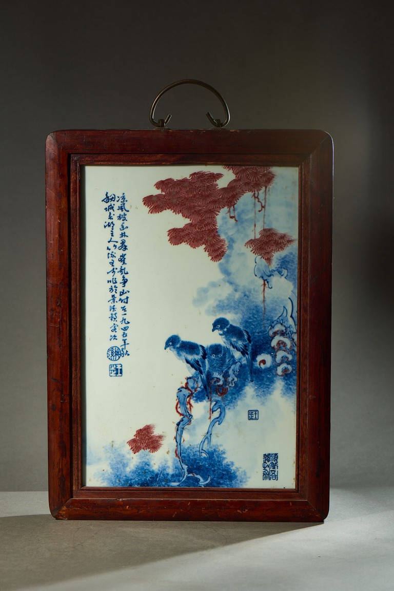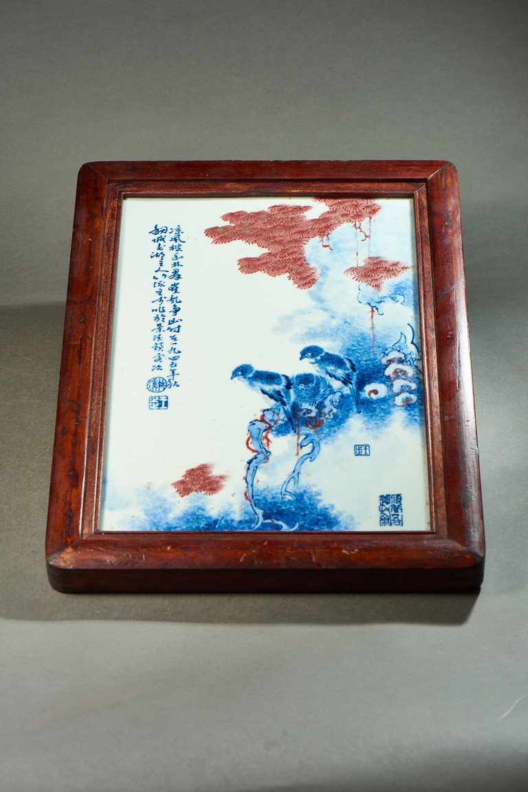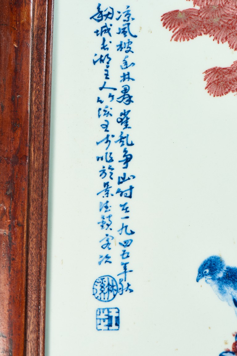Of vertical rectangular form, finely painted in blue and white and underglaze red to depict three birds perching on tree branch, with inscriptions and signed Wang Bu to the left with four painted seal marks, all within hardwood frame. Republic period.
