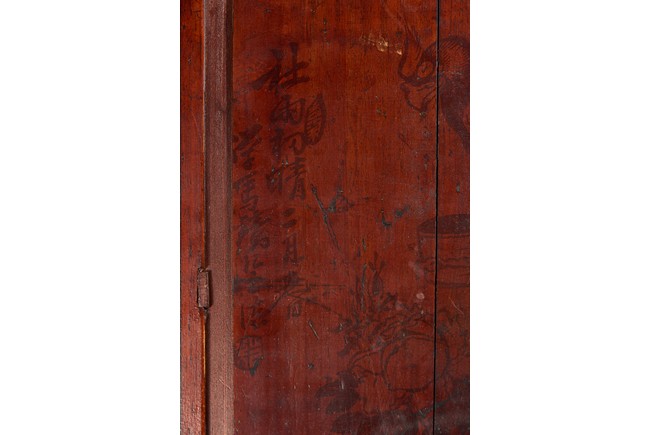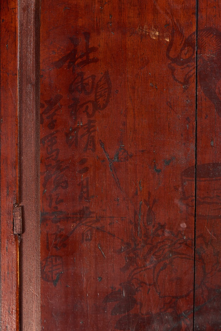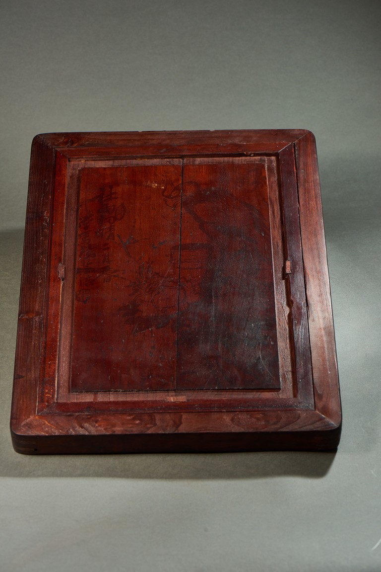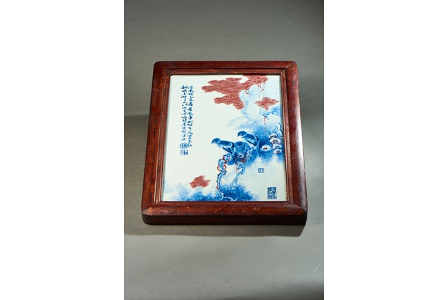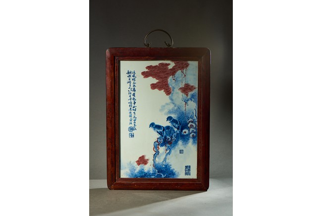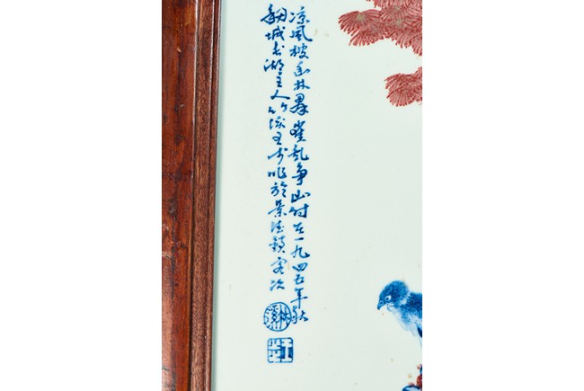 Of vertical rectangular form, finely painted in blue and white and underglaze red to depict three birds perching on tree branch, with inscriptions and signed Wang Bu to the left with four painted seal marks, all within hardwood frame. Republic period.