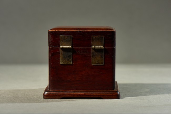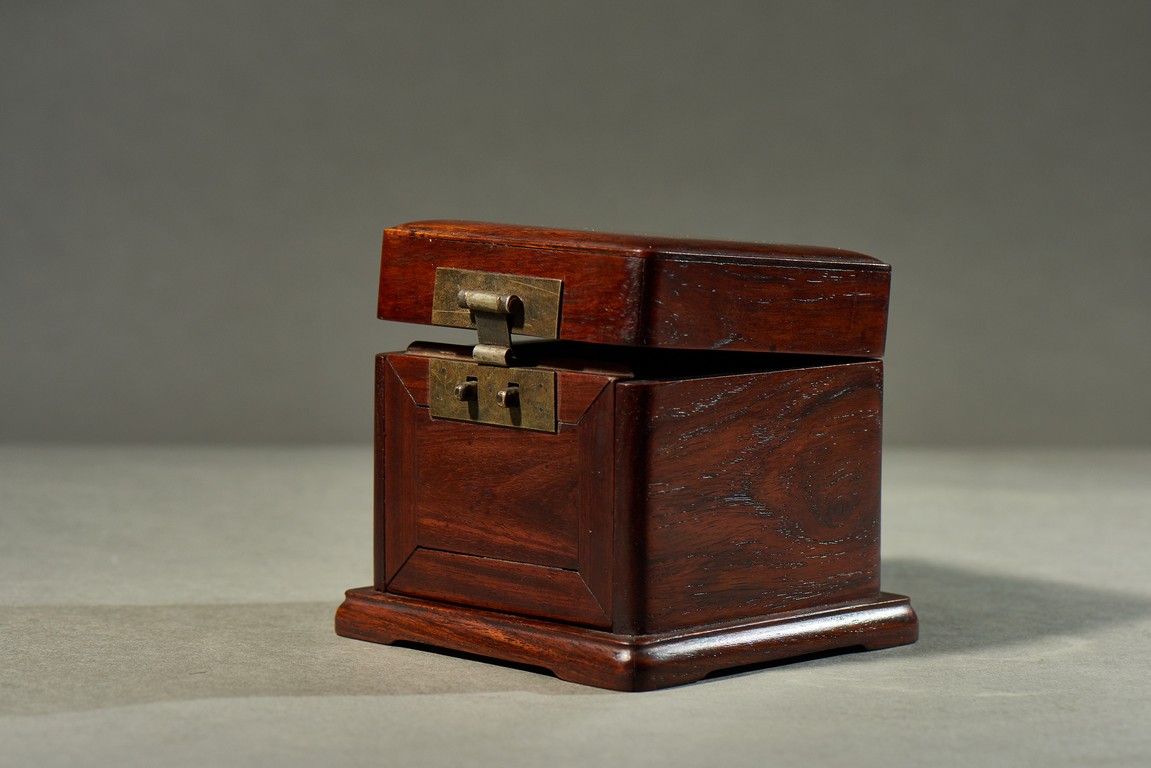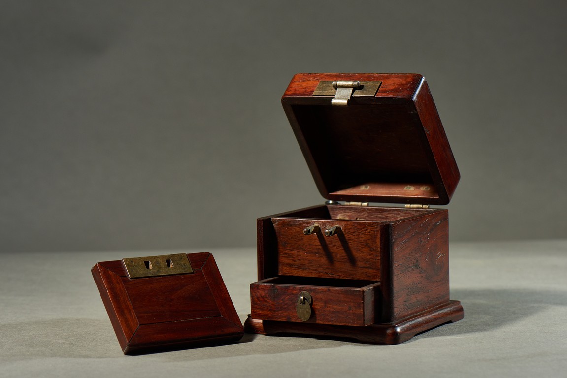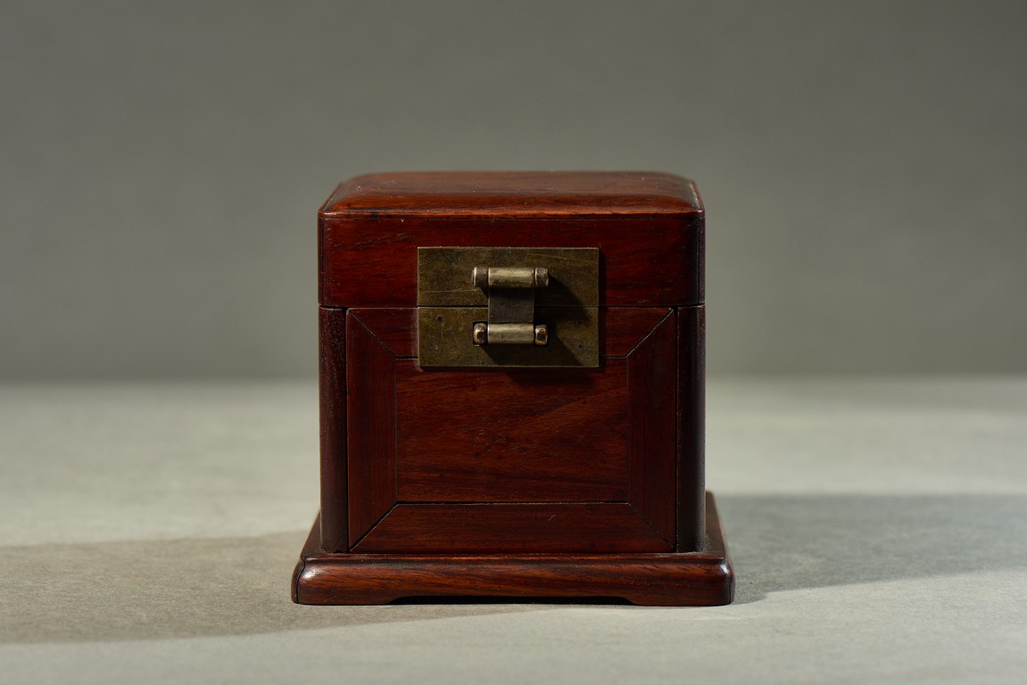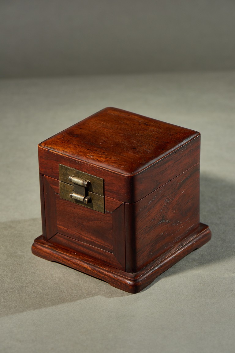 The box and cover similarly constructed with straight sides, the front with square two-part lock plate, the interior housing a removable tray. Qing Dynasty period.
