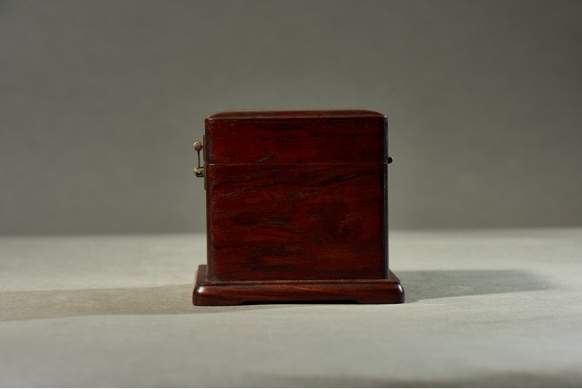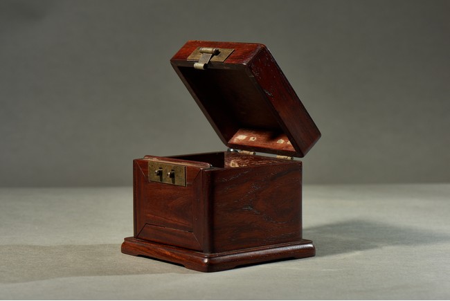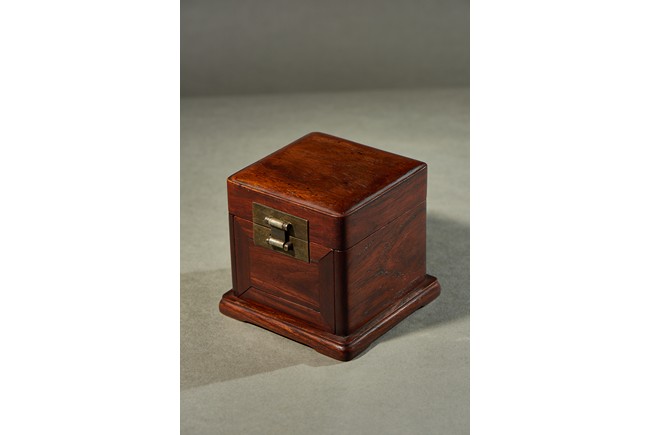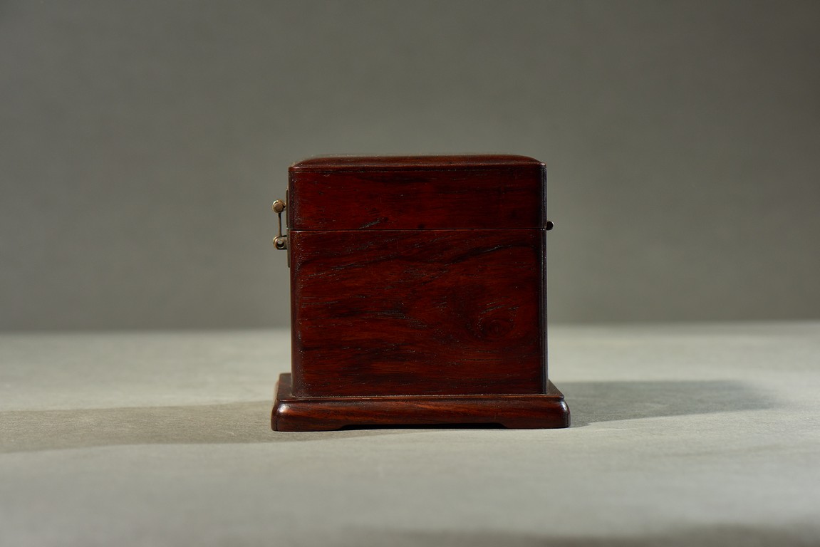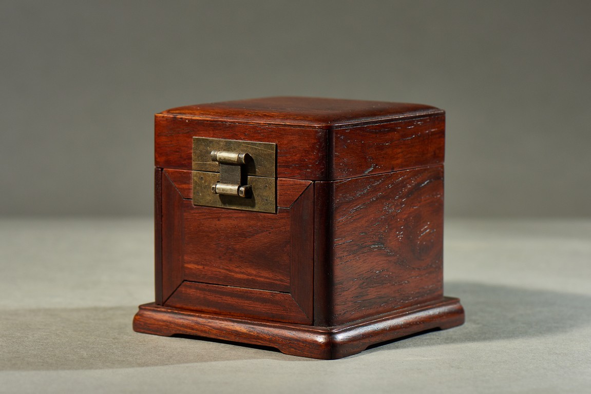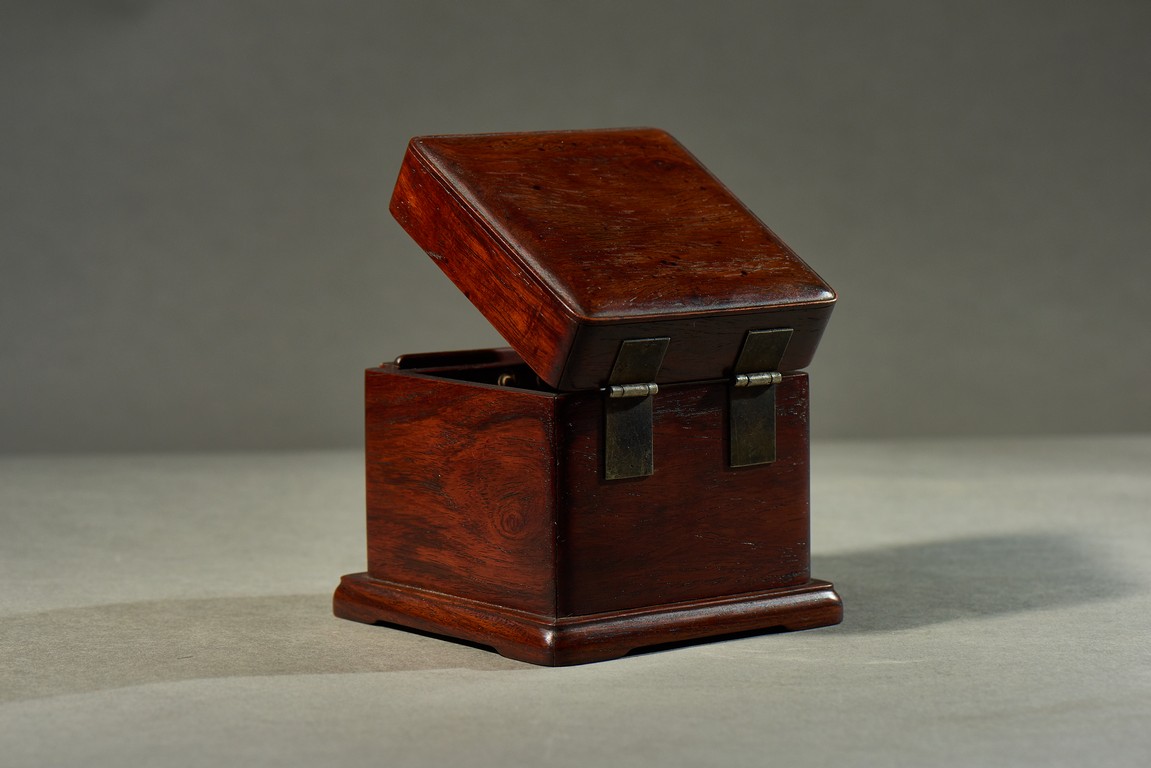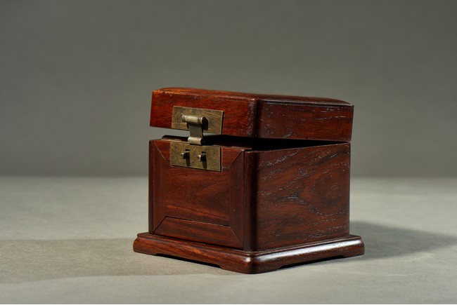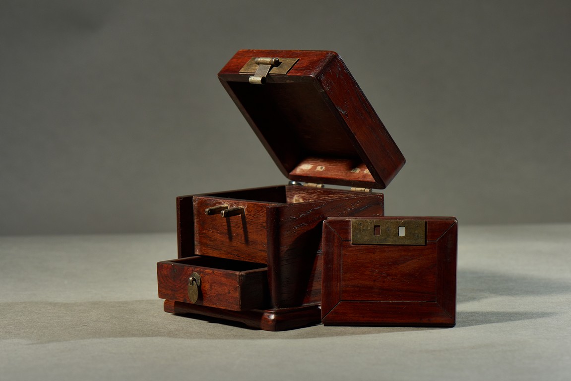 The box and cover similarly constructed with straight sides, the front with square two-part lock plate, the interior housing a removable tray. Qing Dynasty period.
