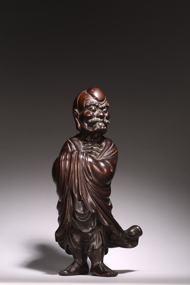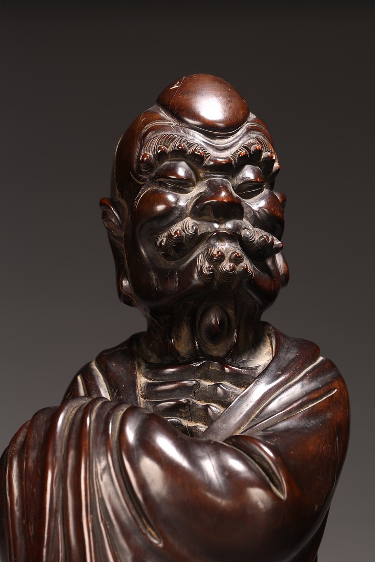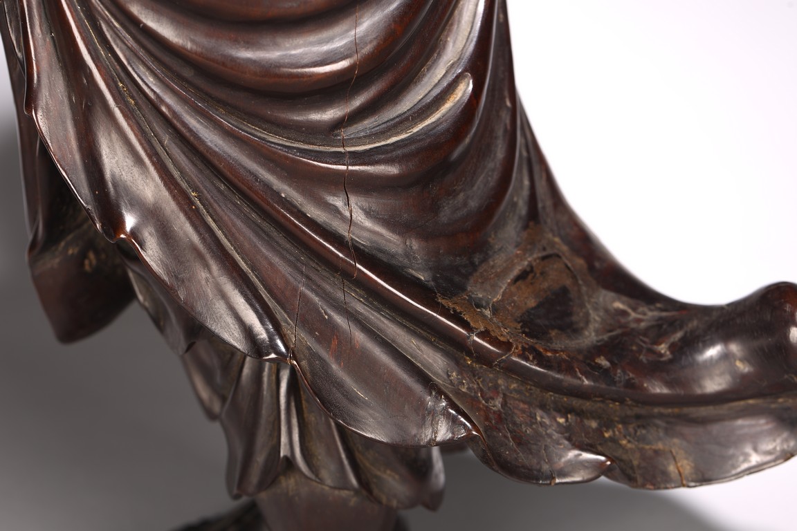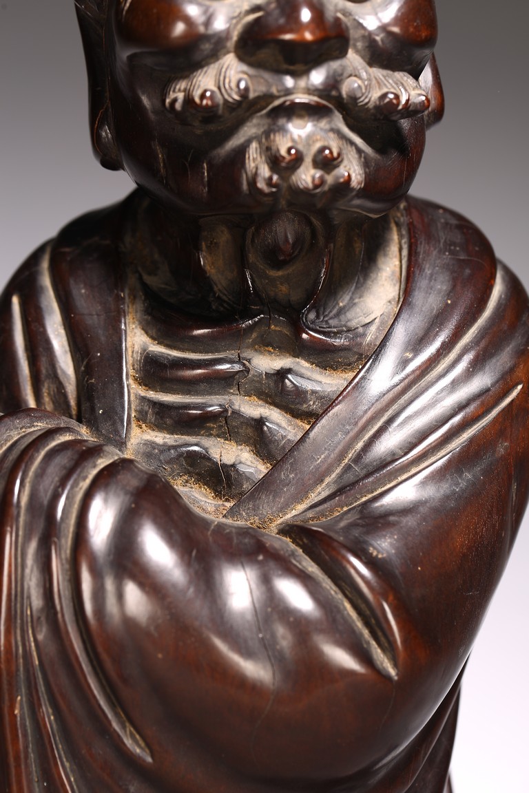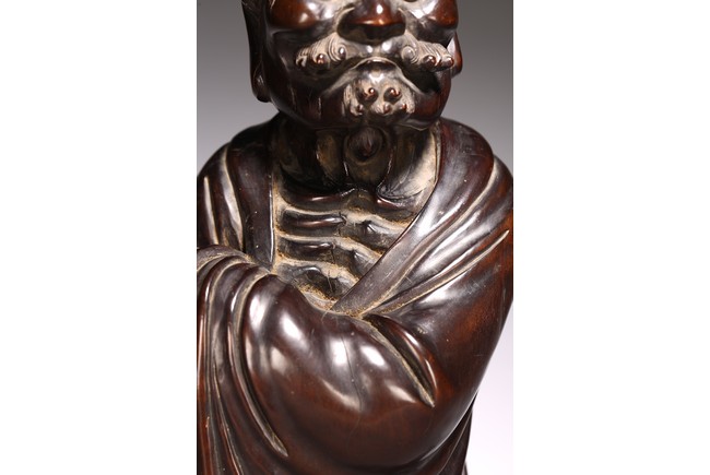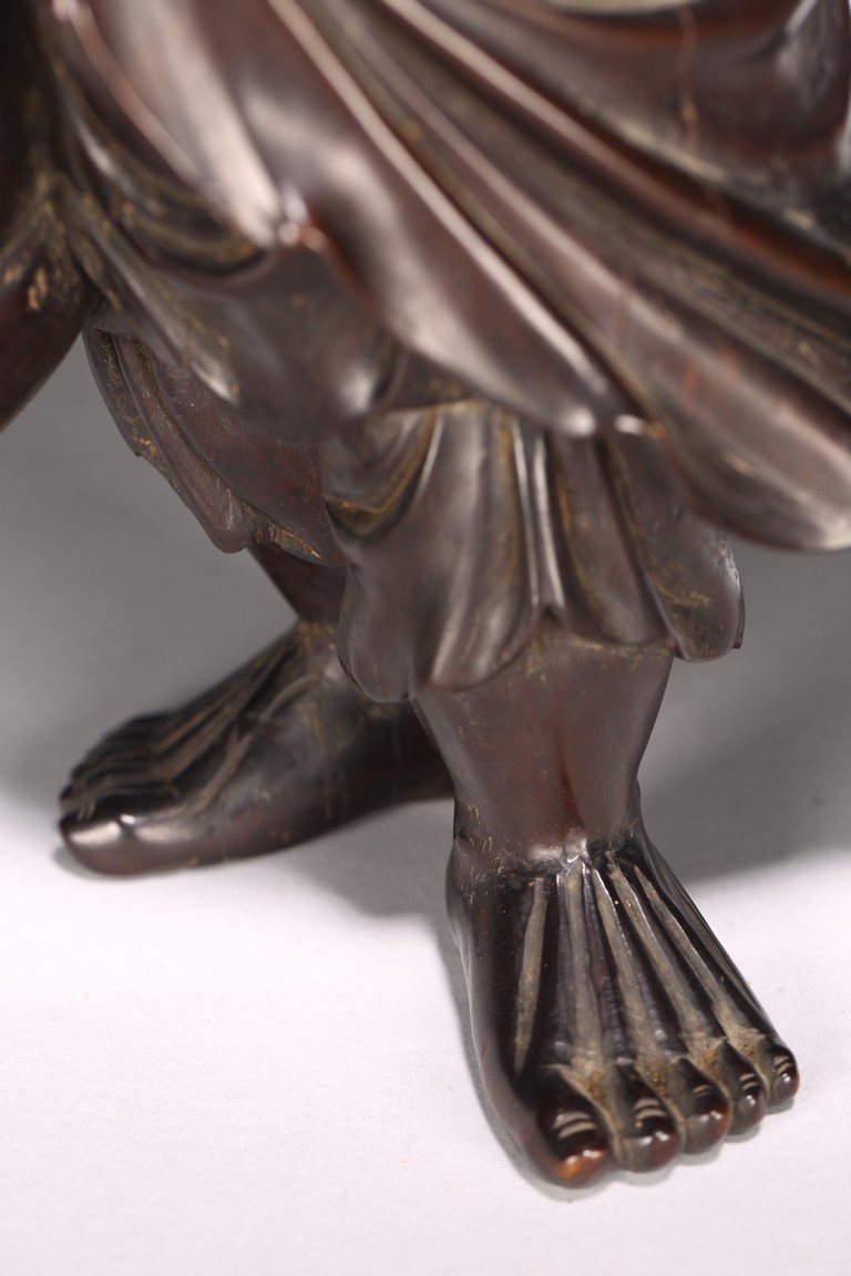 Chinese. The deity standing barefoot, his hands held within the long sleeves of his flowing garment opening at his chest, the face framed by facial hair arranged in curls. Qing Dynasty period.