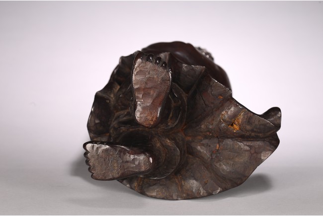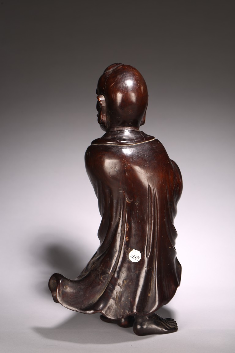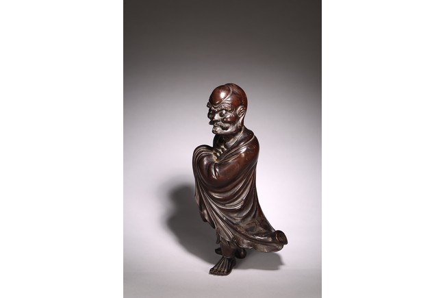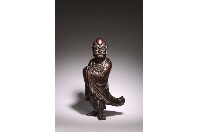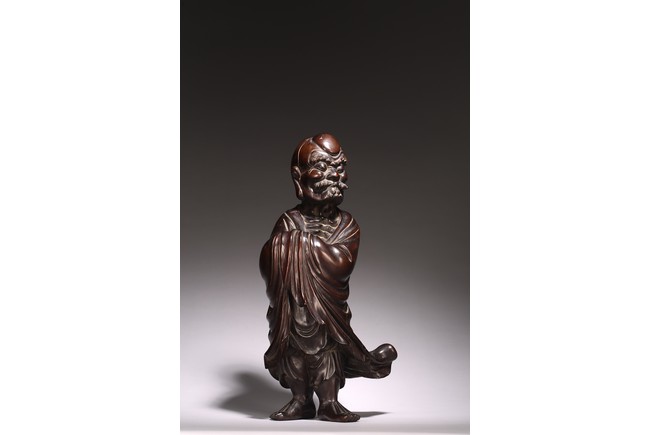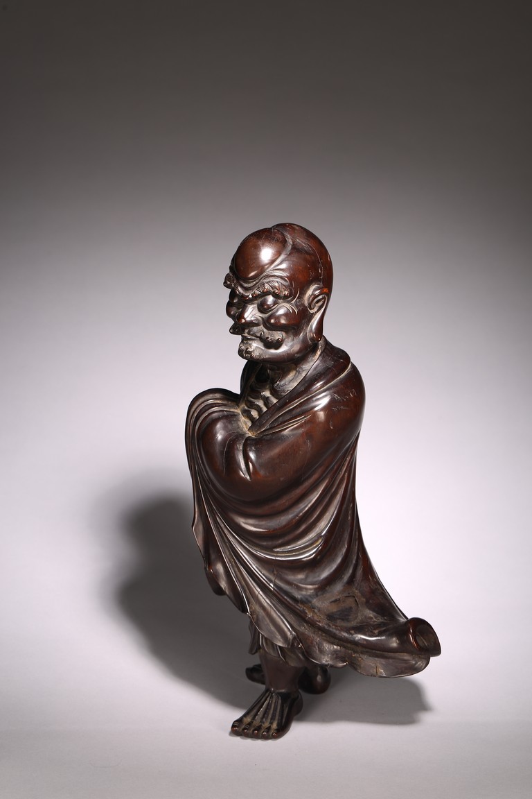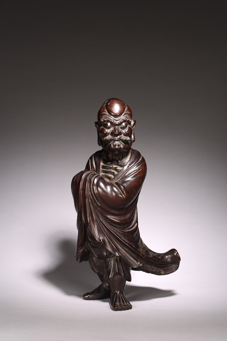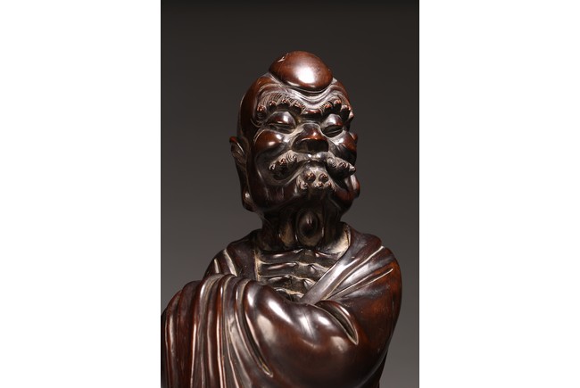 Chinese. The deity standing barefoot, his hands held within the long sleeves of his flowing garment opening at his chest, the face framed by facial hair arranged in curls. Qing Dynasty period.
