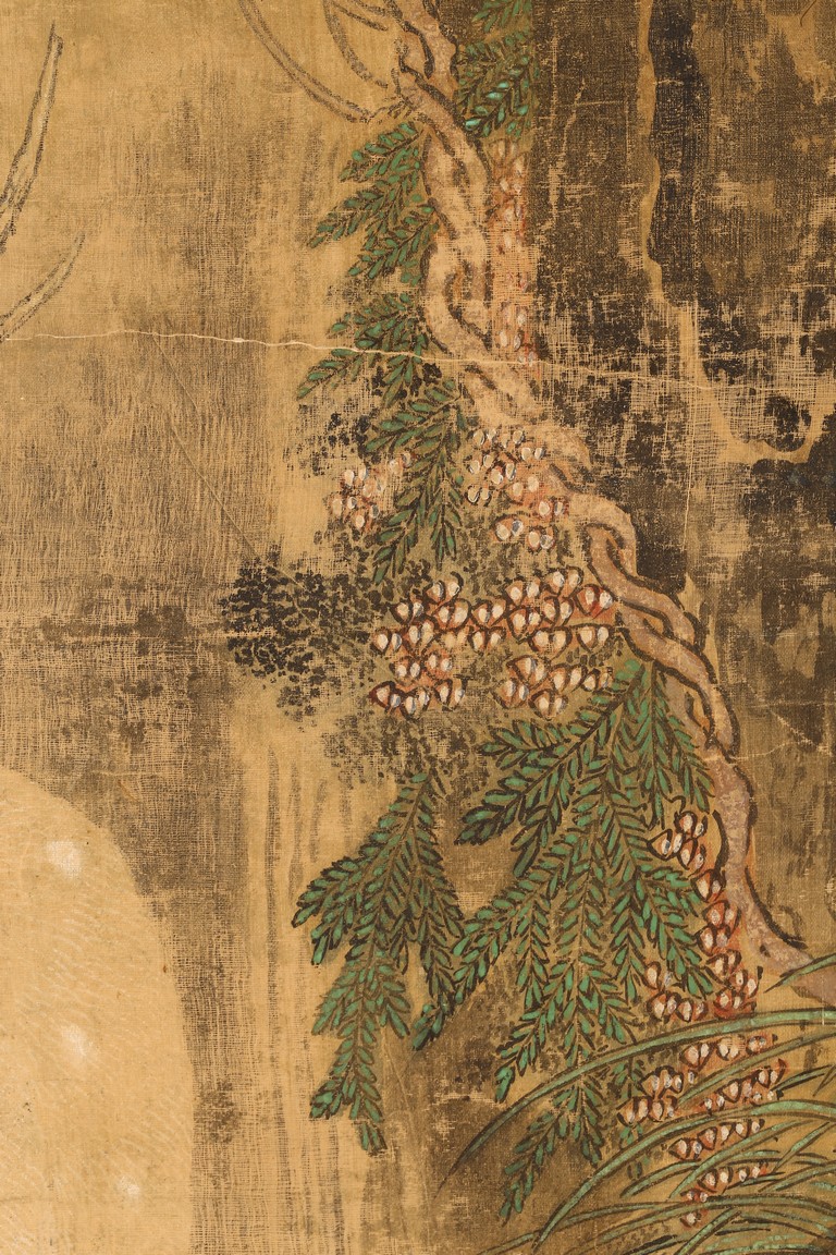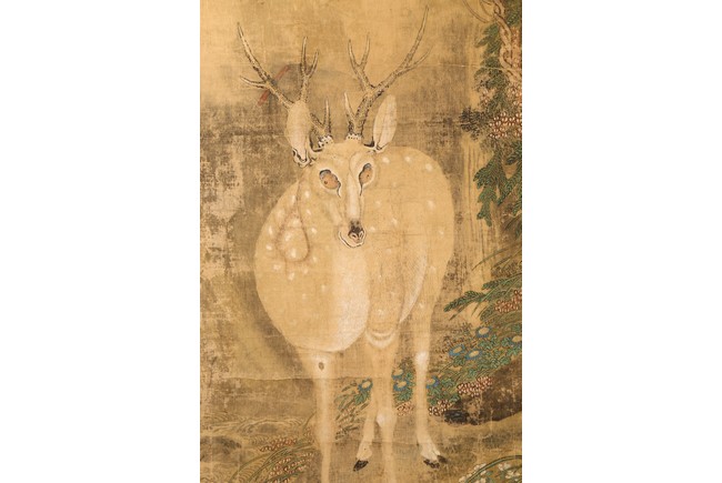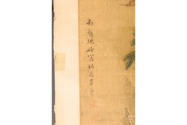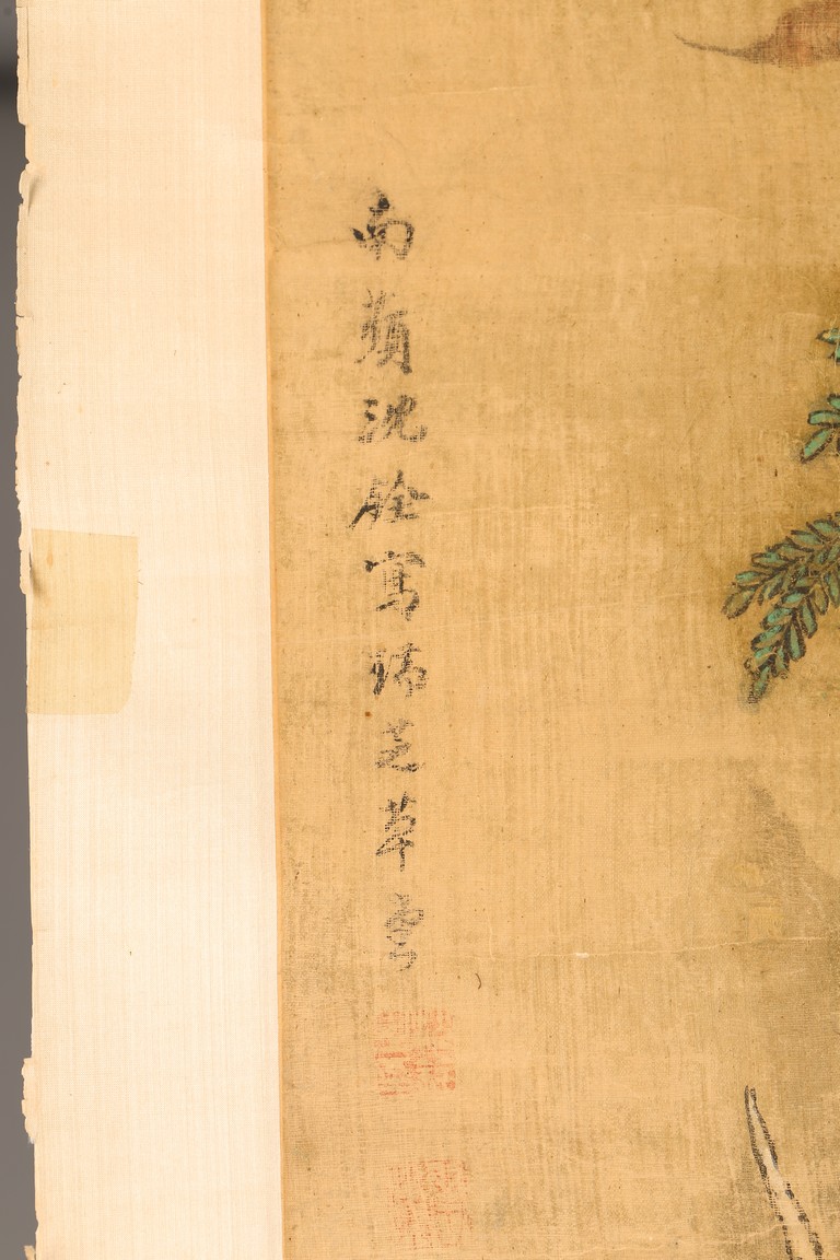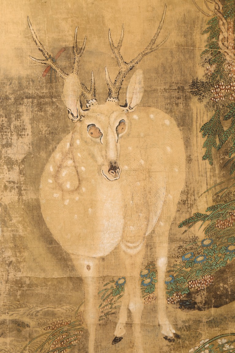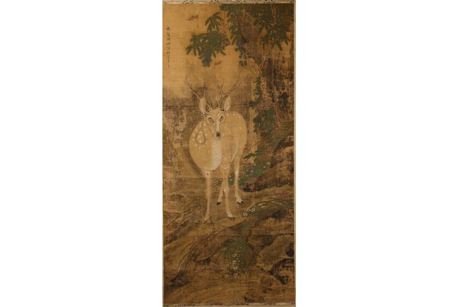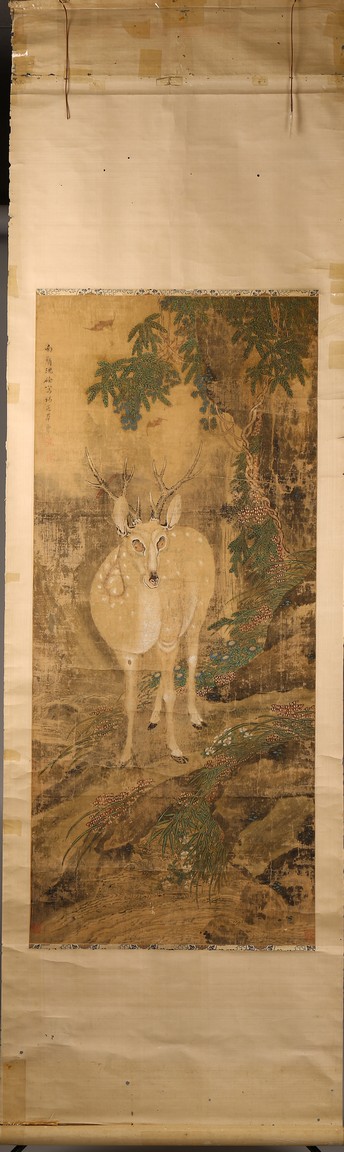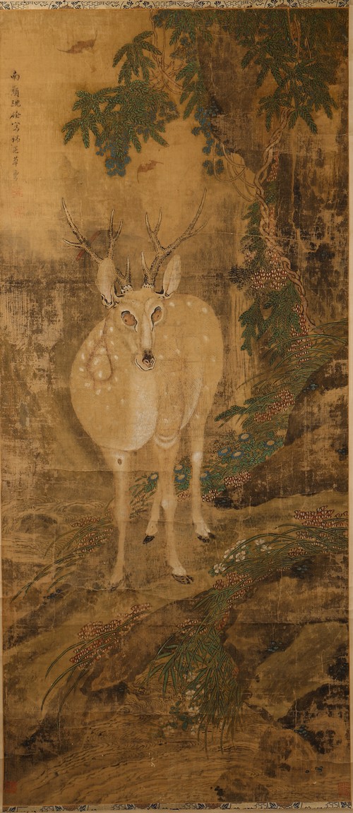 Chinese. Color and ink on silk. Deer and bats. Hanging scroll. Inscribed and signed Shen Quan, with four seal marks of the artist.
