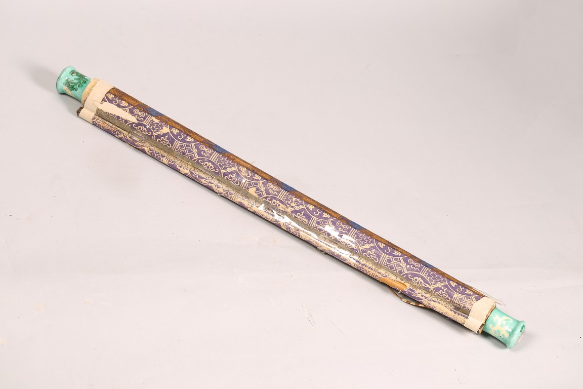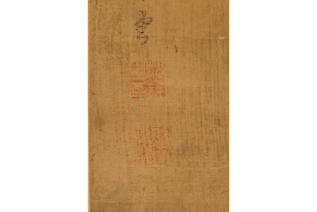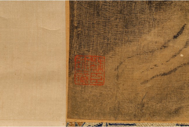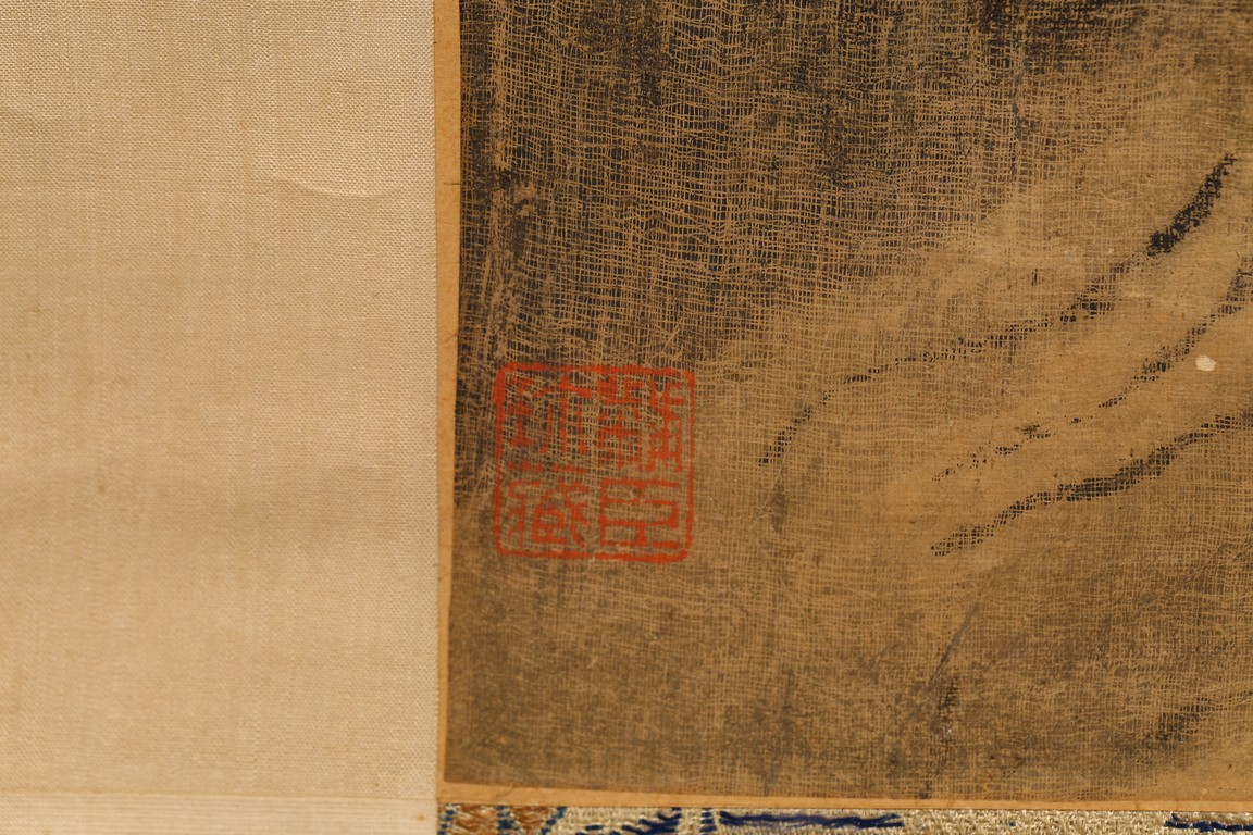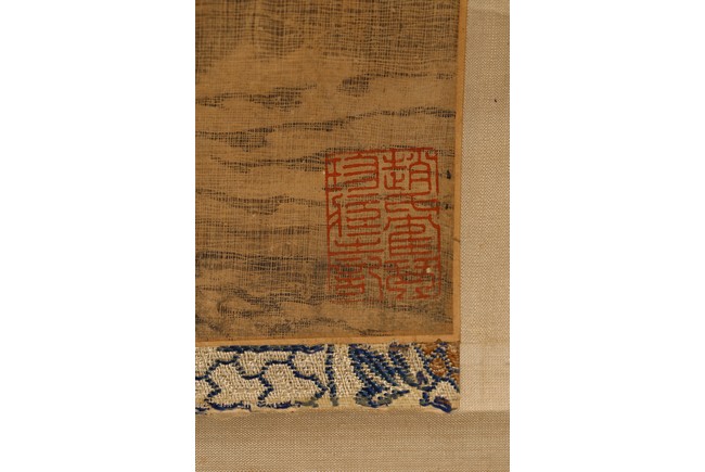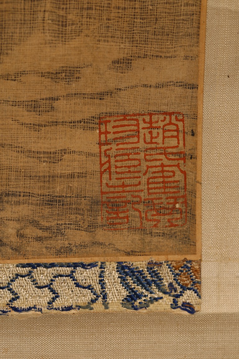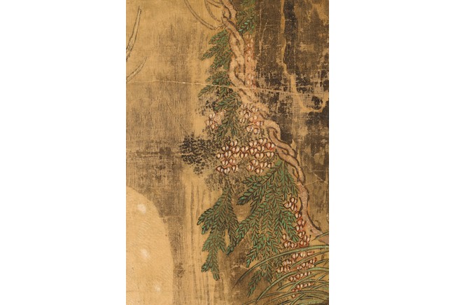 Chinese. Color and ink on silk. Deer and bats. Hanging scroll. Inscribed and signed Shen Quan, with four seal marks of the artist.