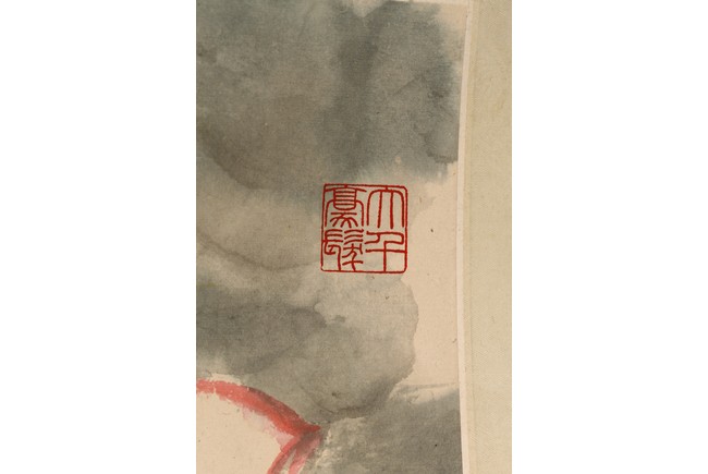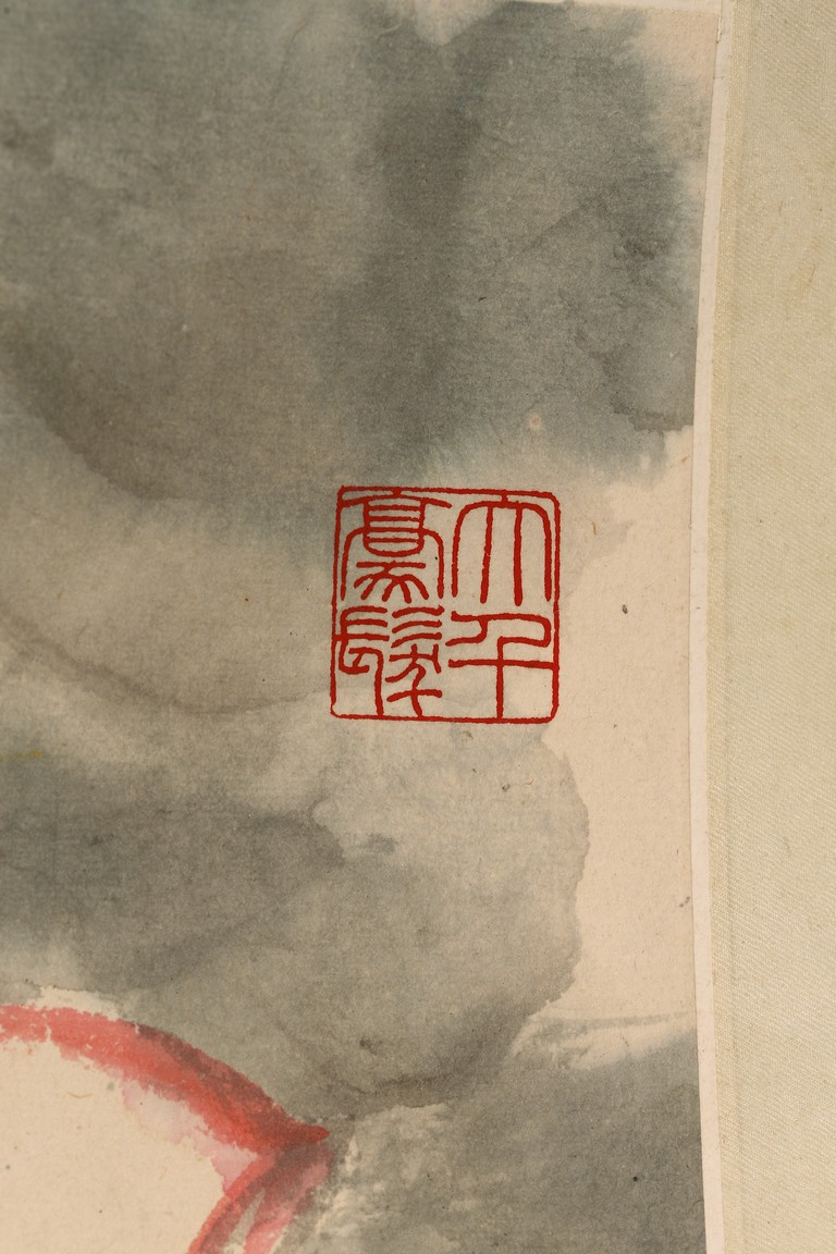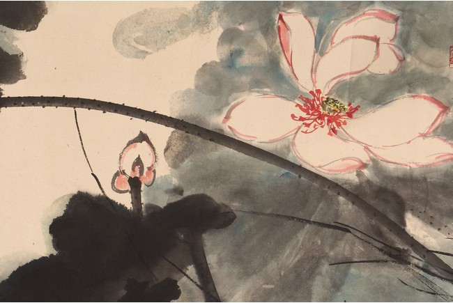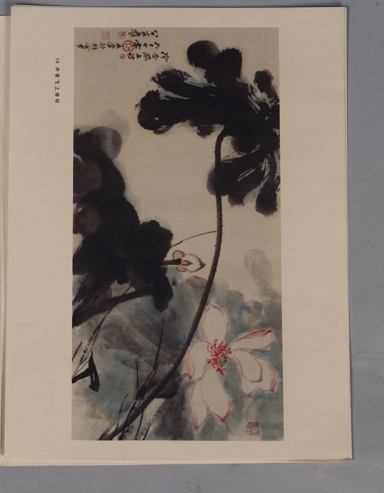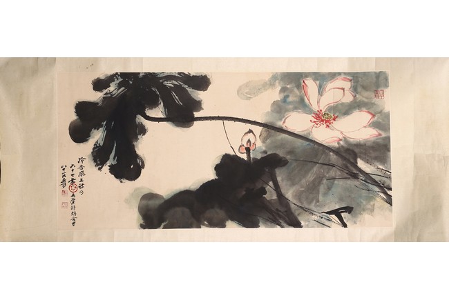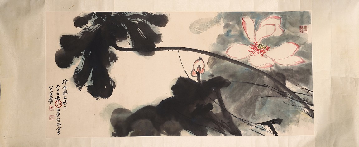 Zhang Daqian (1899-1983). Chinese. Color and ink on paper. Lotus. Mounted on paper. Inscribed and signed Yuan, with four seal marks of the artist. Dated to summer of 1978.