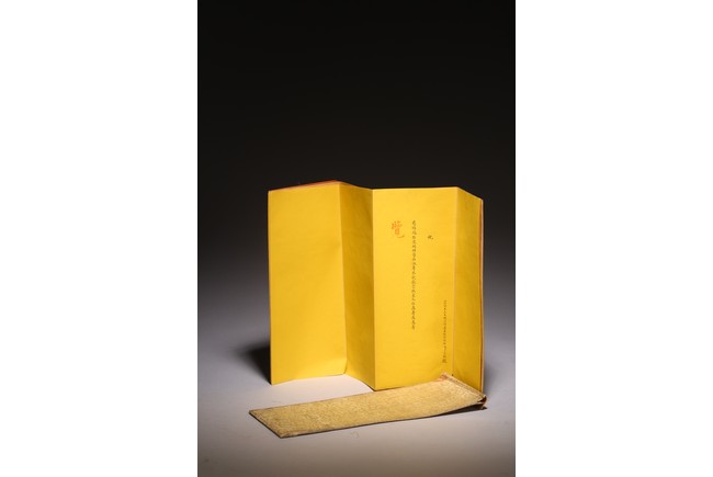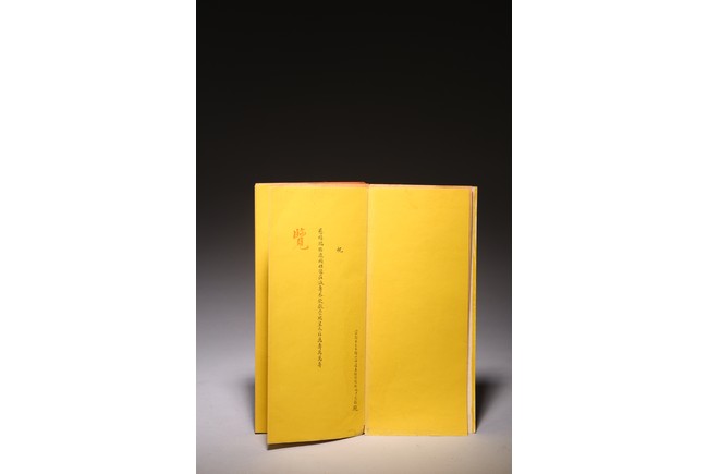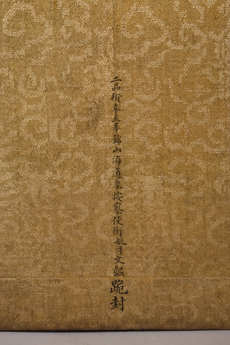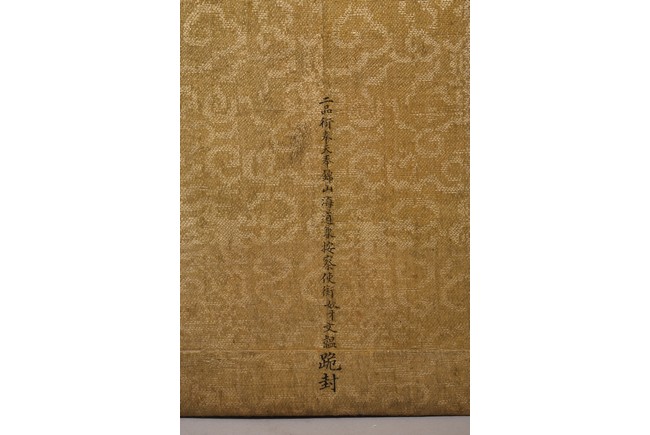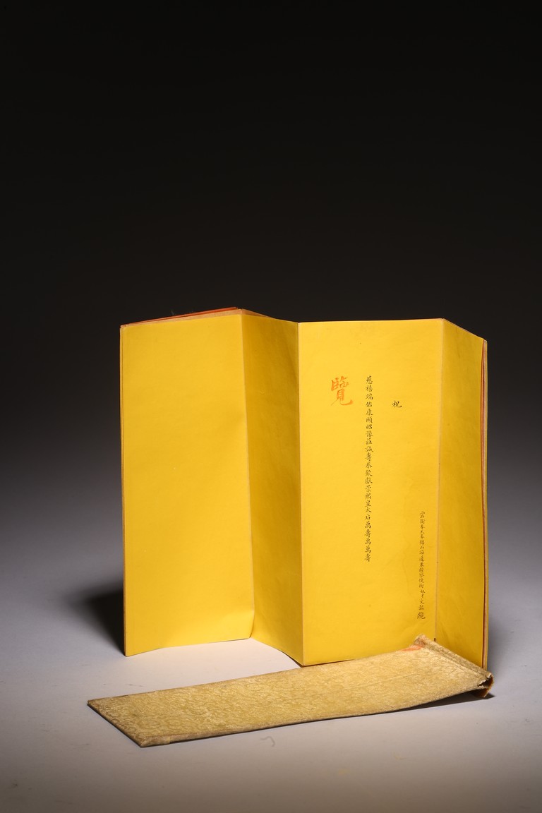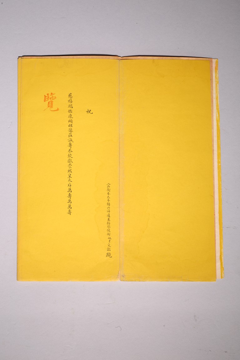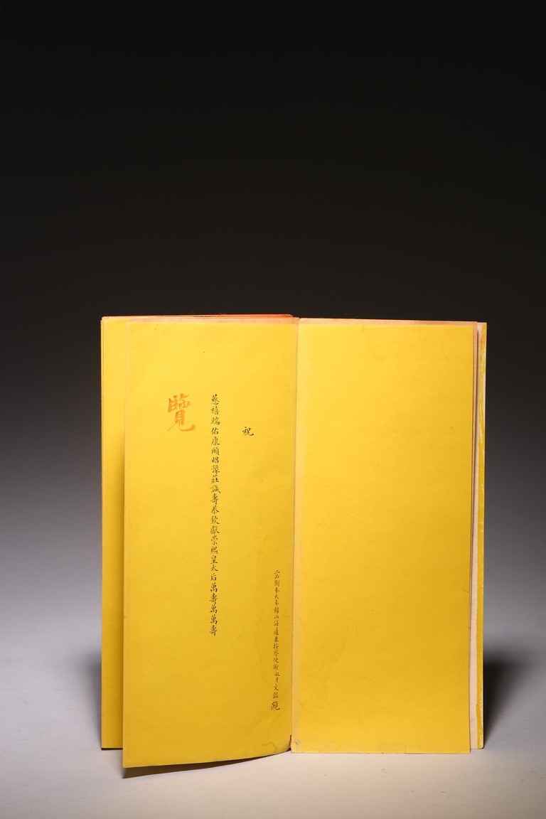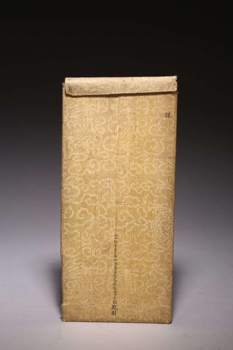 Ink on paper. Memorial to Empress Dowager in celebration of her majesty's birthday from second class official Wen Yun, with the original envelope. Late Qing Dynasty period.