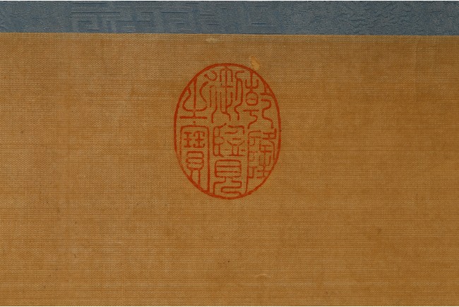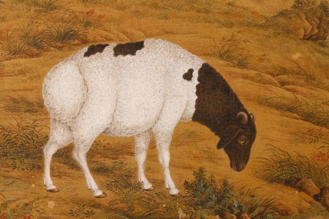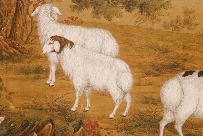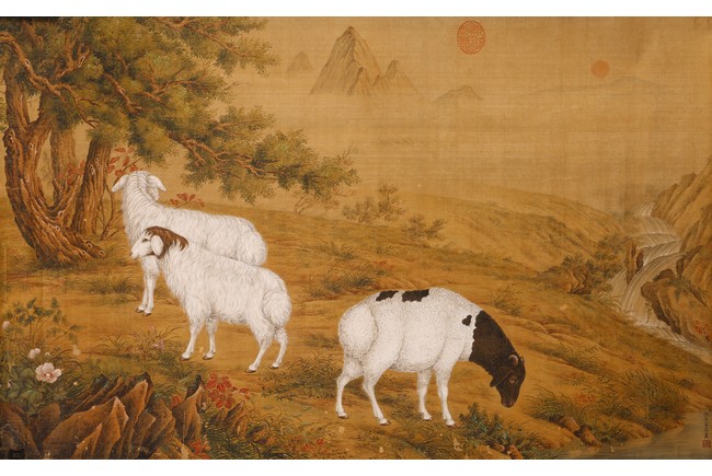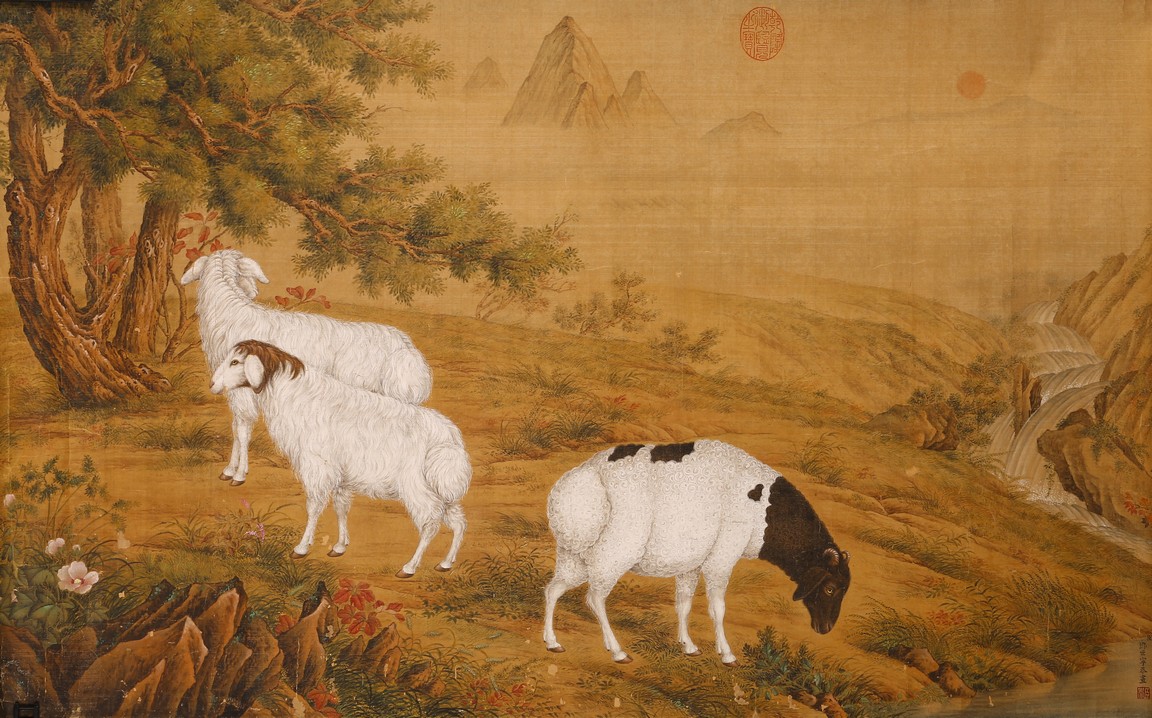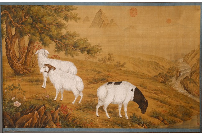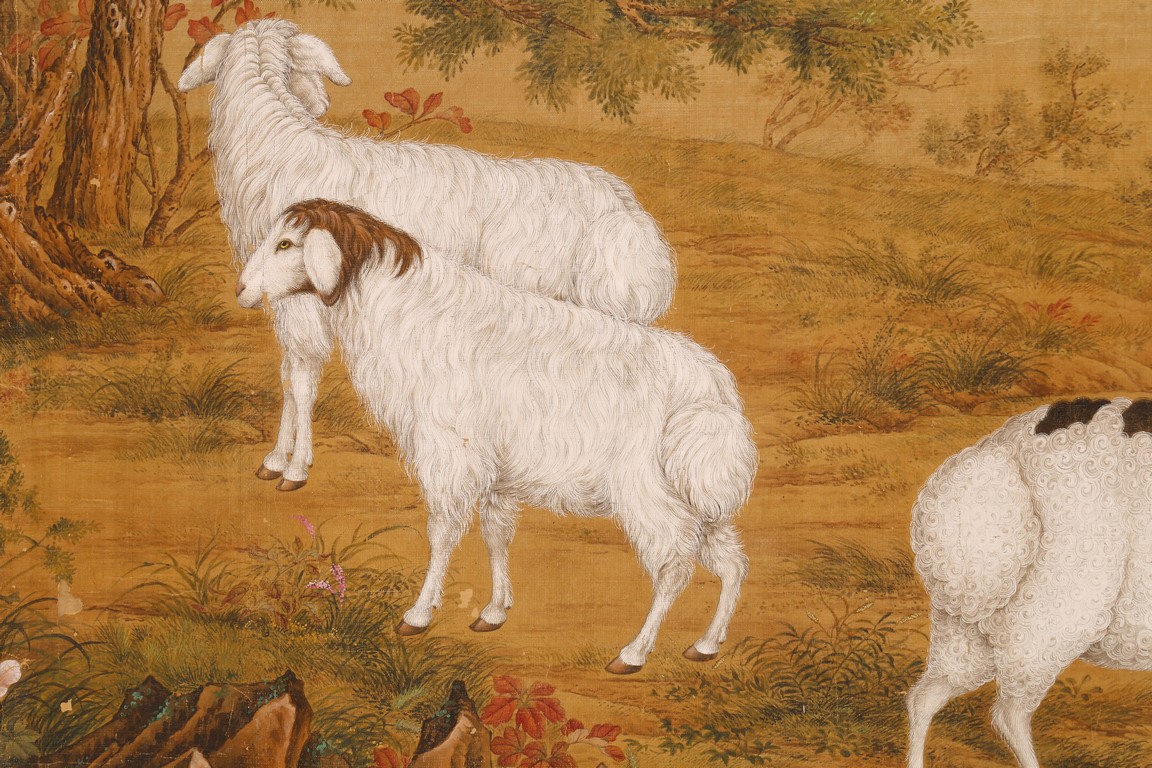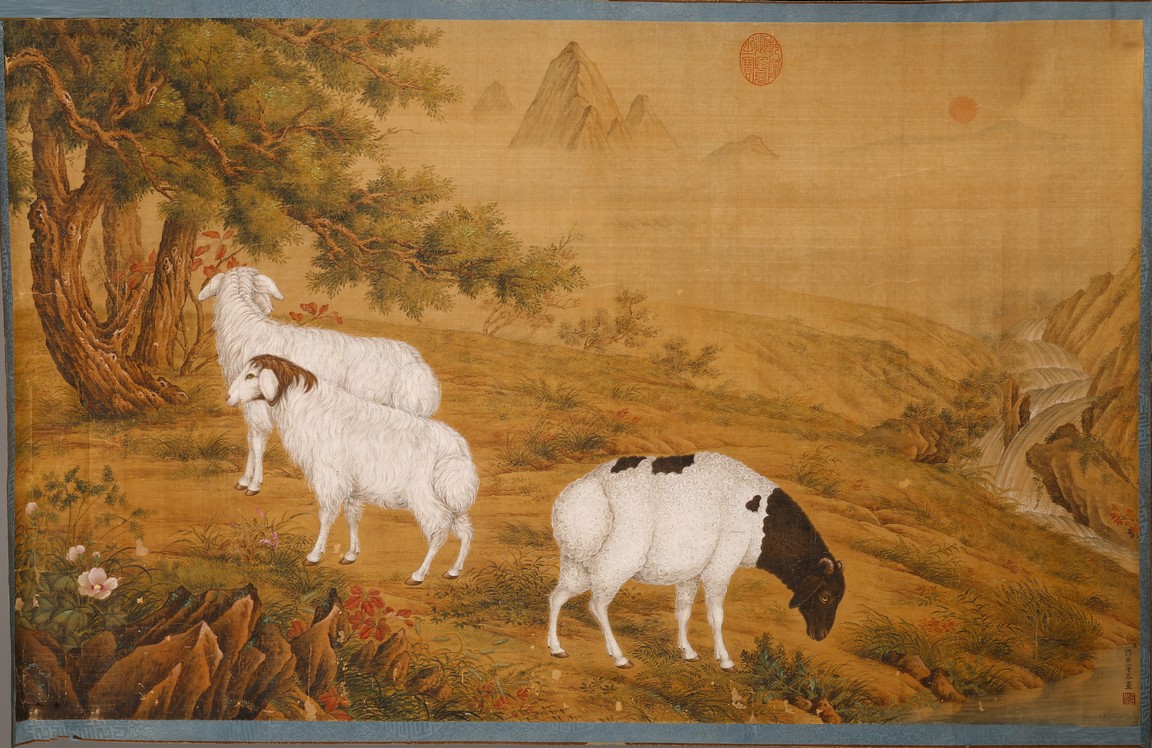 Chinese. Color and ink on silk. Three Rams under the Sun. Mounted on paper. Signed Lang Shining with one seal mark, and with one seal mark by the Emperor Qianlong, attributed to Giuseppe Castiglione.