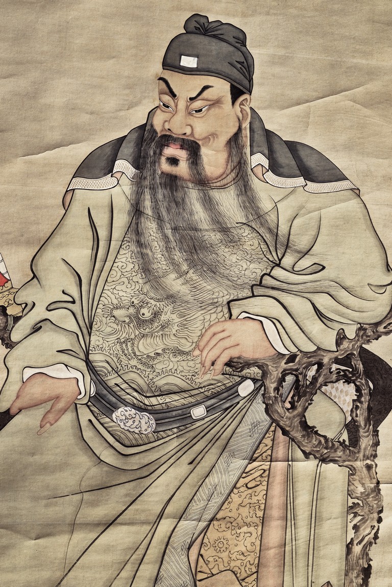 Chinese. Ink and color on paper. Hanging scroll. With depiction of Guan Yu seated on wood chair, with long beard and stern expression. Anonymous. Qing Dynasty period.