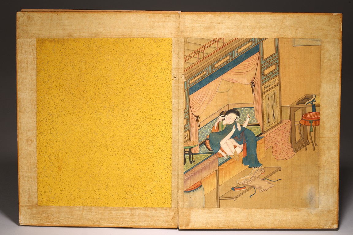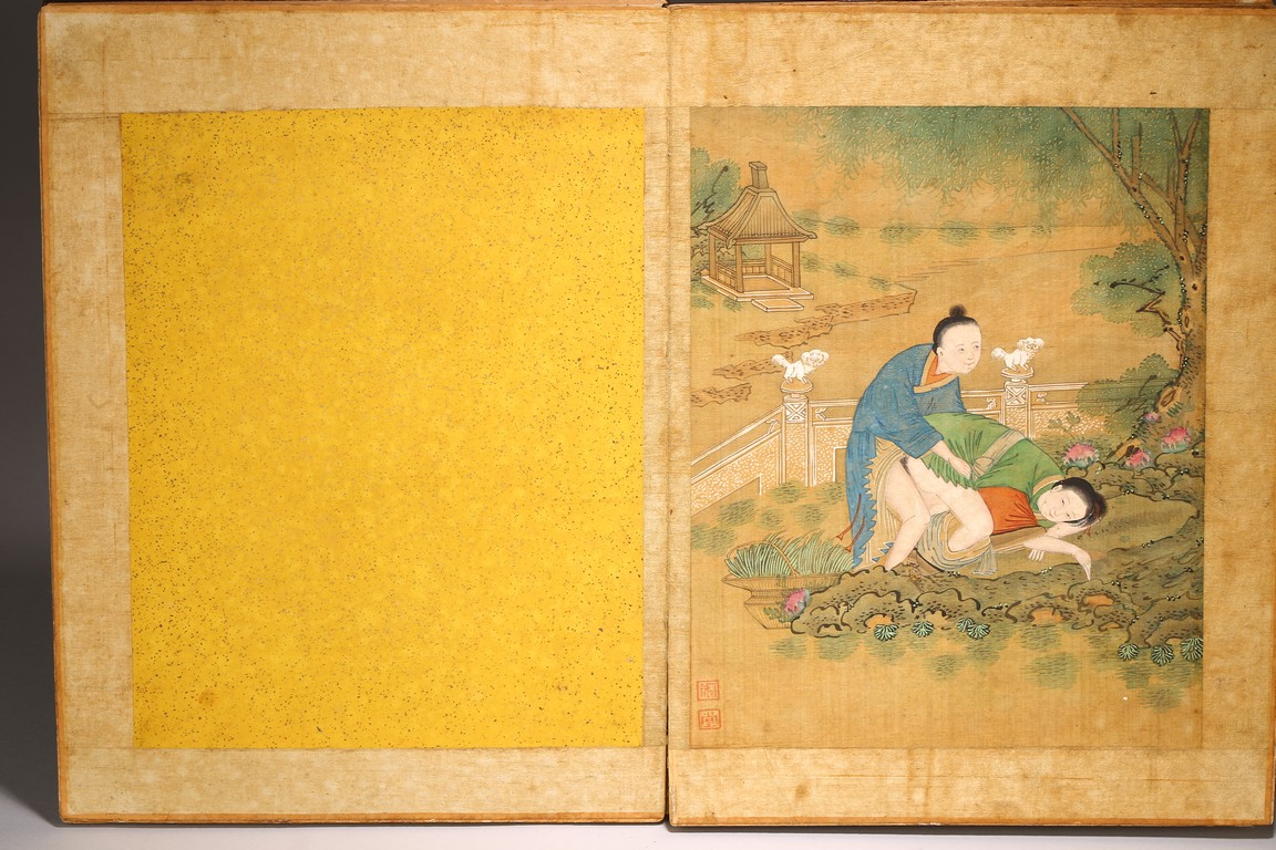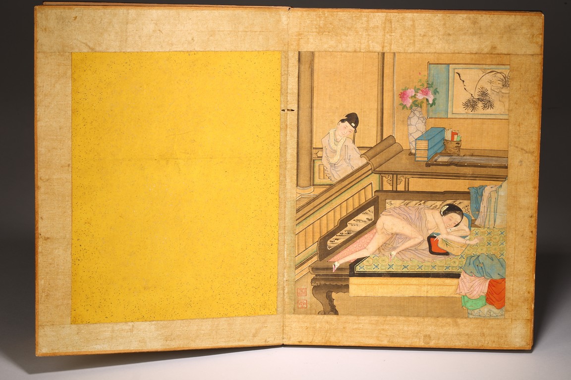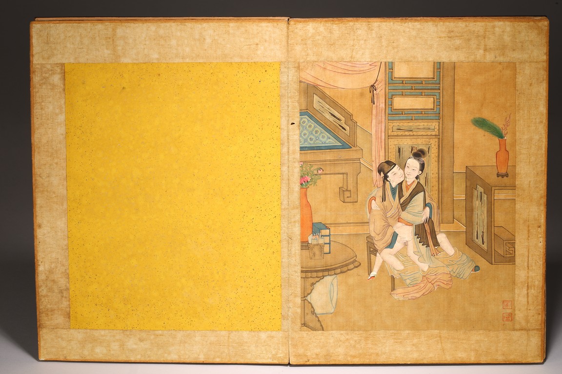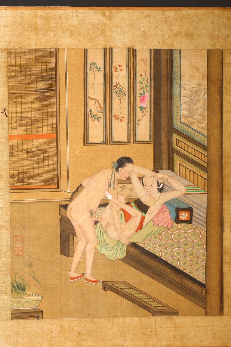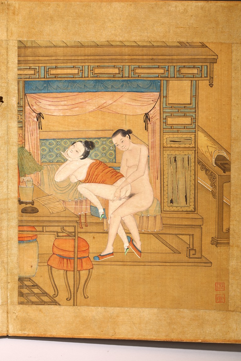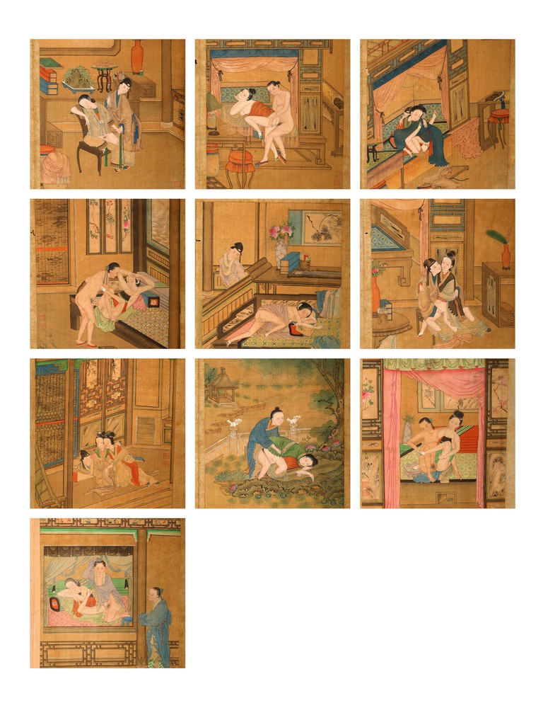 Chinese. Color and ink on silk. Ten leaves. Painted in vivid pigment colors on silk with various erotic scenes. with two seal marks 'Jing' and 'Tang'. Anonymous. Qing Dynasty period.