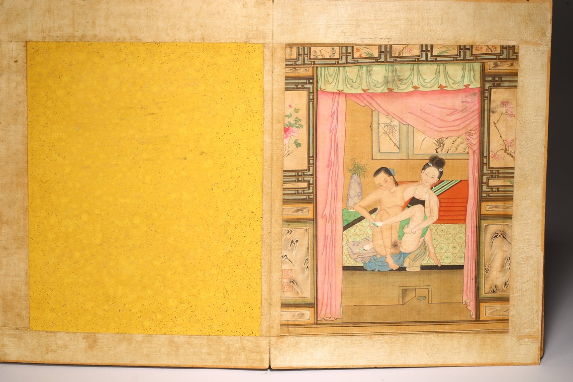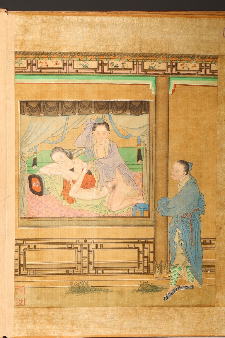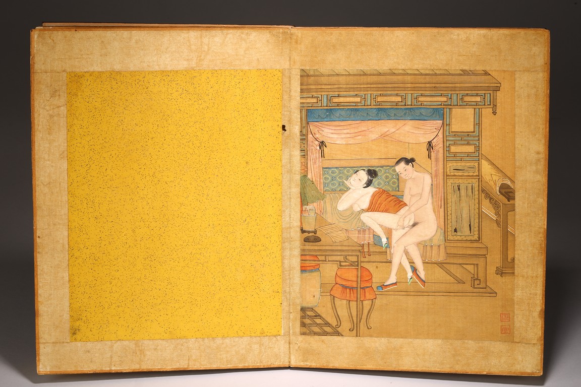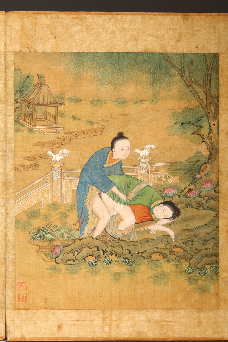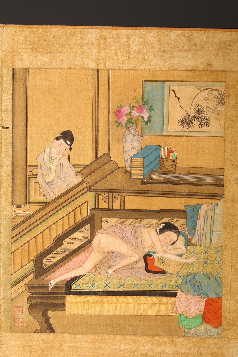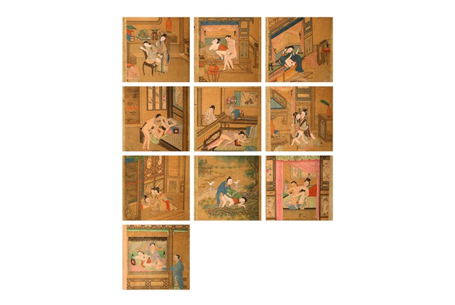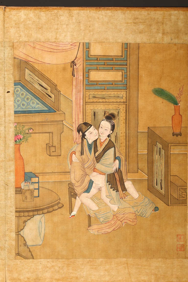Chinese. Color and ink on silk. Ten leaves. Painted in vivid pigment colors on silk with various erotic scenes. with two seal marks 'Jing' and 'Tang'. Anonymous. Qing Dynasty period.