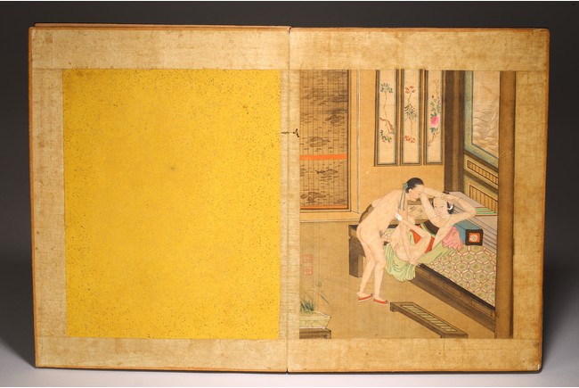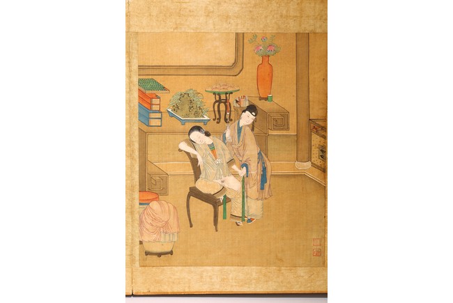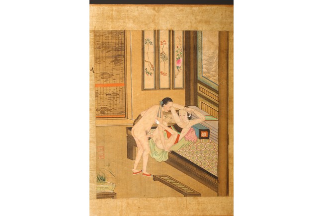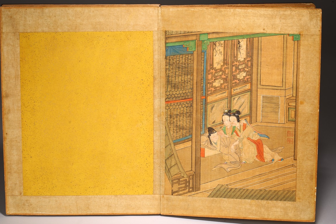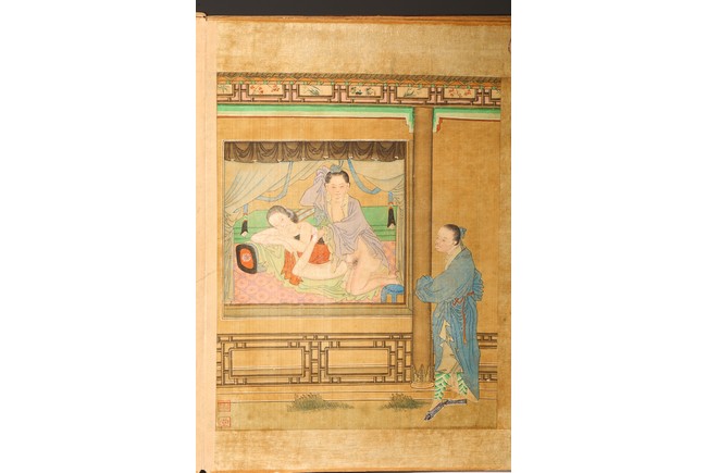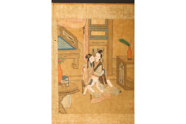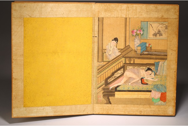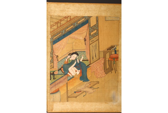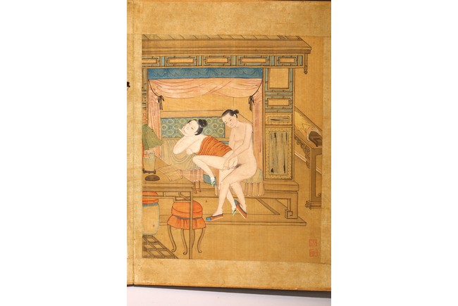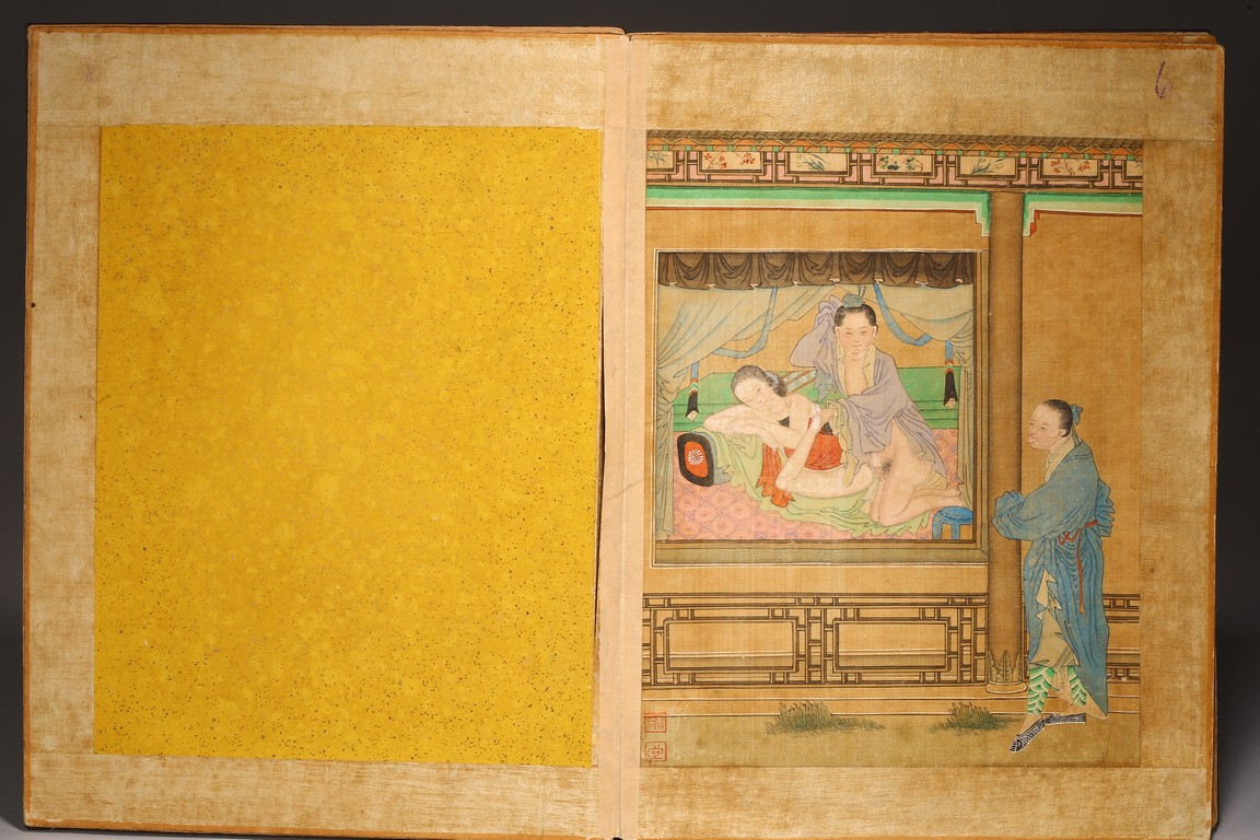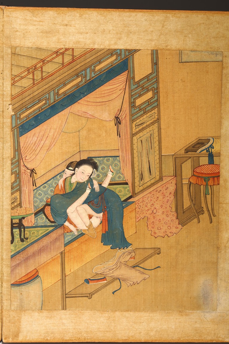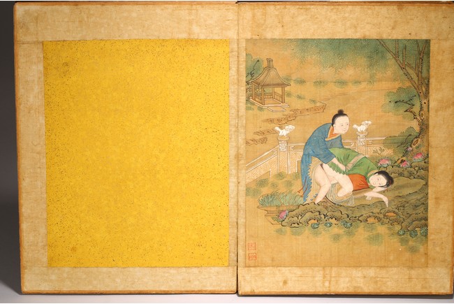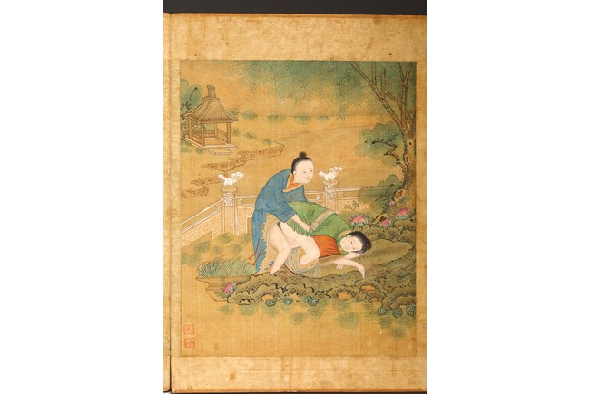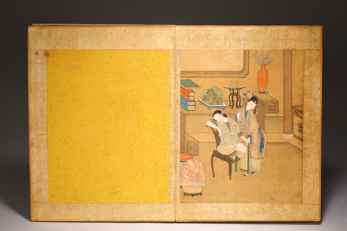 Chinese. Color and ink on silk. Ten leaves. Painted in vivid pigment colors on silk with various erotic scenes. with two seal marks 'Jing' and 'Tang'. Anonymous. Qing Dynasty period.