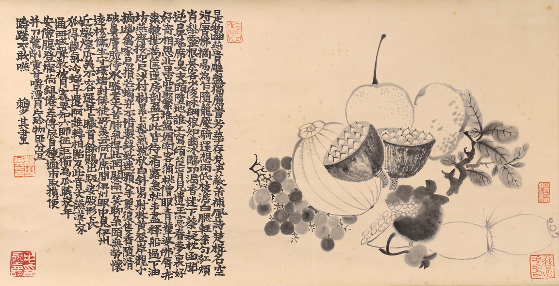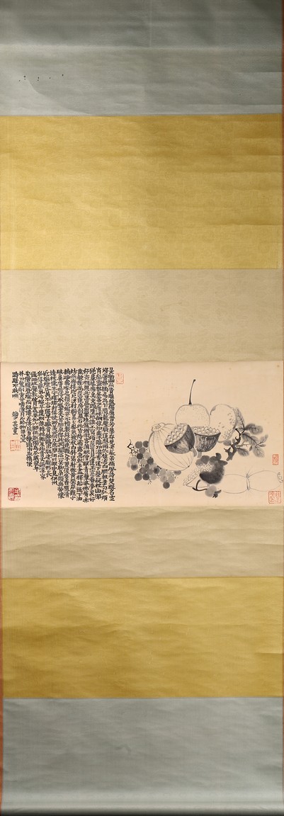 Hanging scroll. Fruits. Inscribed and signed Lai Shaoqi, with five seals of the artist.