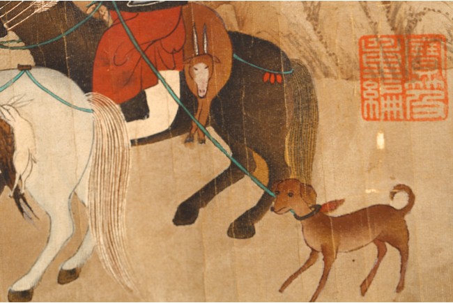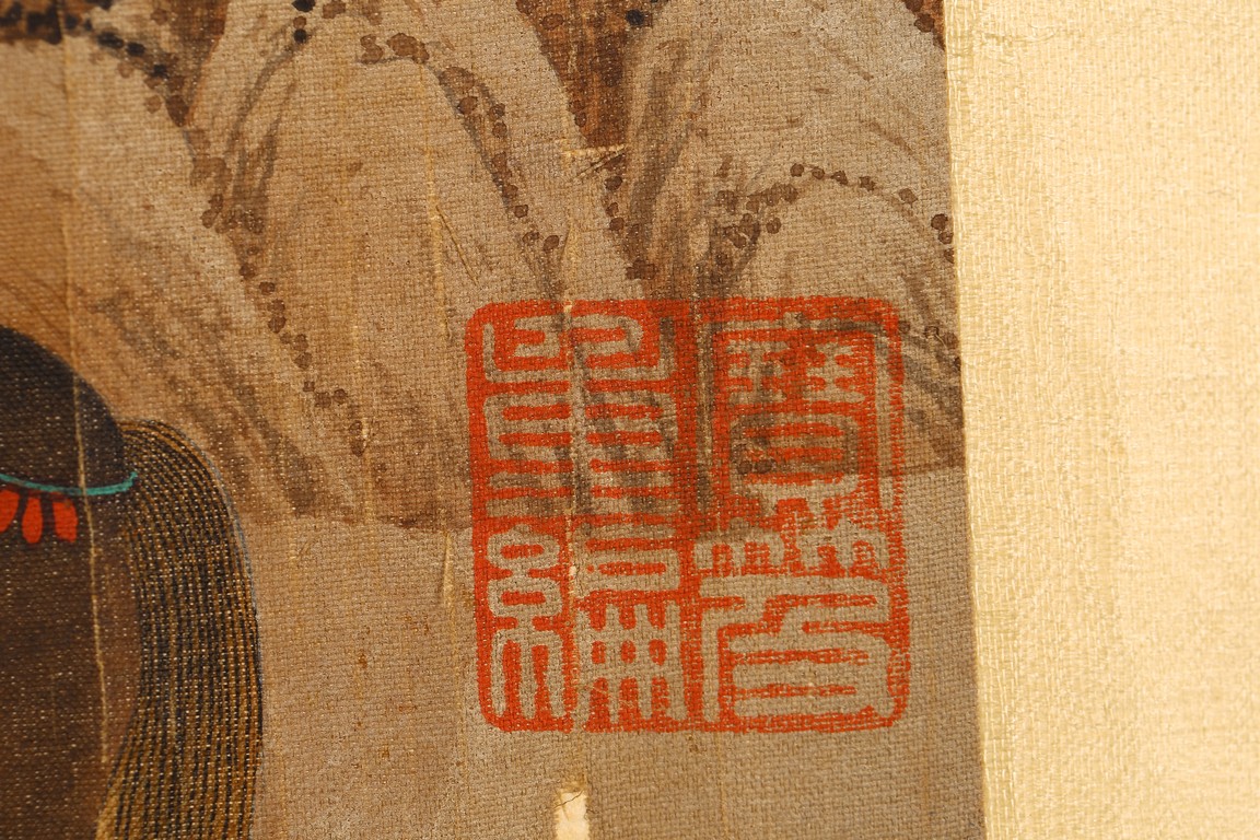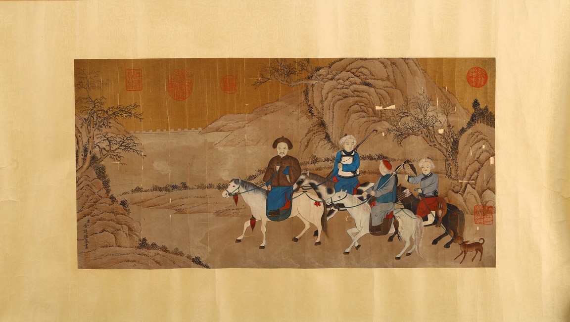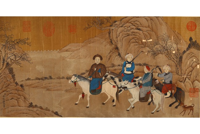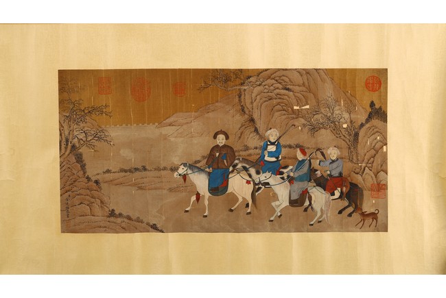 Imperial Hunting. Mounted on paper. Signed Jin Tingbiao,with seven seal marks of the artist and collectors.