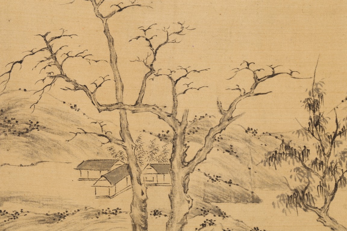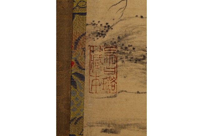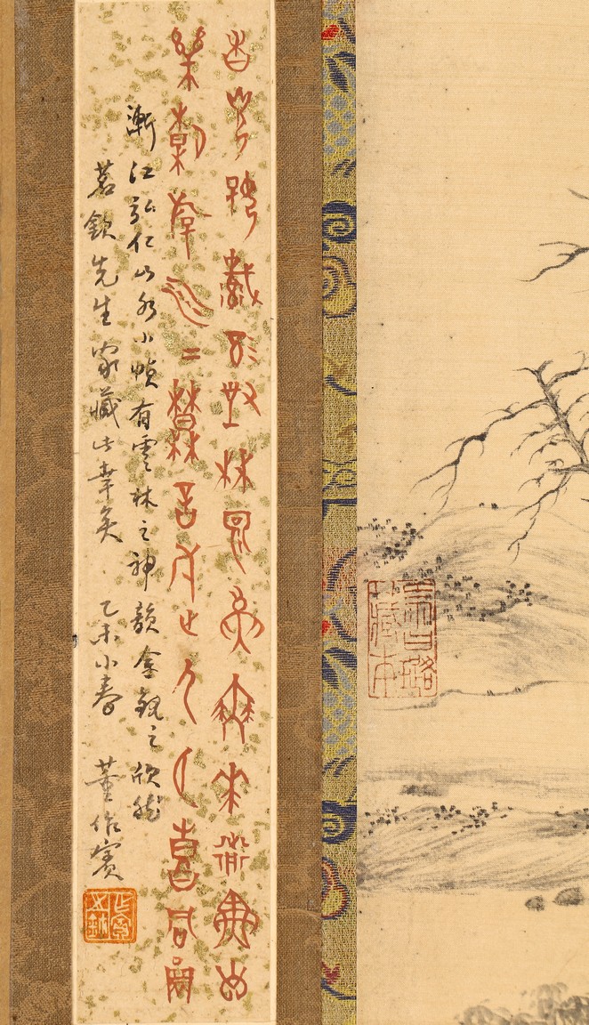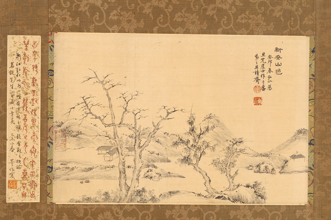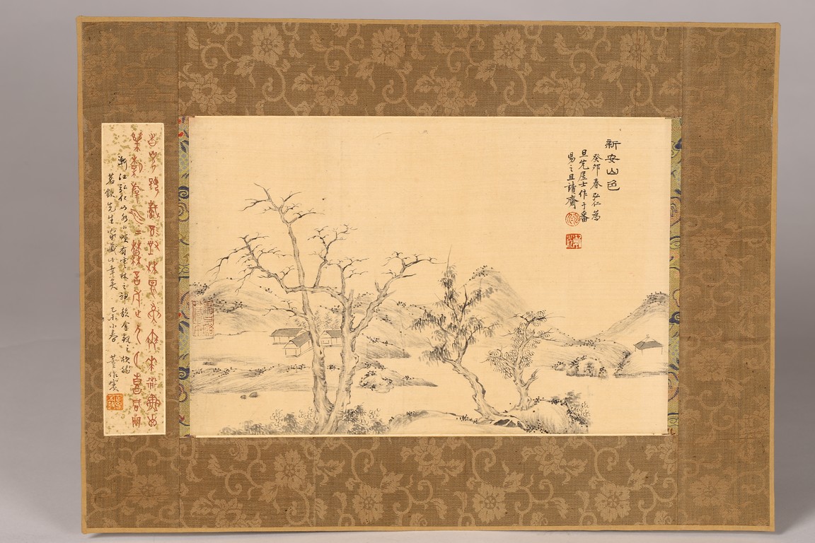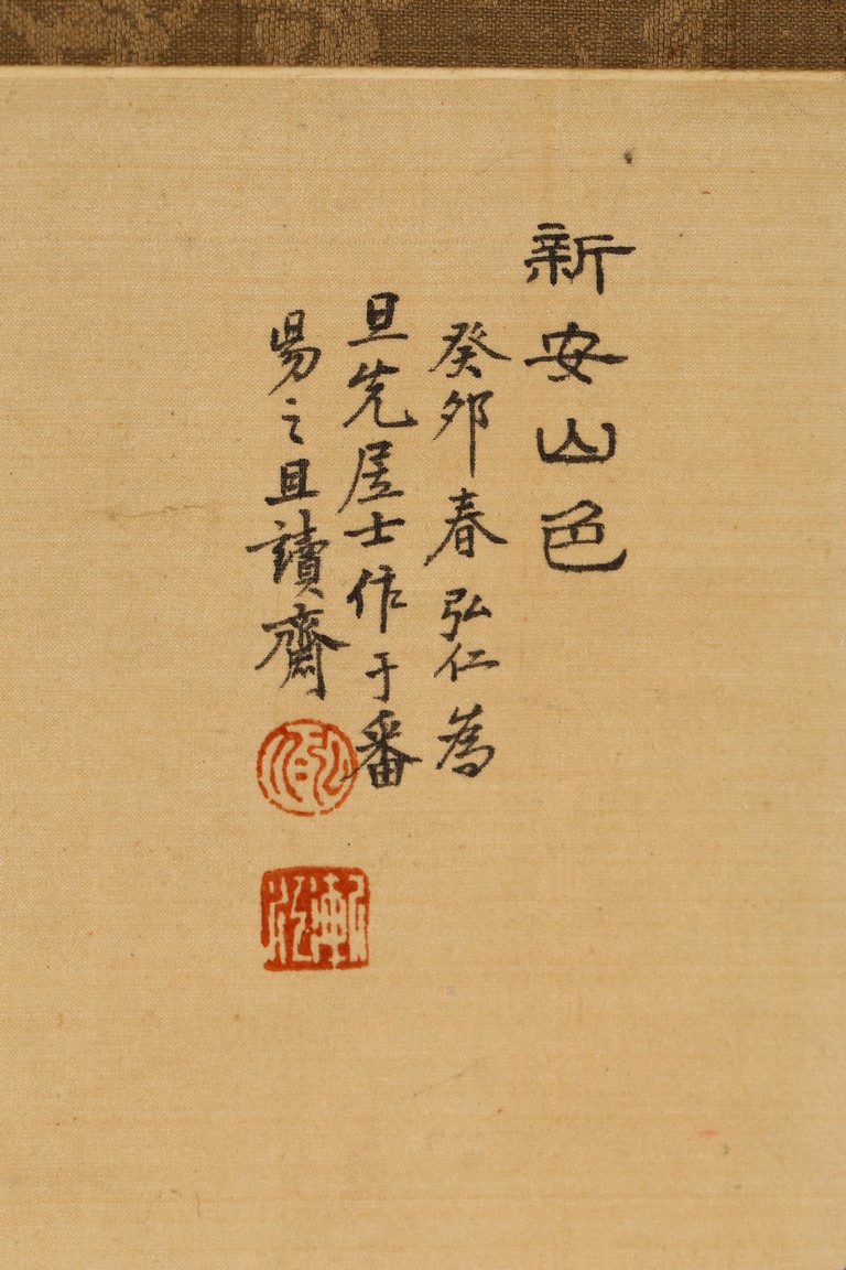 Mountain Landscape of Xin An. Inscribed and signed Hong Ren with two seal marks of the artist and a seal mark of collector. Mounted on paper. With colophon signed Dong Zuobin with one seal mark. Attributed to Hong Ren.