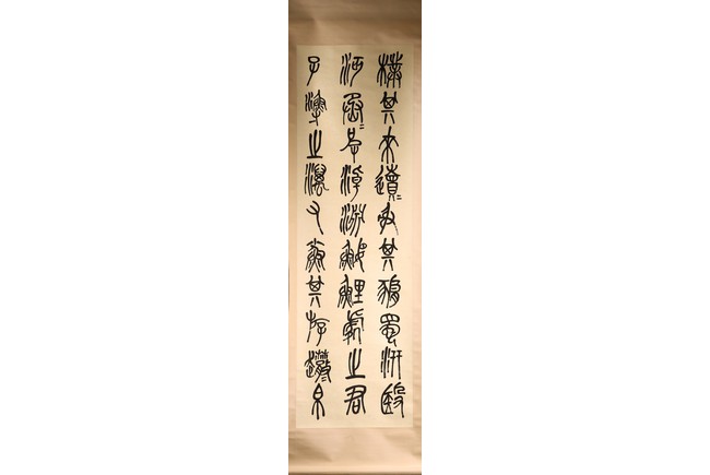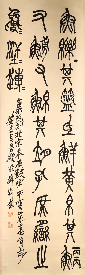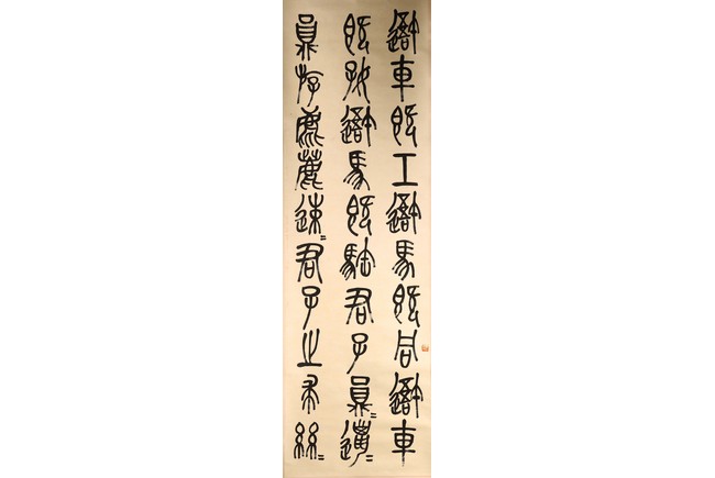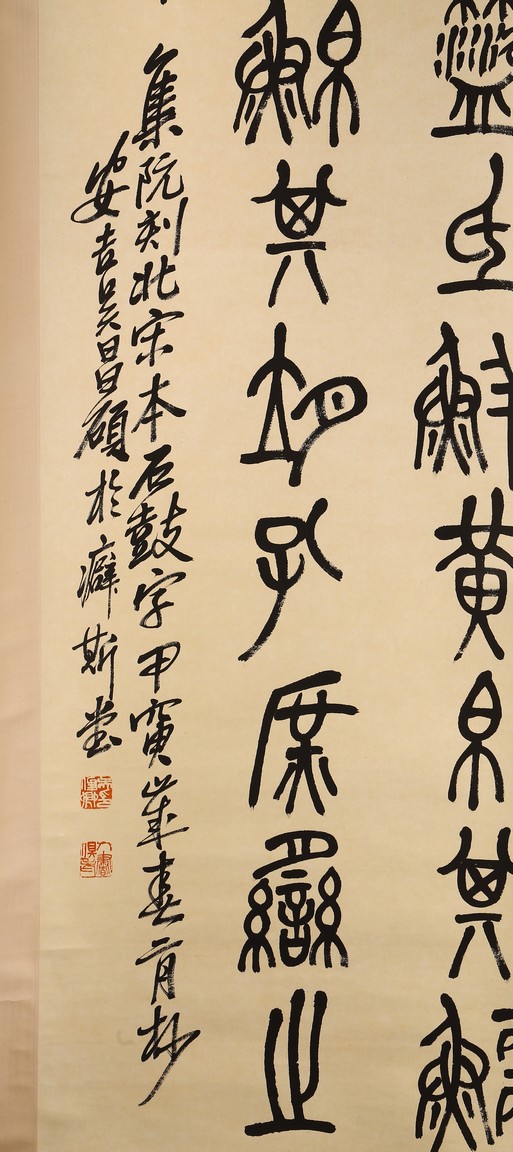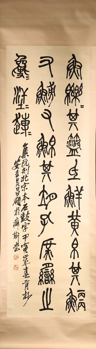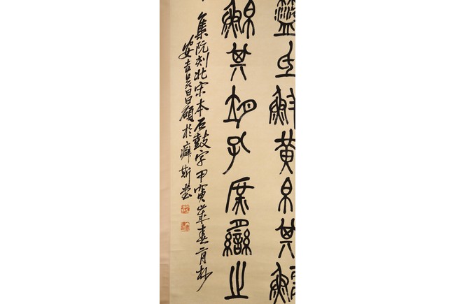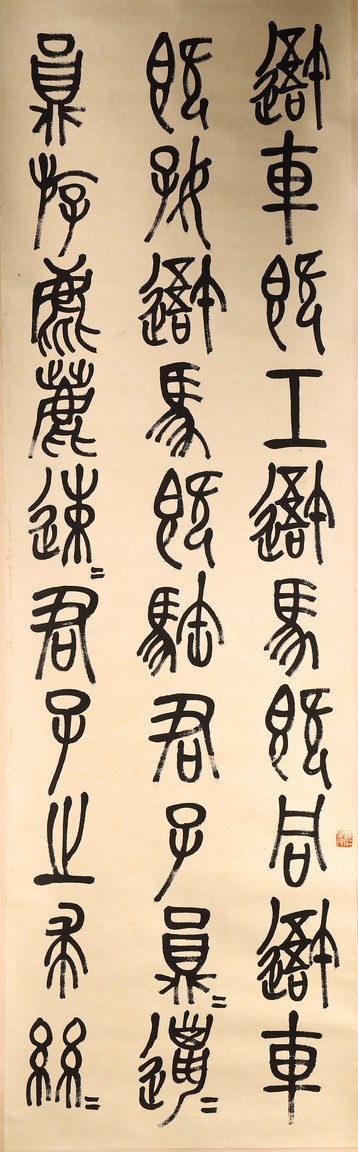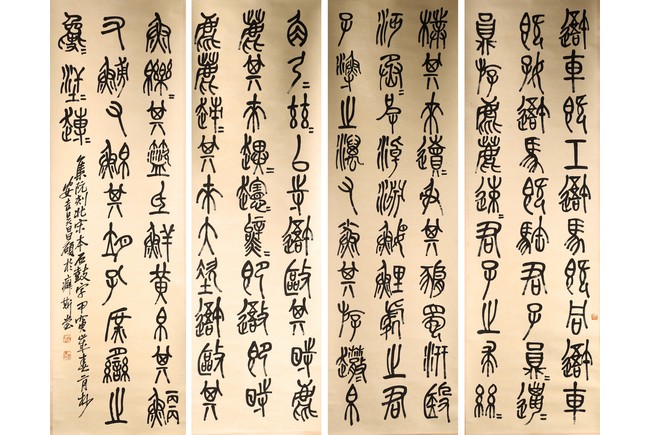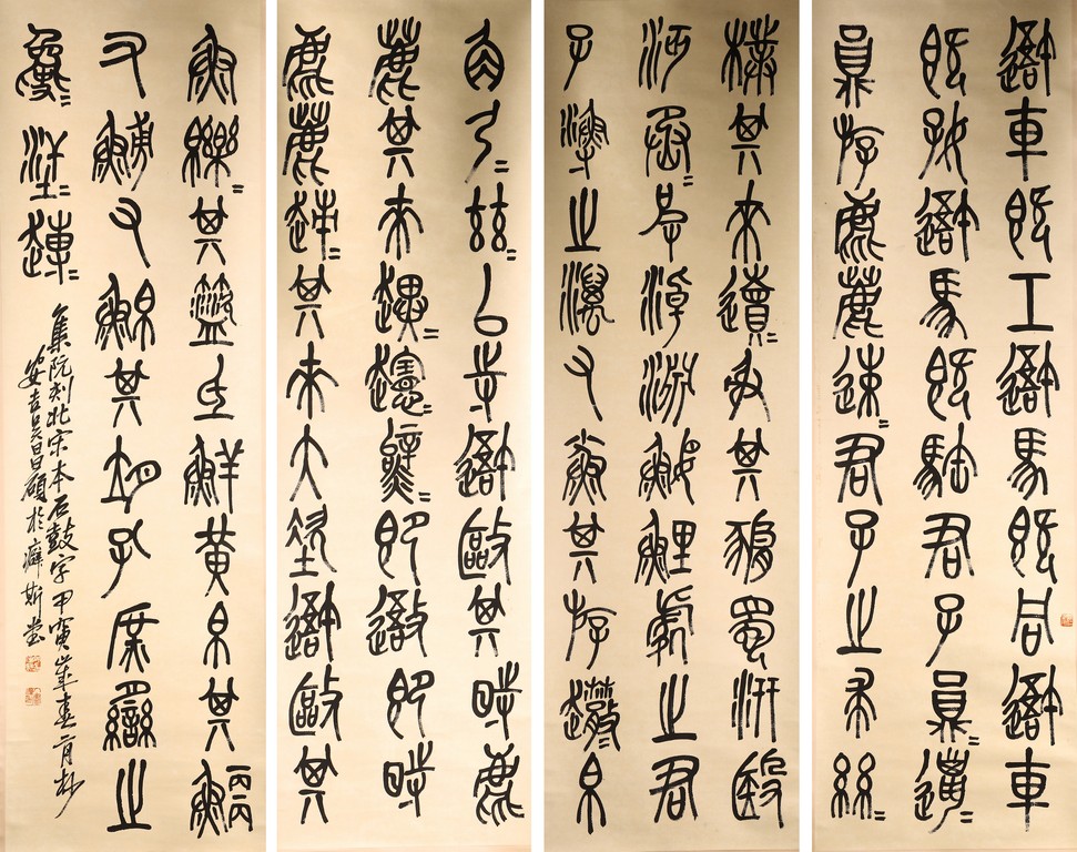 Ink on paper. Stone and Drum Script in seal script calligraphies. Set of four. Inscribed and signed Wu Changshuo, with three seal marks of the artist.