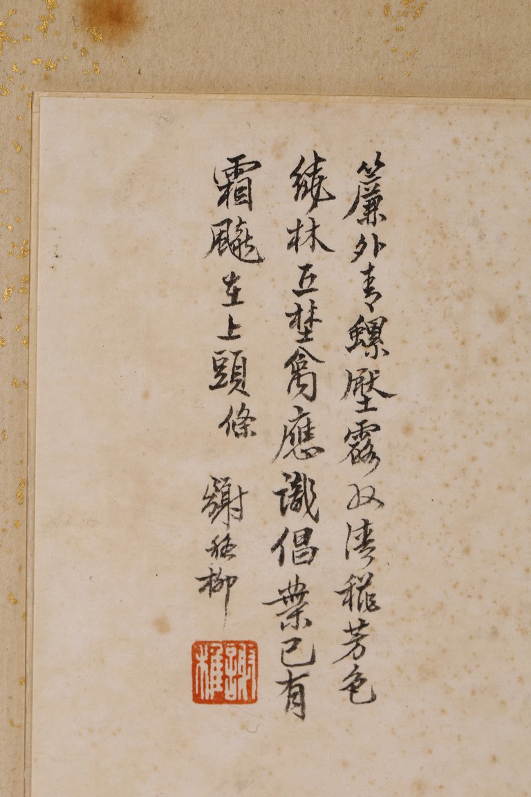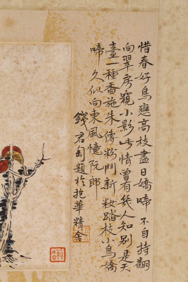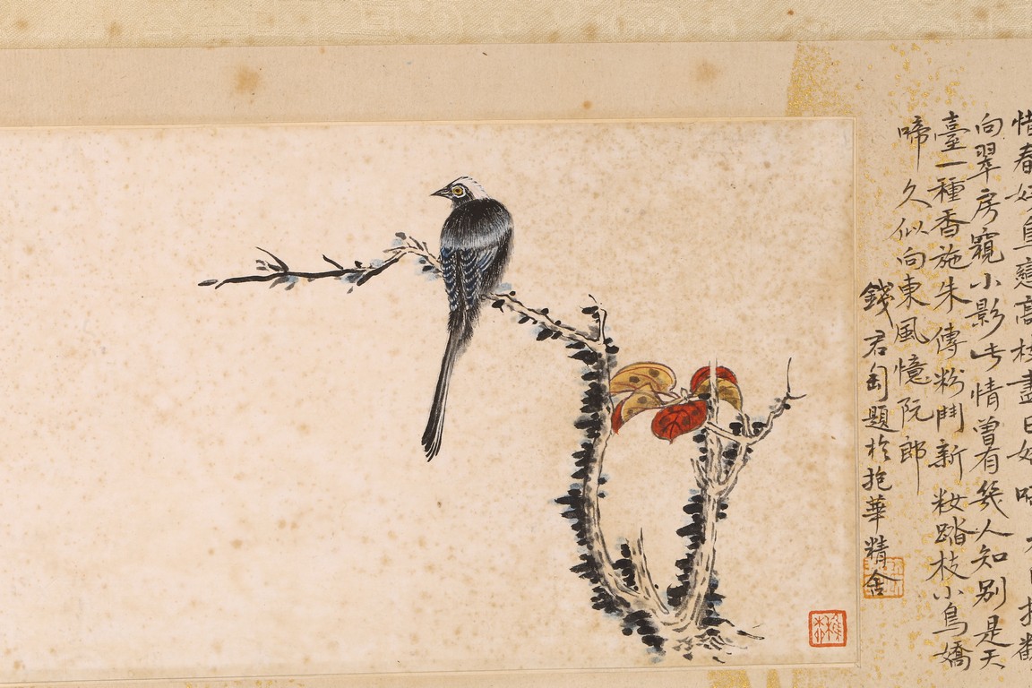 Color and ink on paper. Bird and flowers. Inscribed and signed Xie Zhiniu, with two seal marks of the artist, with colophone signed.