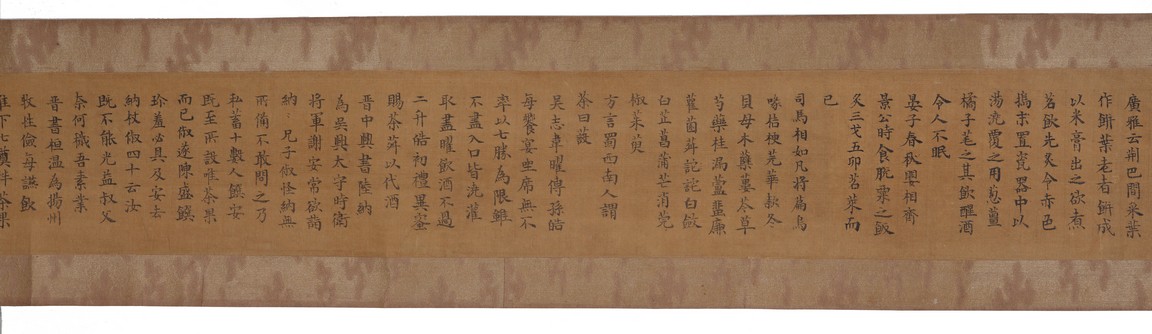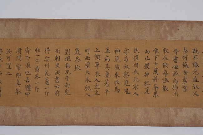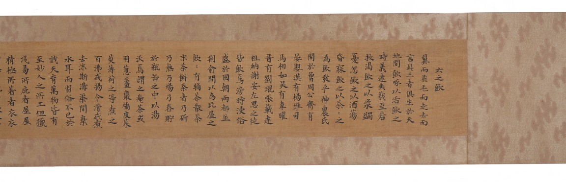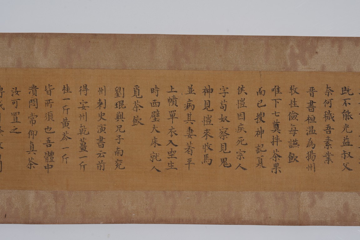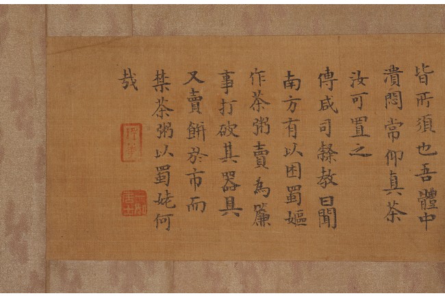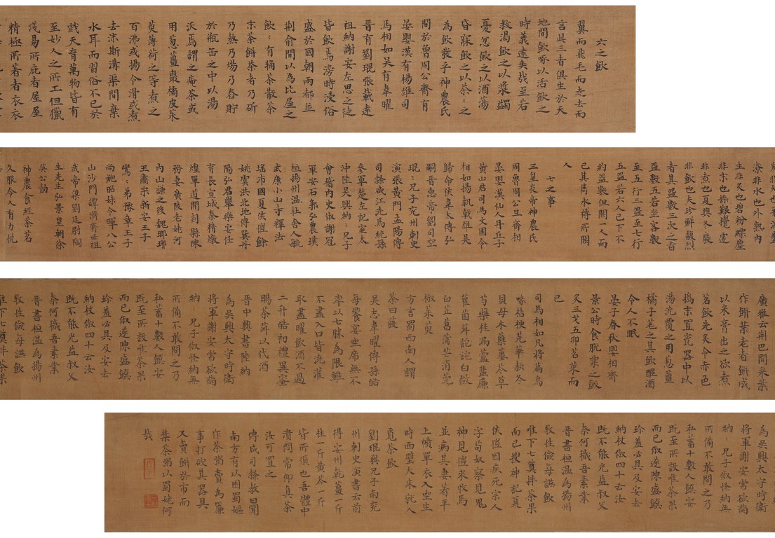 Chinese. Qing Dynasty period. Ink on silk. Handscroll. Calligraphy of Classic of Tea, inscribed with two seal marks indicating the artist name is Yi Ru Ju Shi or Hong Wu.