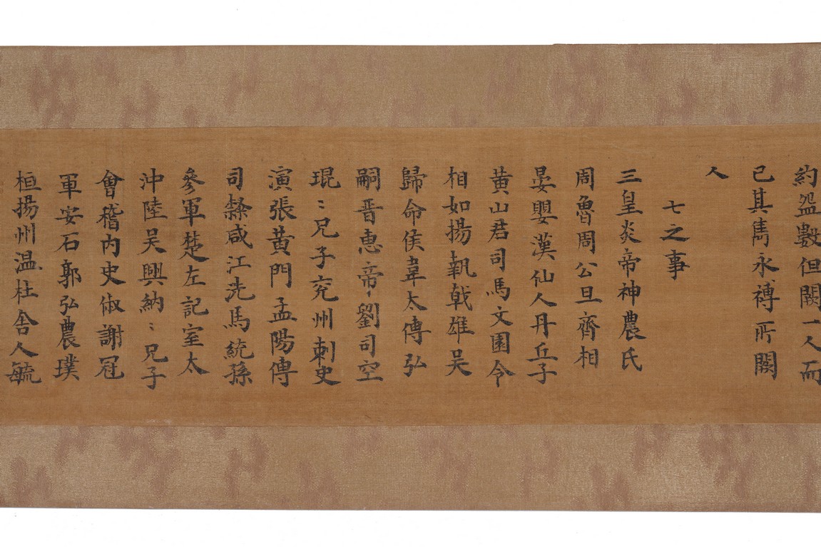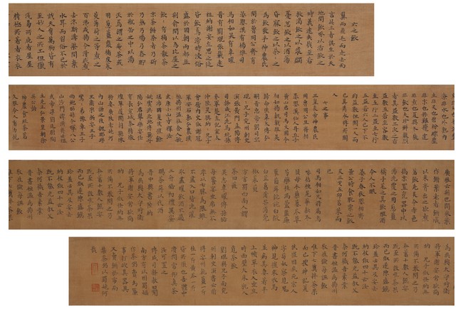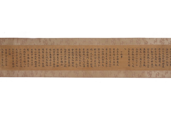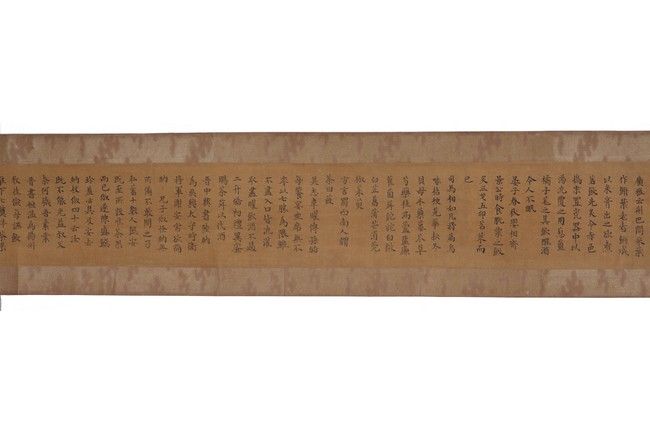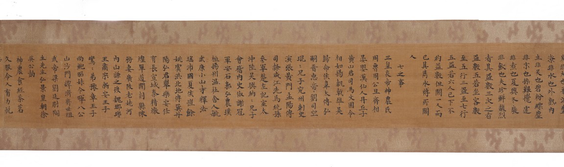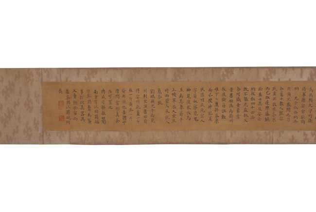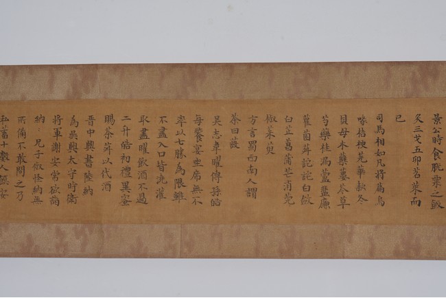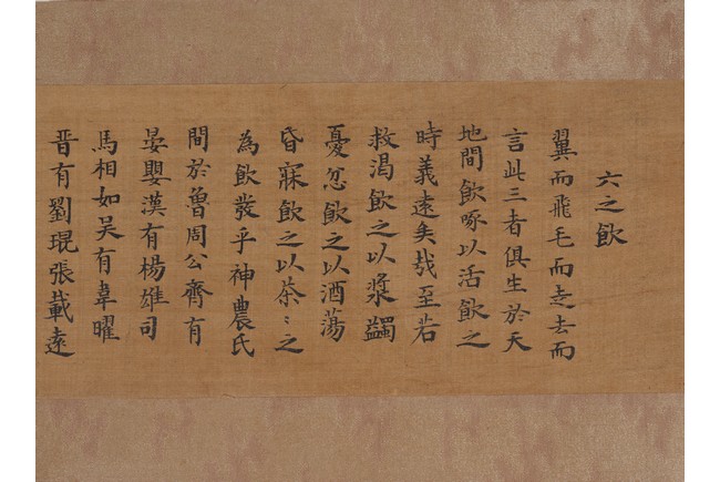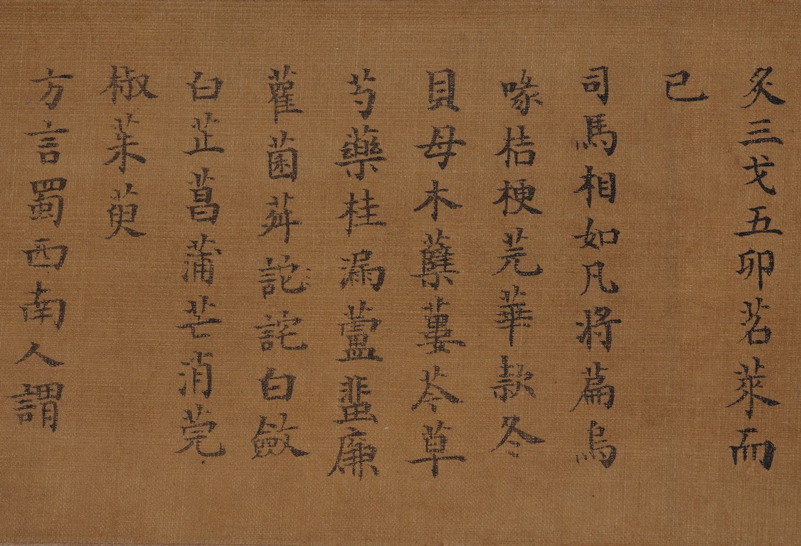 Chinese. Qing Dynasty period. Ink on silk. Handscroll. Calligraphy of Classic of Tea, inscribed with two seal marks indicating the artist name is Yi Ru Ju Shi or Hong Wu.