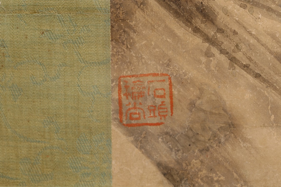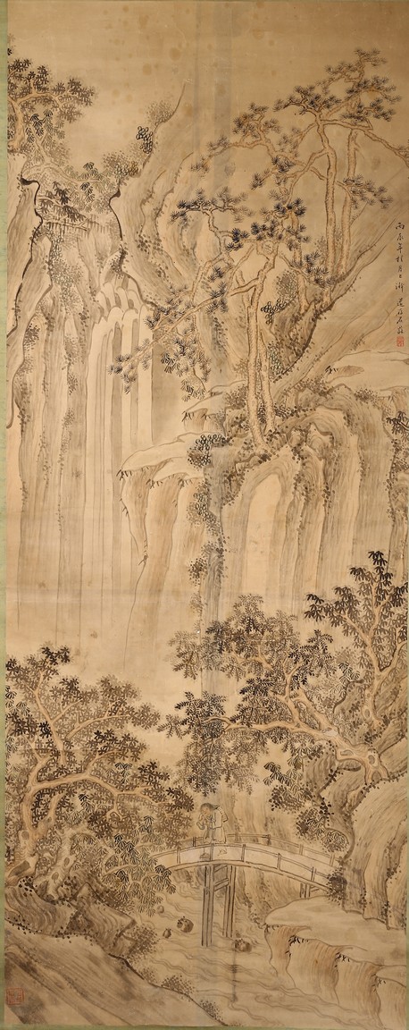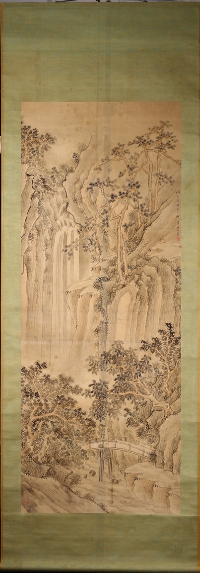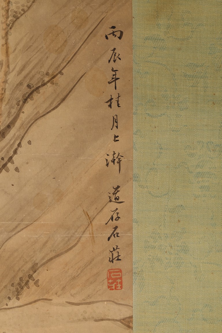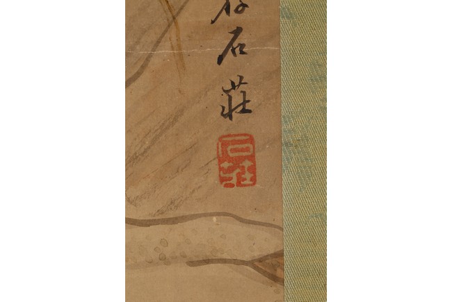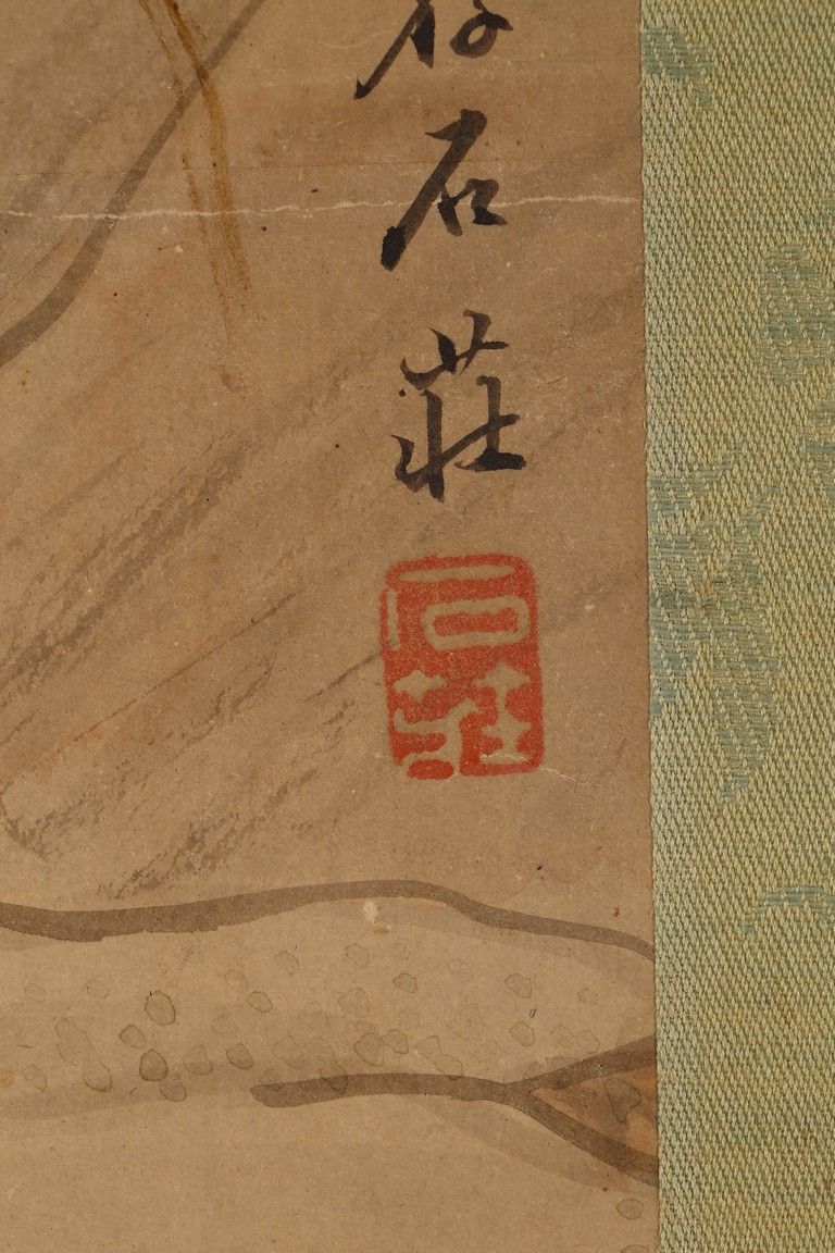 Color and ink on paper. Landscape. Hanging scroll. Inscribed and signed Shi Zhuang, with two seal marks.