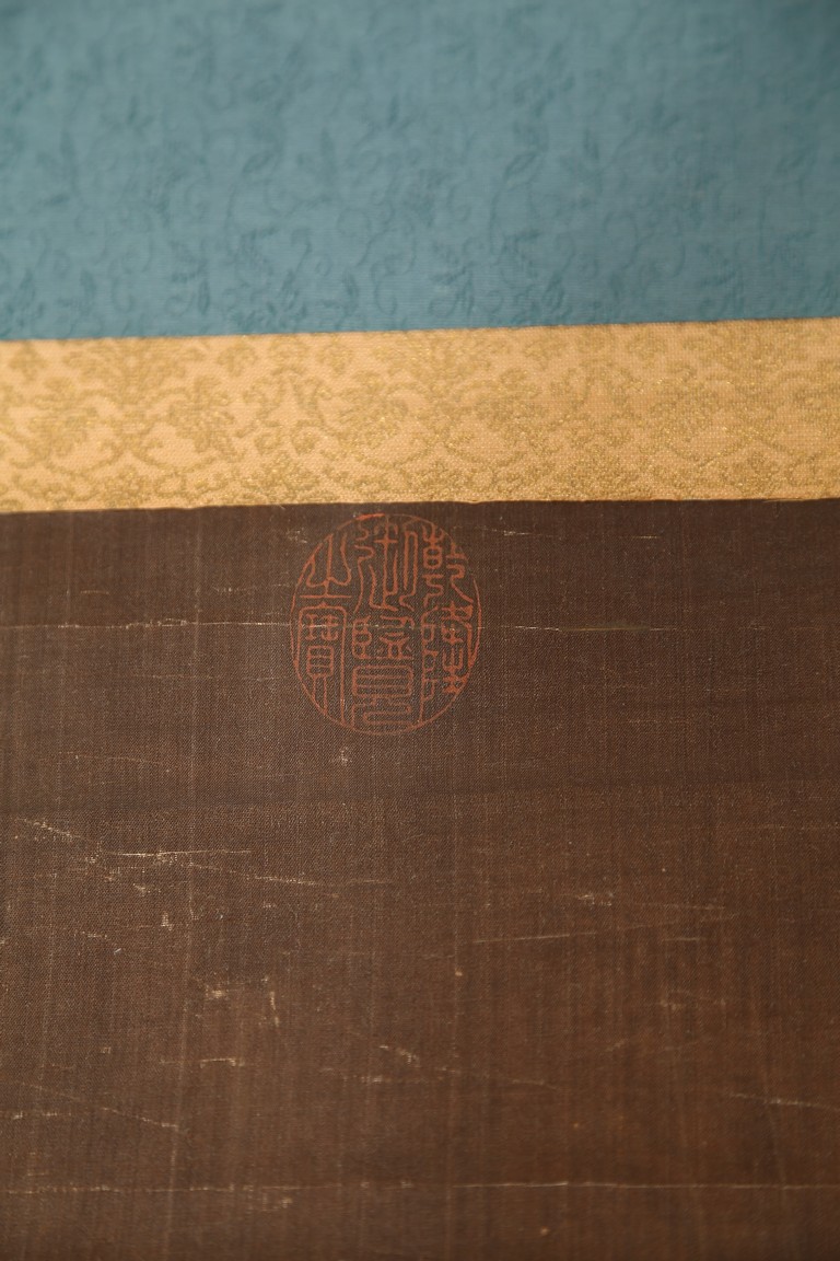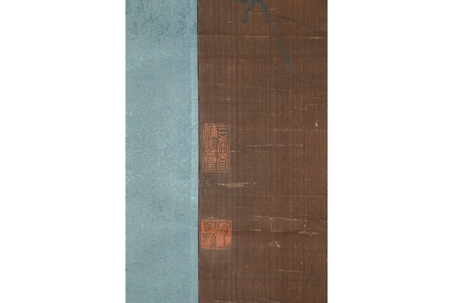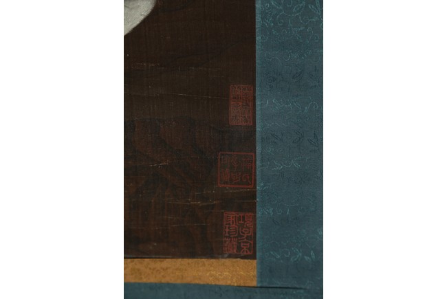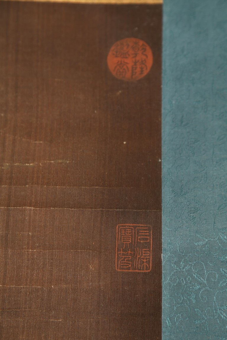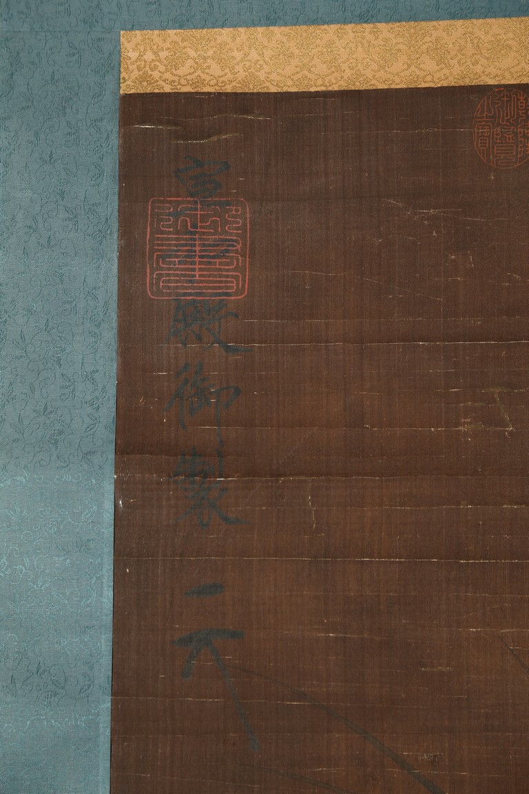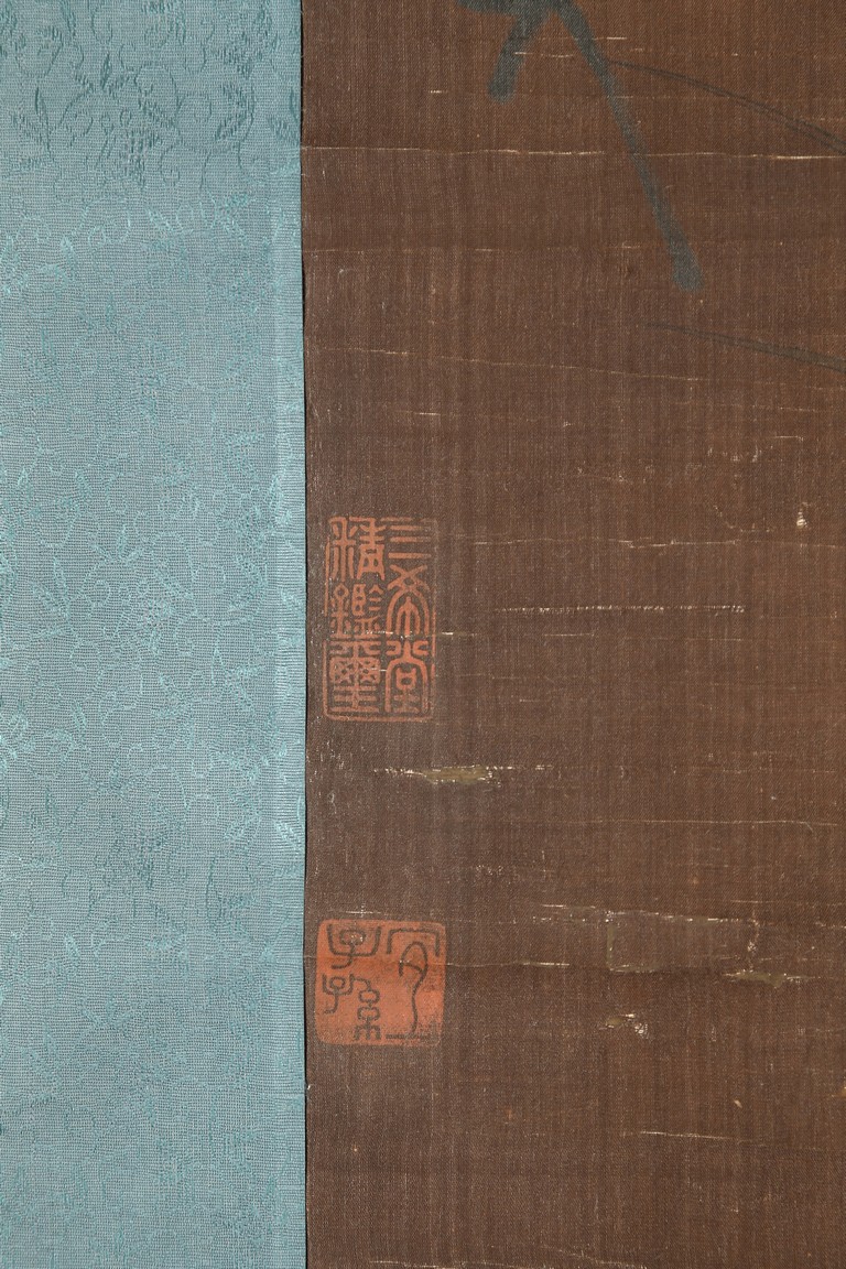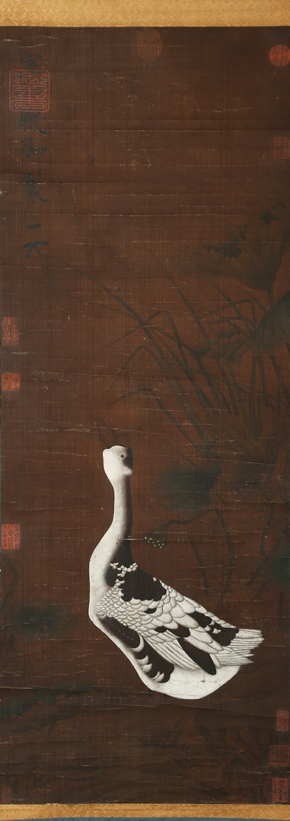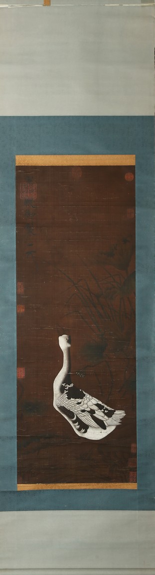 Ink and color on silk painting. Goose. Hanging scroll. Signed and with eleven seals of the artist.