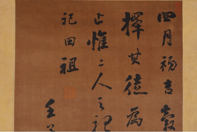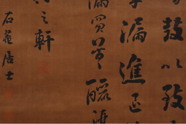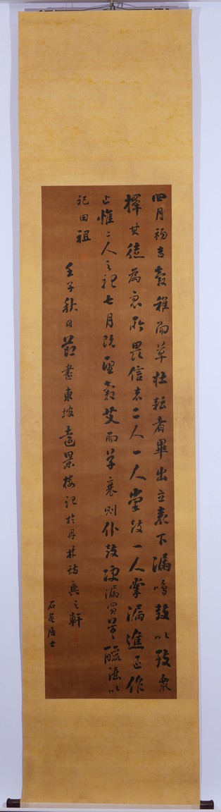 劉墉喜用濃墨,字體圓厚,變化無常,氣象恢弘雄偉。落款:石庵居士。鈐印: 東武,劉墉之印。劉墉:字崇如,號石庵,清朝政治家、書法家歷任翰林院庶吉士、安徽學政、江蘇學政、太原知府、江寧知府、內閣學士,遷體仁閣大學士、太子少保,以奉公守法、清正廉潔聞名於世,參與辦理和珅。