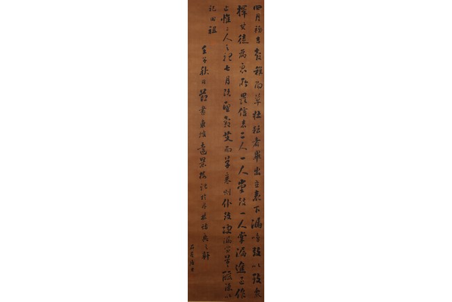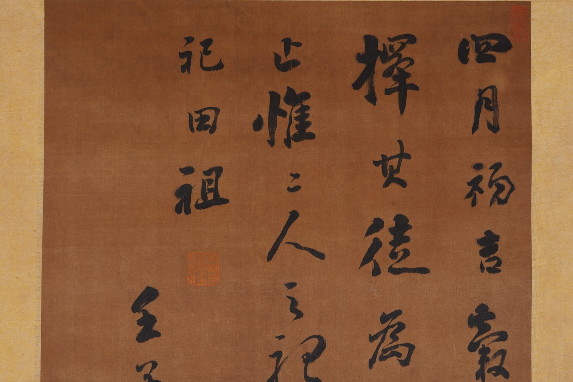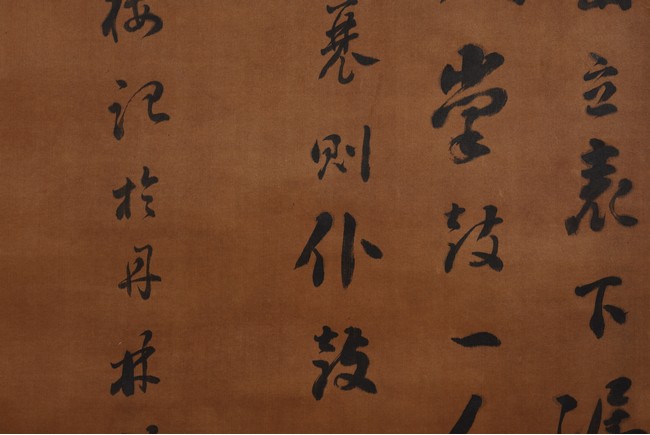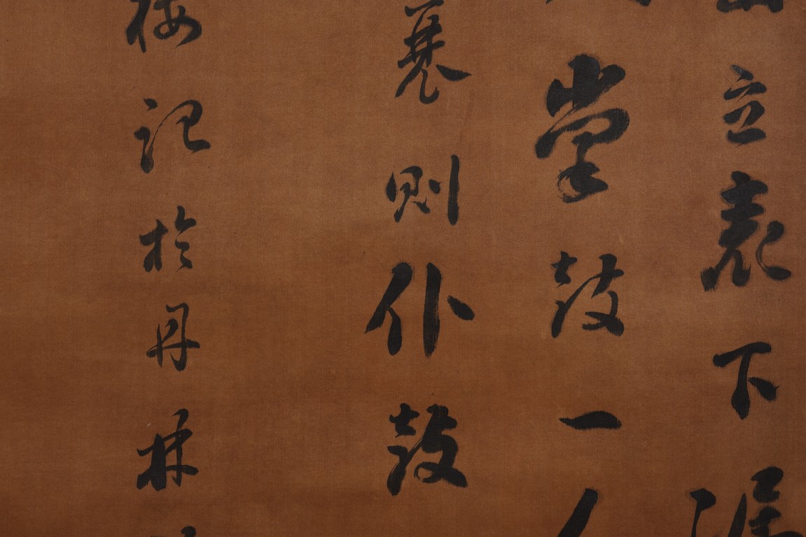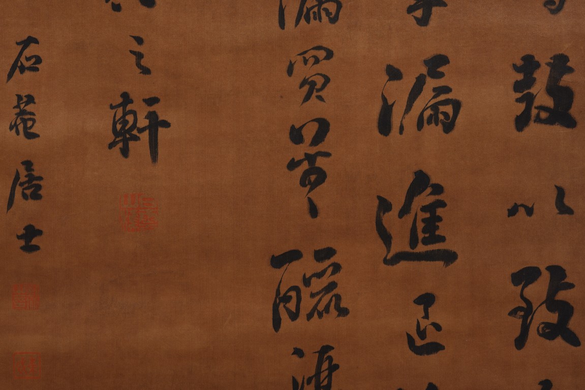 Ink on satin. Hanging scroll. Running script calligraphy. Inscribed and signed Shi An Ju Shi.