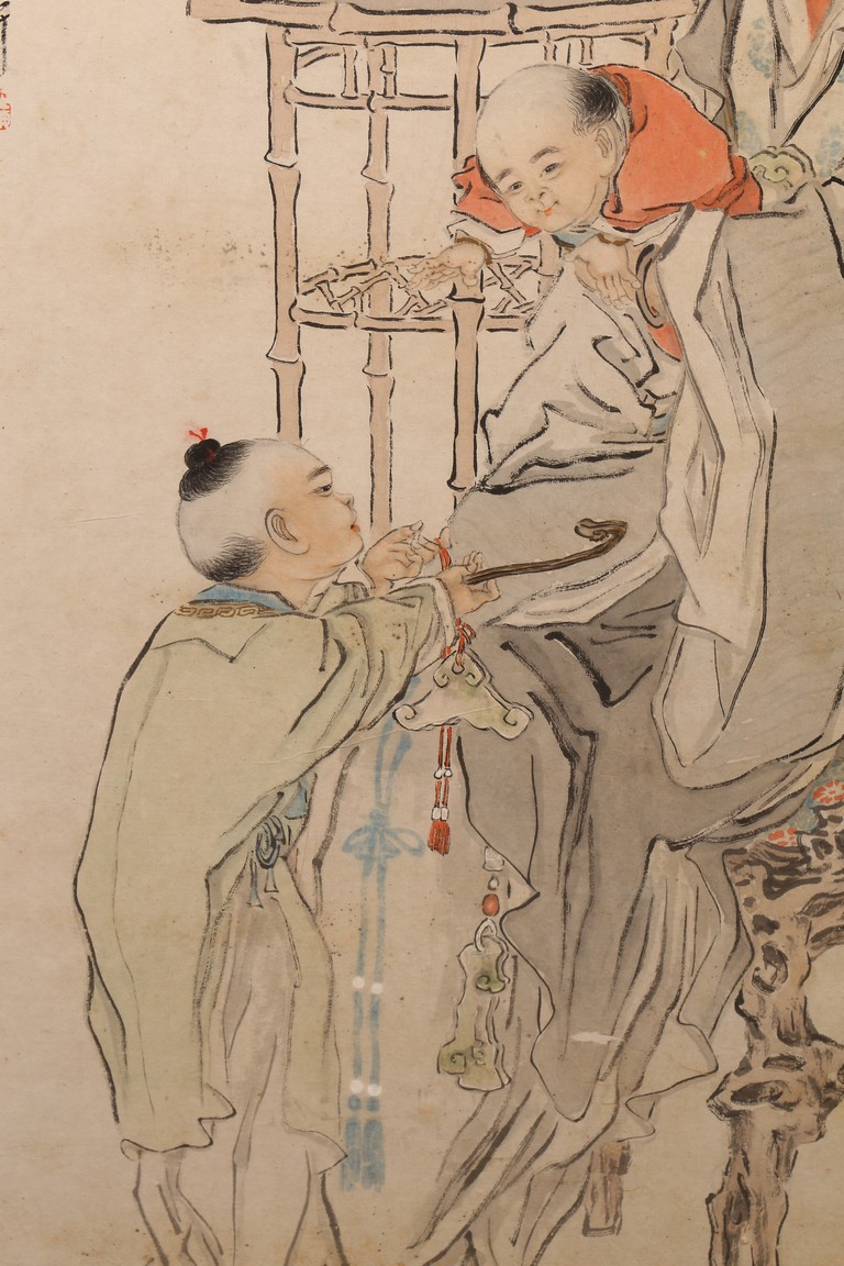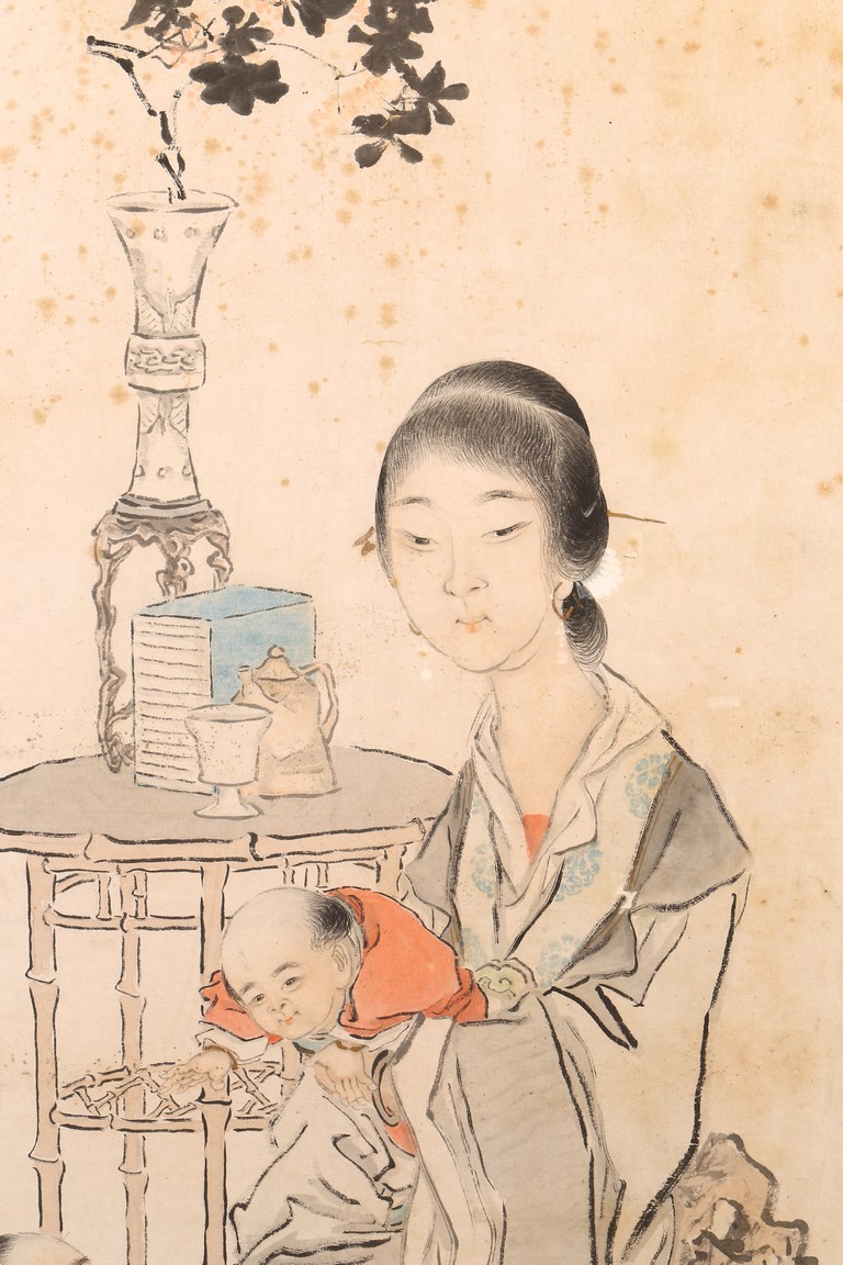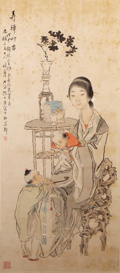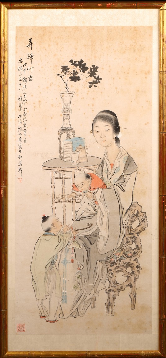 Chinese. Shen Xinai (1855—1941) Color and ink on paper. Mother and Children. Inscribed and signed Xinhai, with two seal marks.