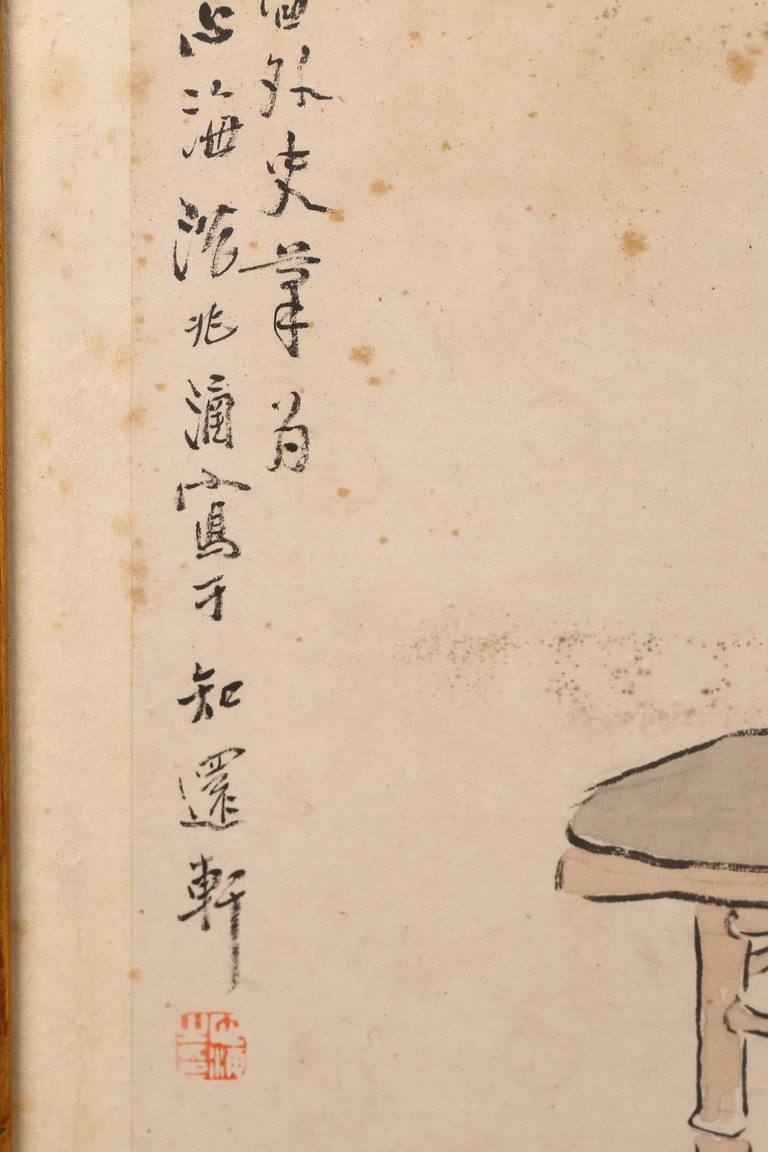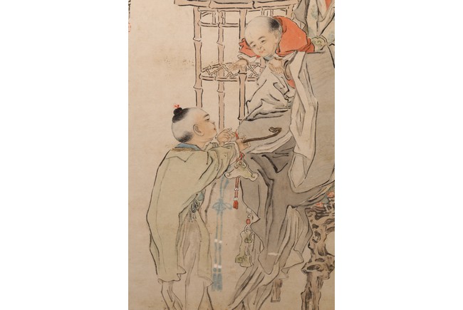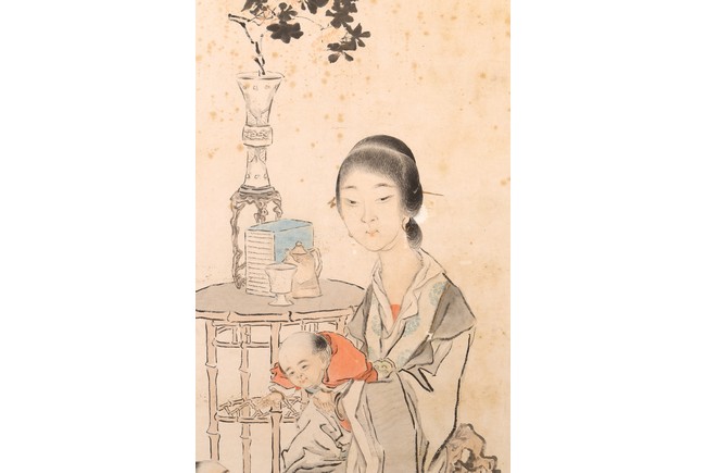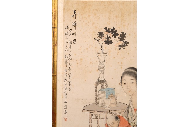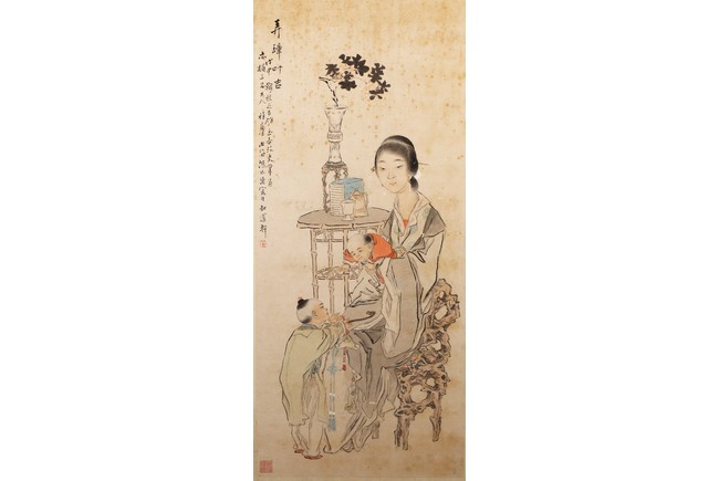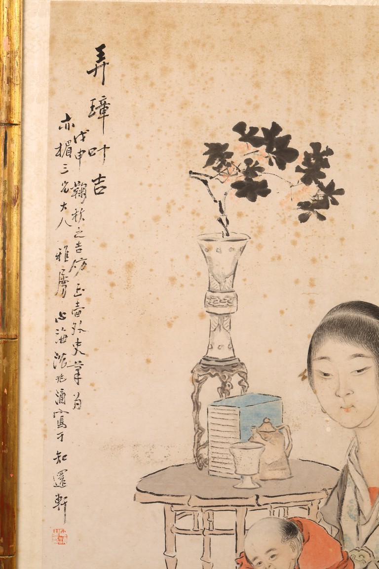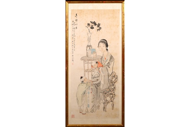 Chinese. Shen Xinai (1855—1941) Color and ink on paper. Mother and Children. Inscribed and signed Xinhai, with two seal marks.