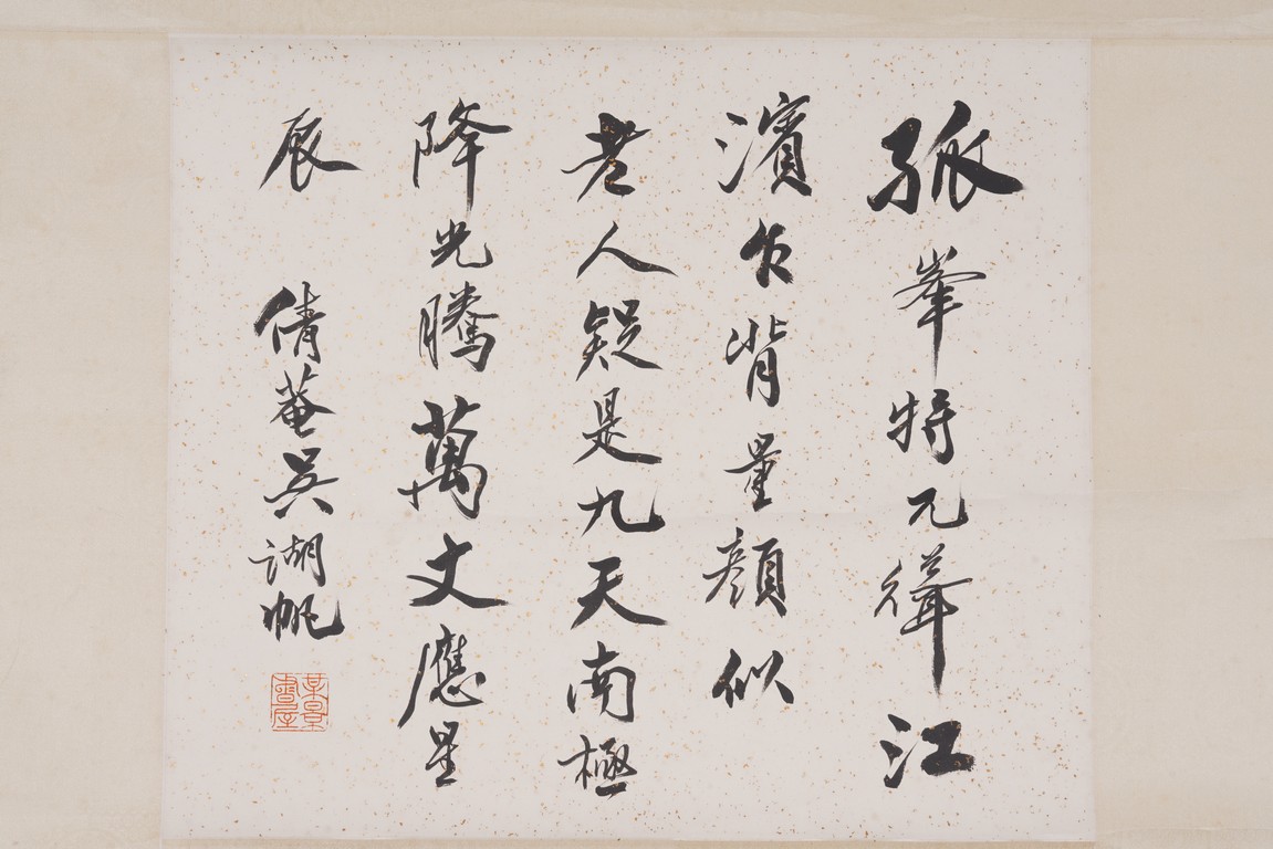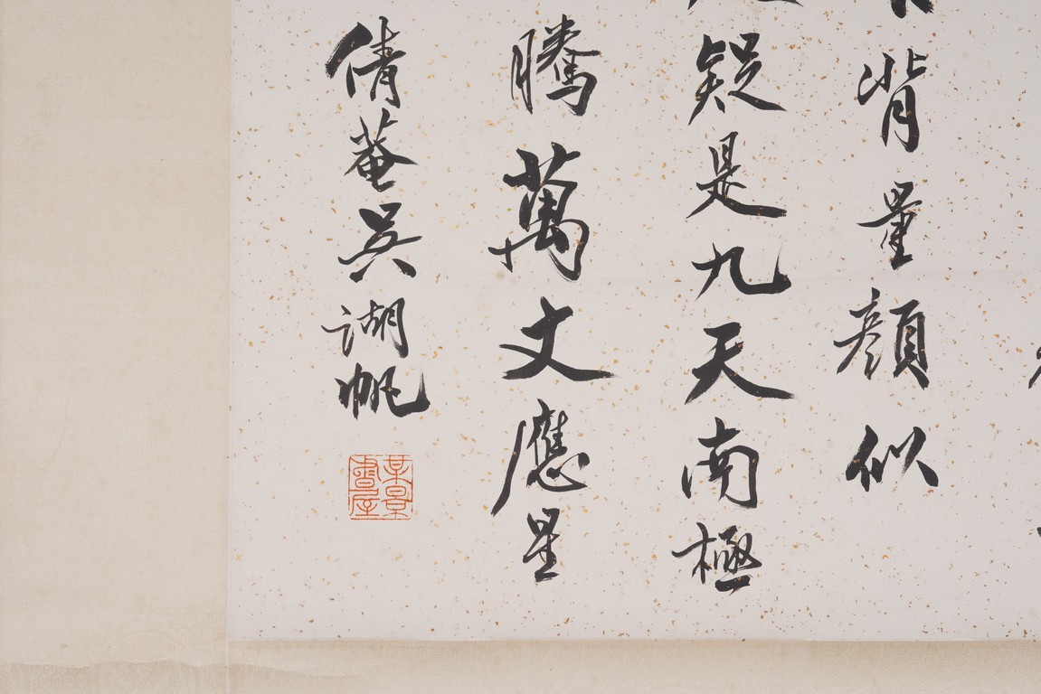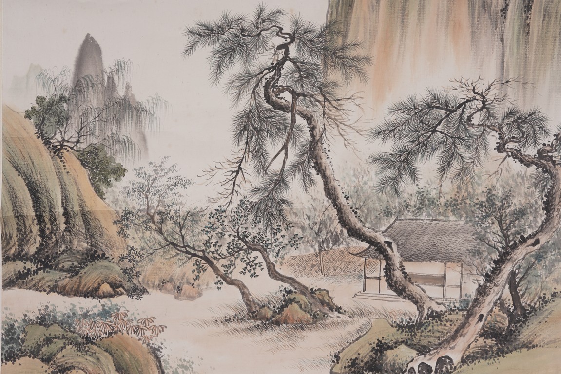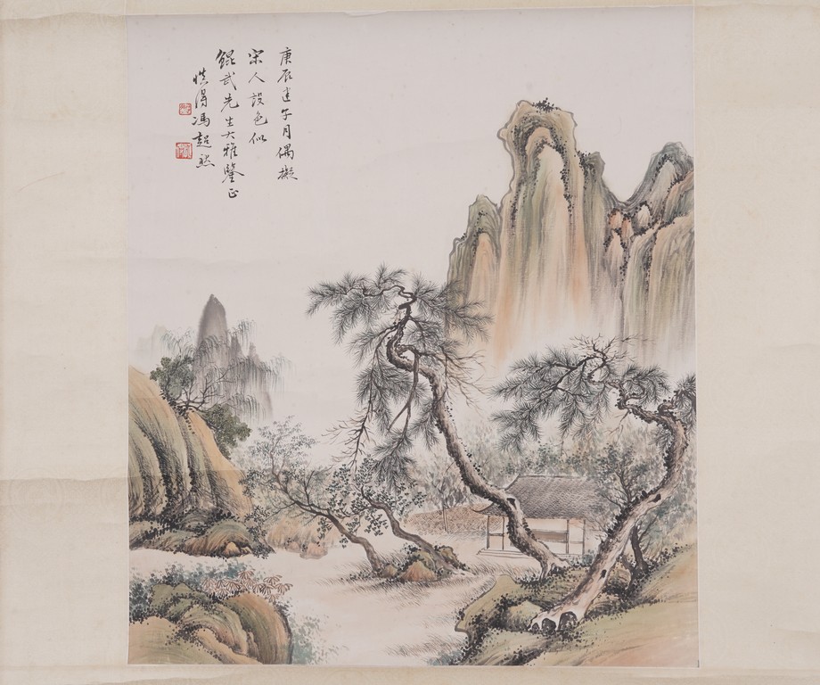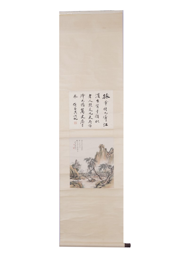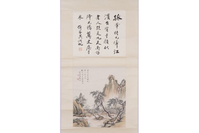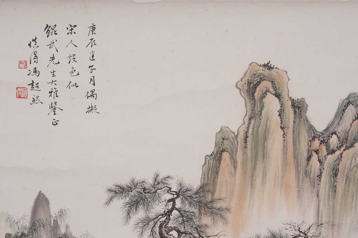 Color and ink on paper. landscape and calligraphy. hanging scroll. inscribed and signed, Feng Chaoran and Wu Hufan.