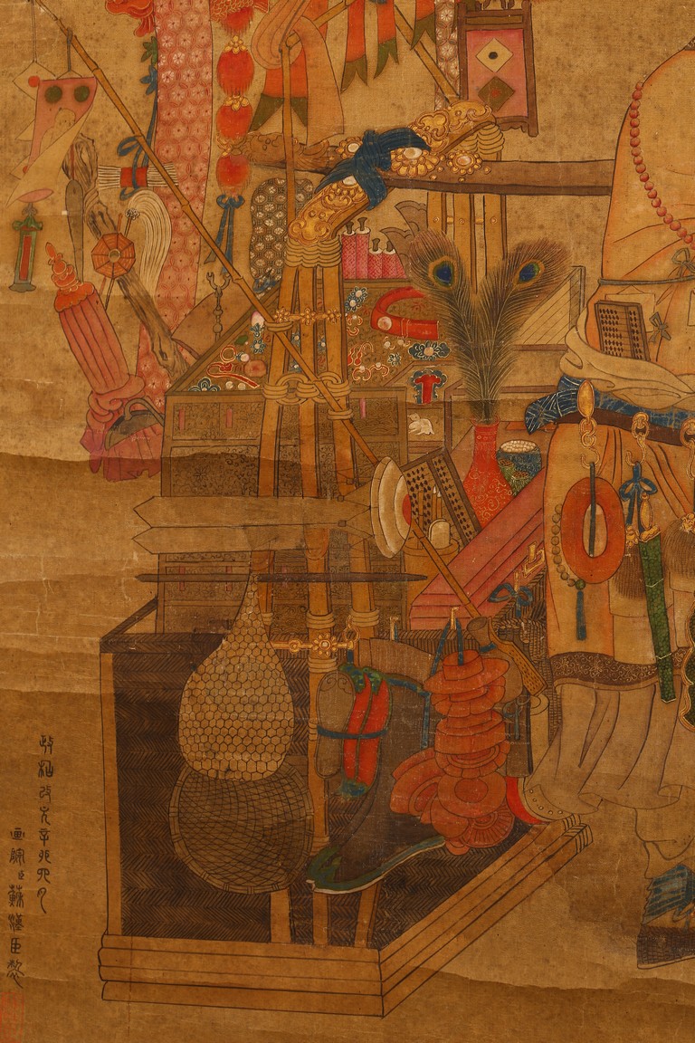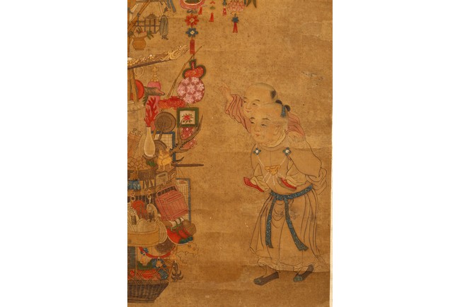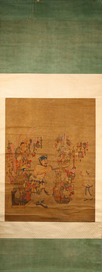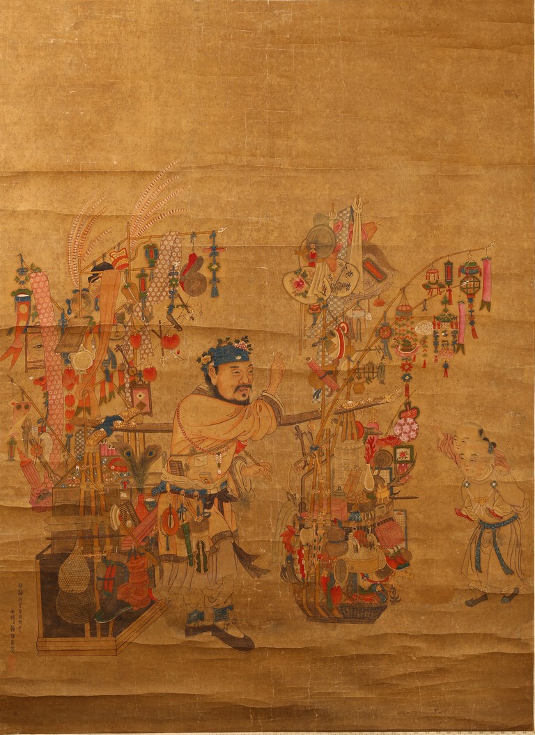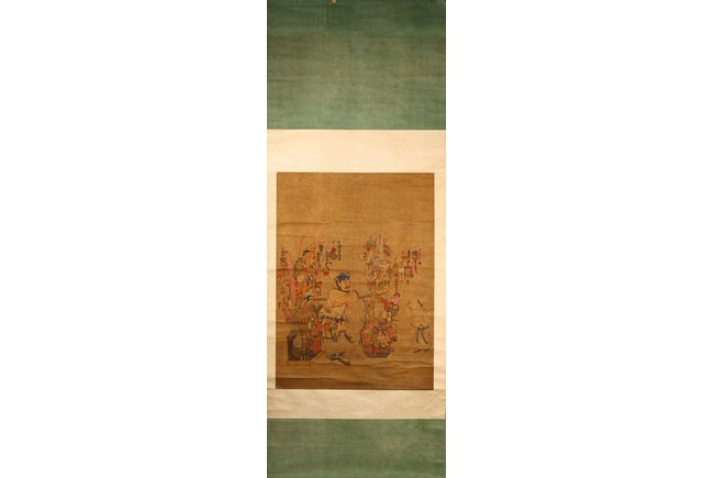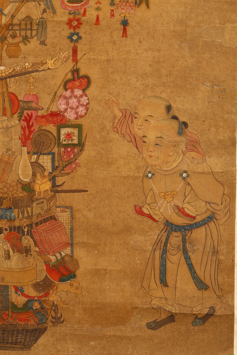Chinese. Color and ink on silk. Boys and Merchant. Hanging scroll Inscribed and signed Su Hanchen in seal script with one seal mark. Attributed to Su Hanchen.