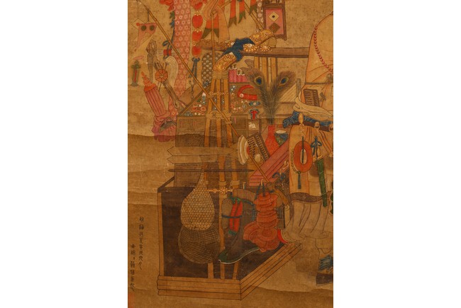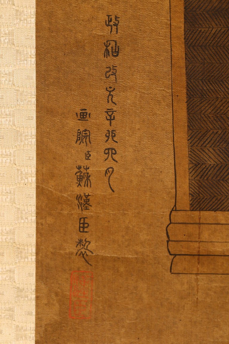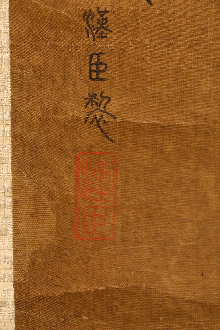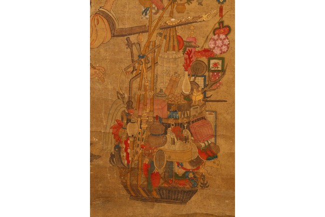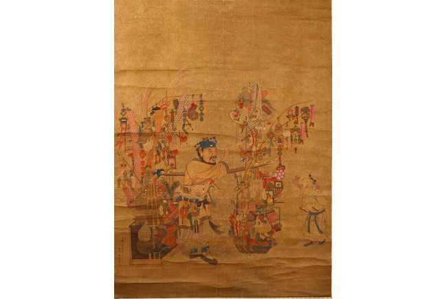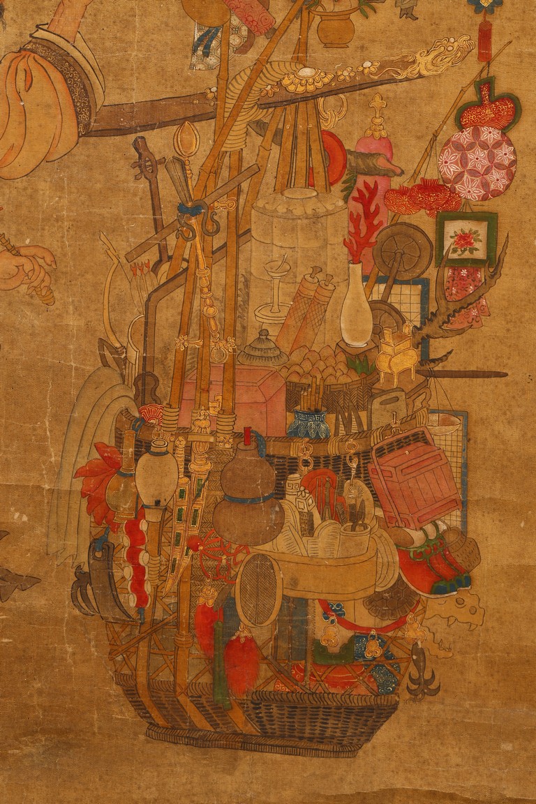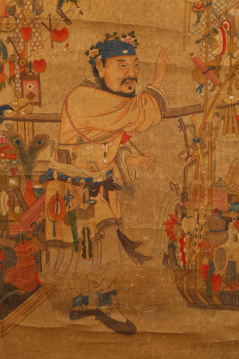 Chinese. Color and ink on silk. Boys and Merchant. Hanging scroll Inscribed and signed Su Hanchen in seal script with one seal mark. Attributed to Su Hanchen.