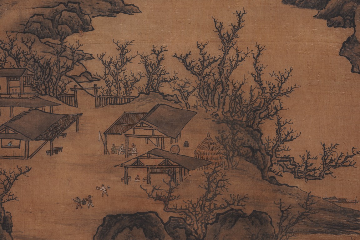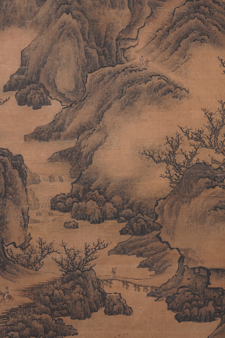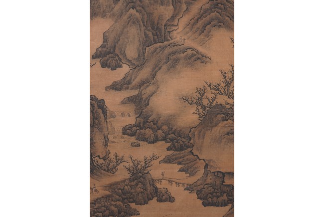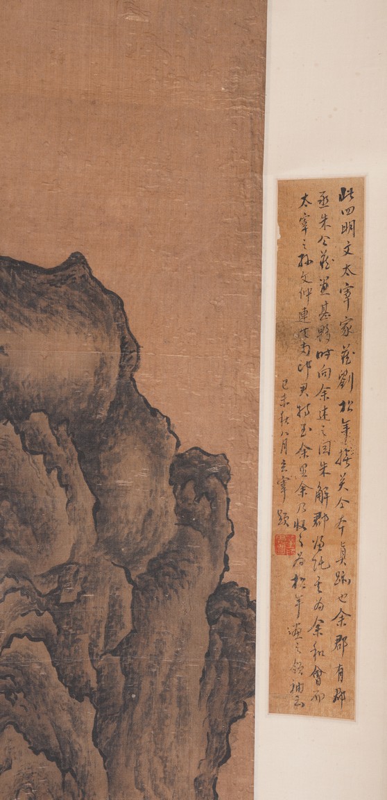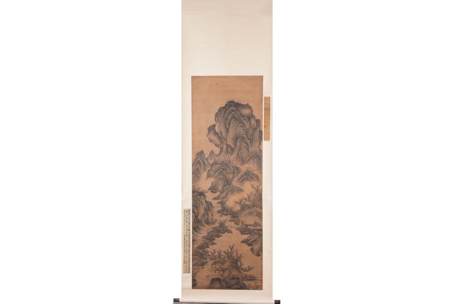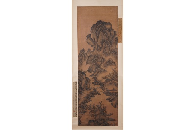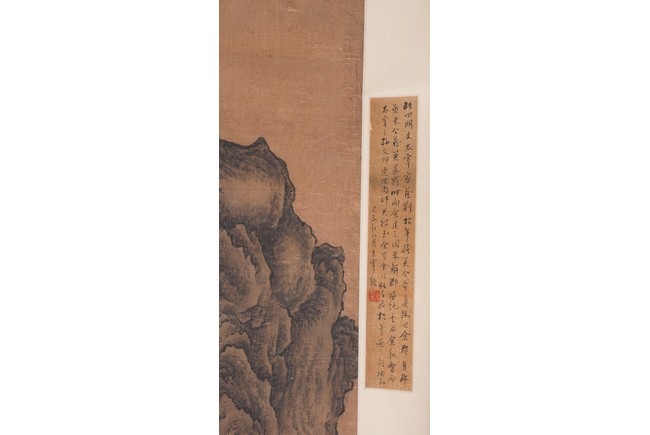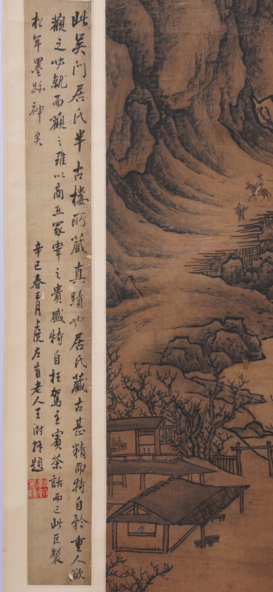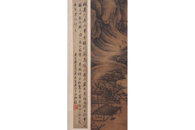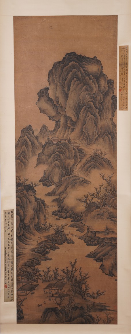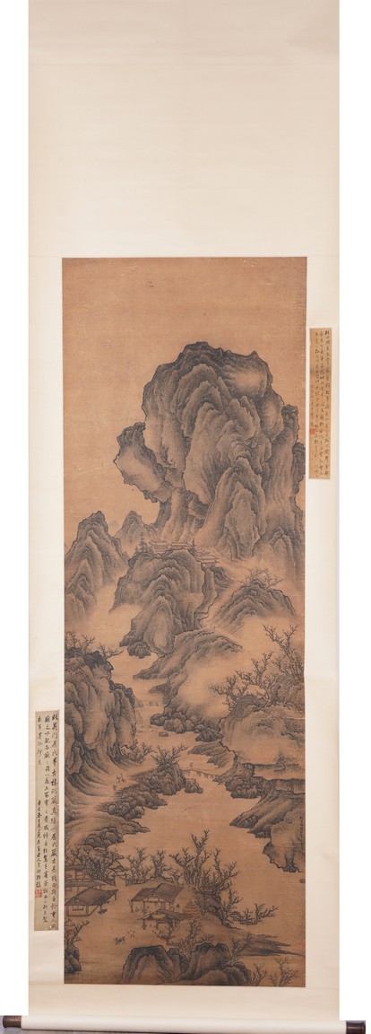 Color and ink on silk. Landscape. Anonymous. Attributed to Liu Songnian. with colophons inscribed and with seal marks.