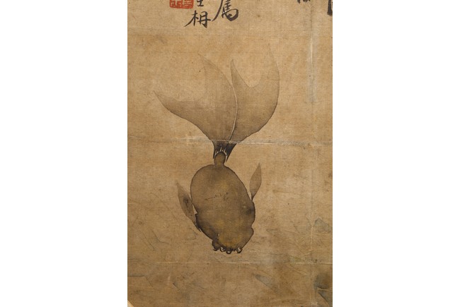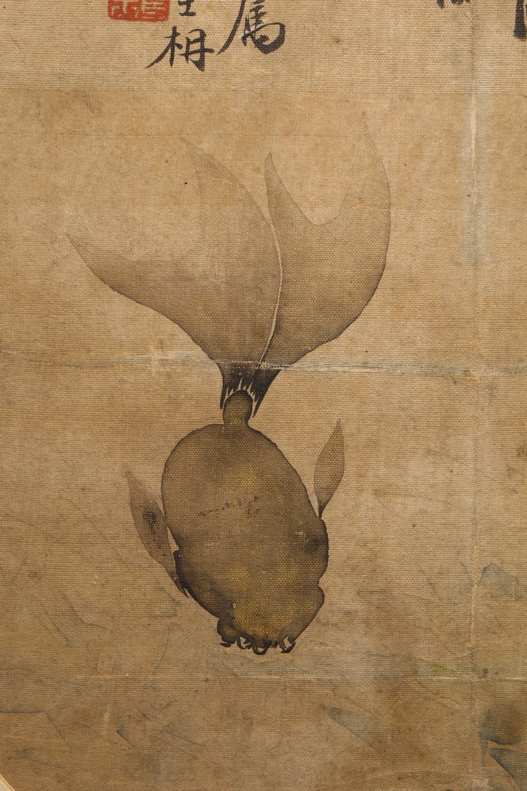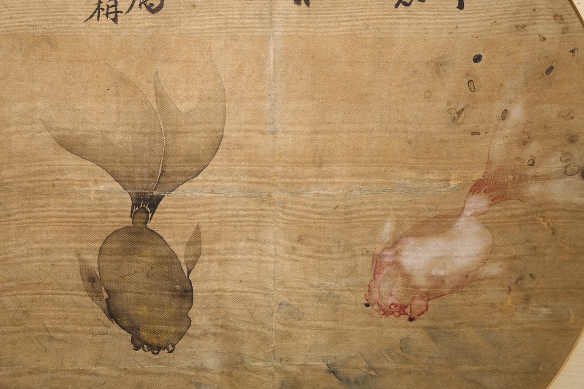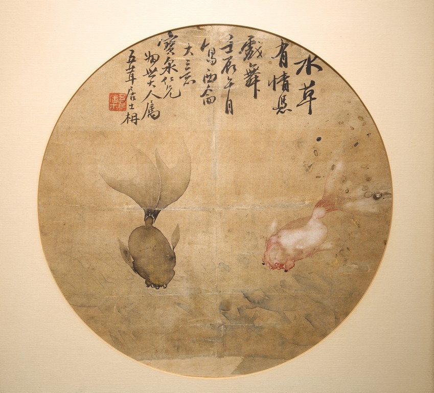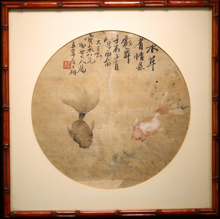 Chinese. Color and ink on paper. Goldfish. Framed. Inscribed and signed Wurong Jushi, with one seal mark.