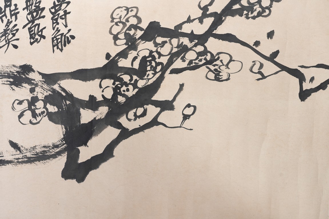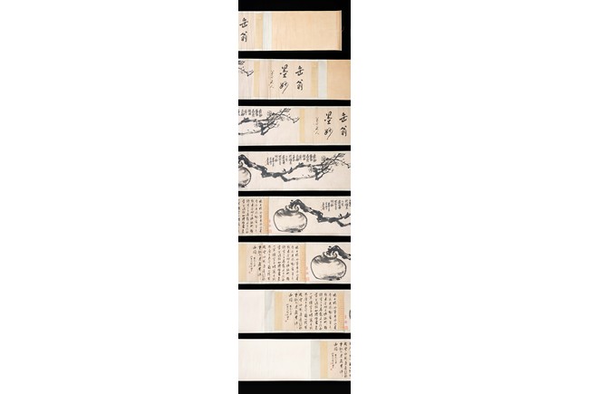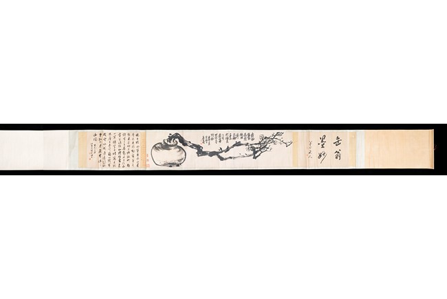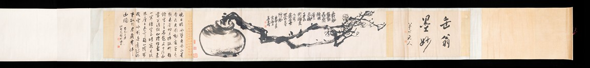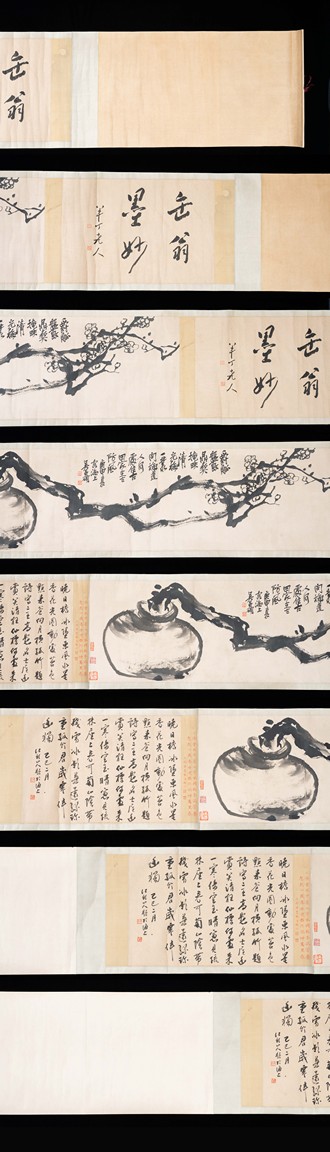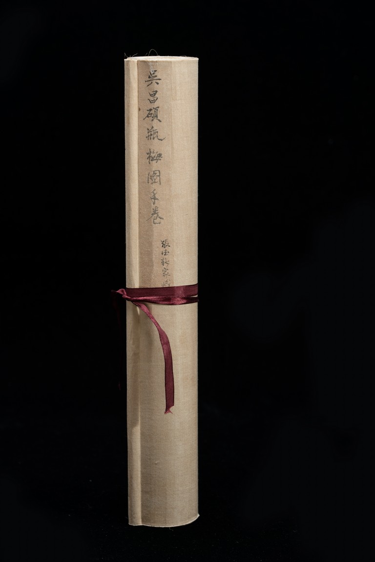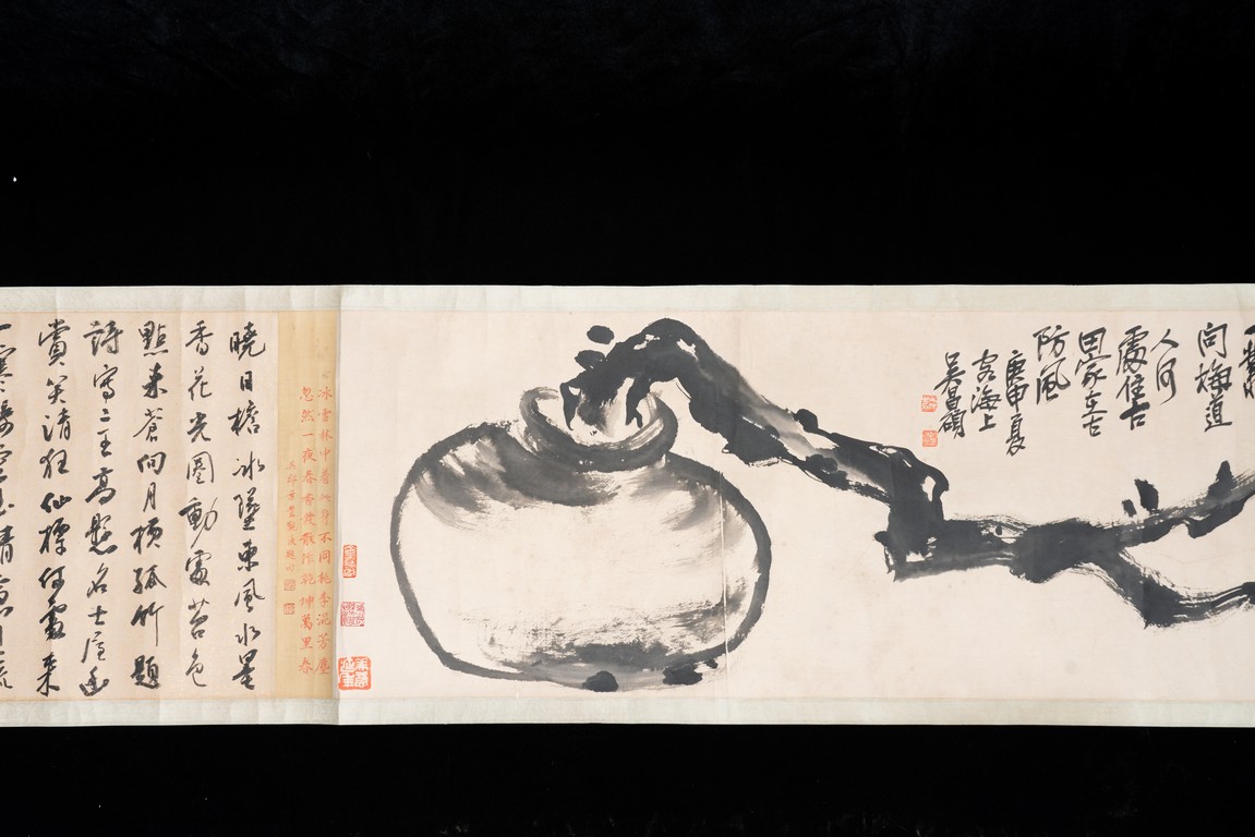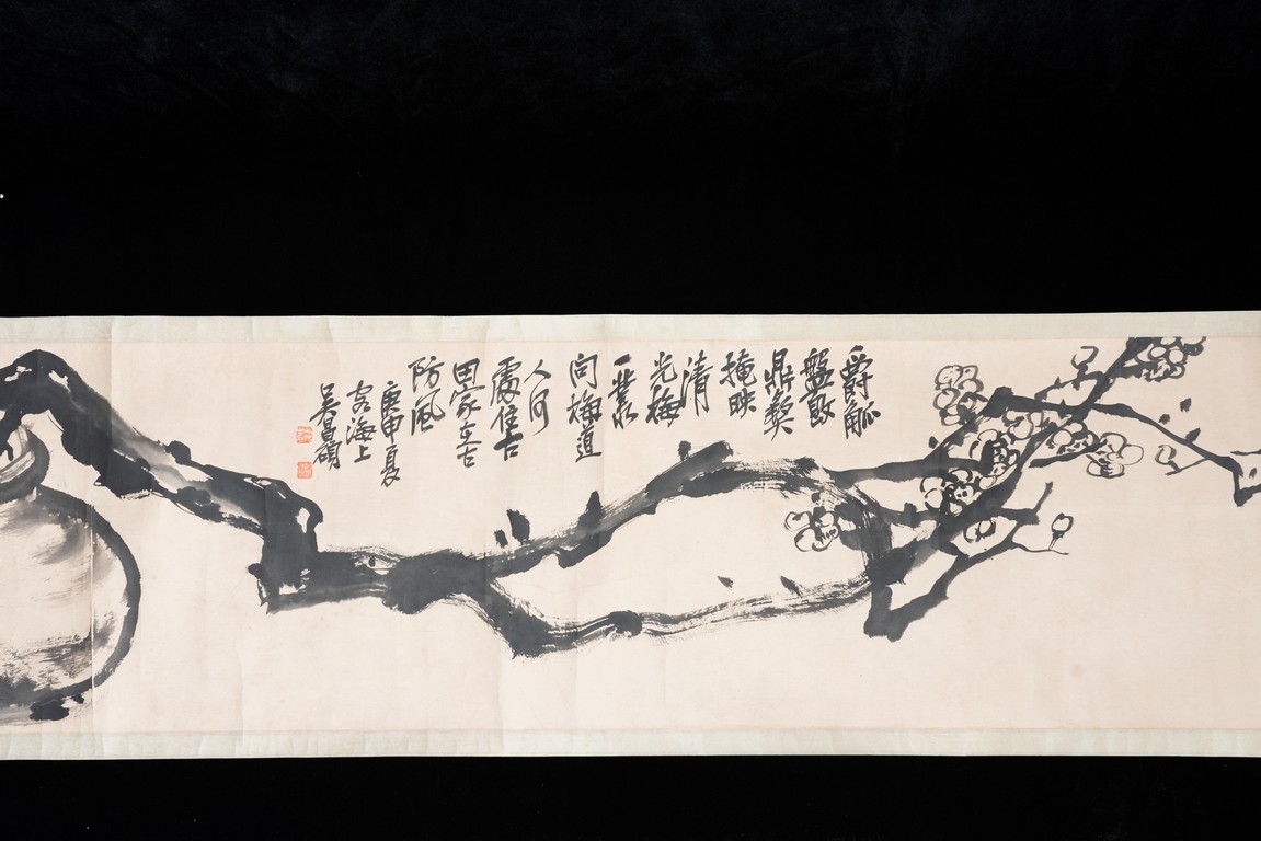Chinese. Ink on paper. Plum blossoms. Handscroll. Inscribed and signed Wu Changshuo with five seal marks. With frontispiece signed Ban Ding Lao Ren with two seal marks, and two colophons with four seal marks in total.