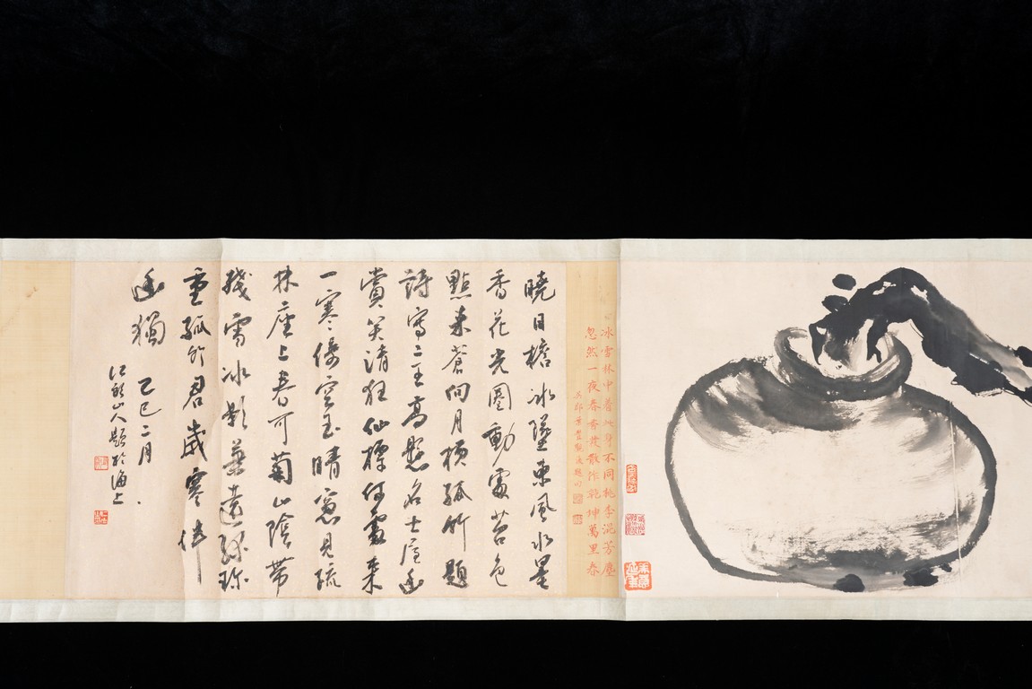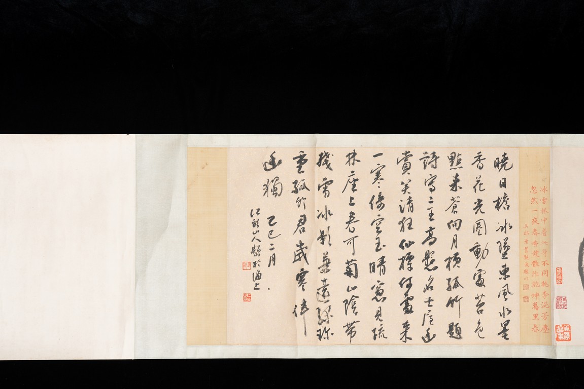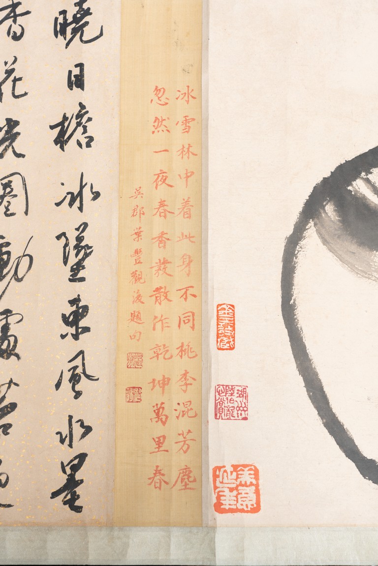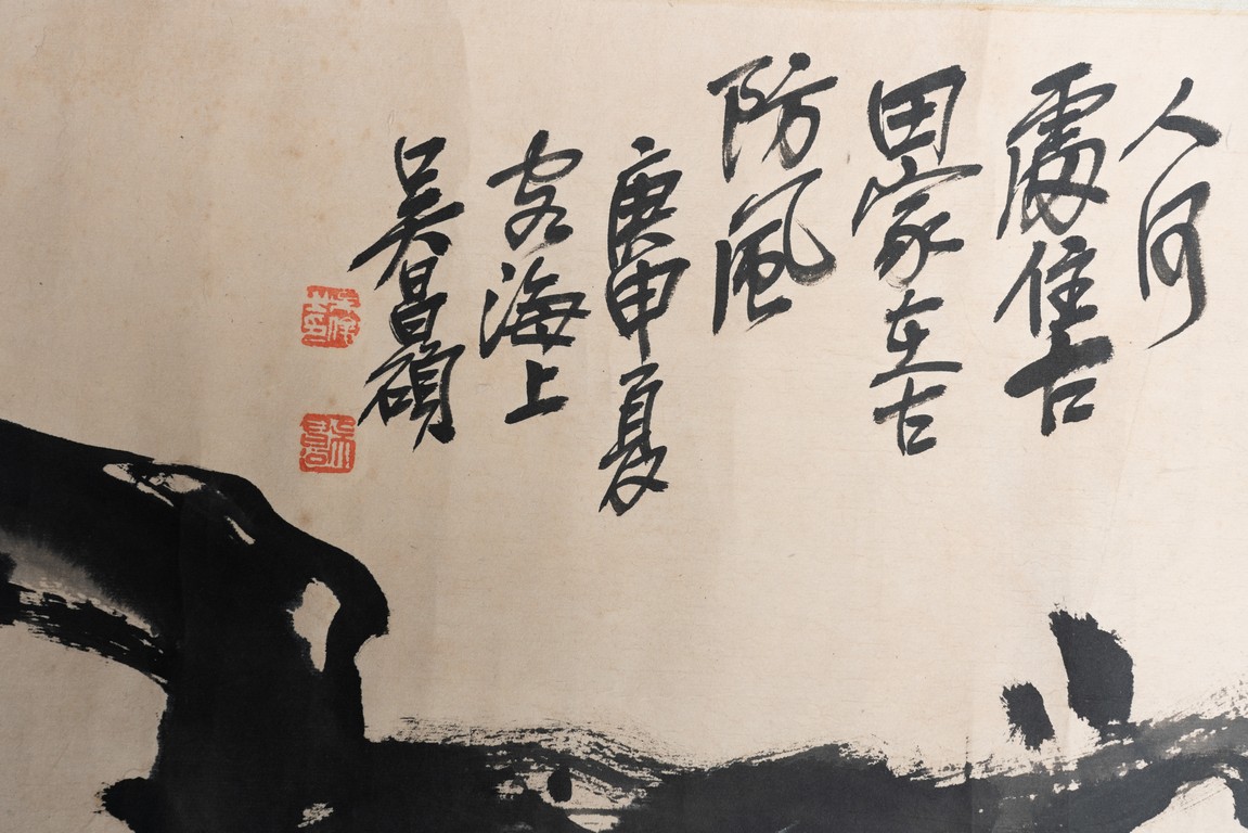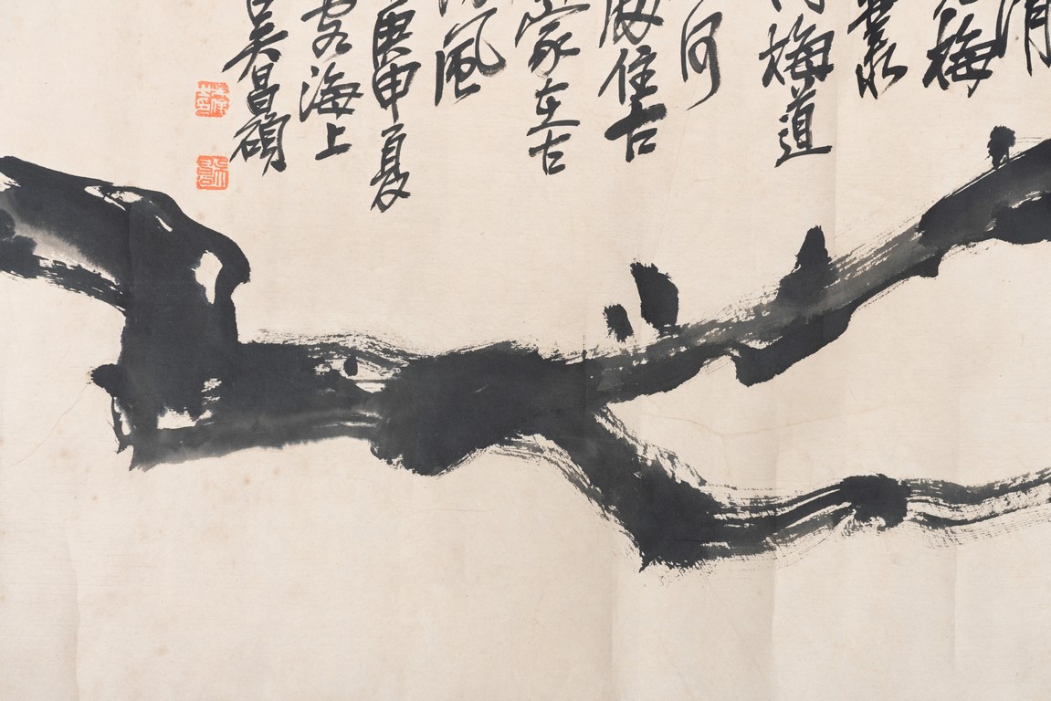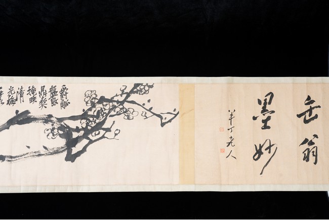 Chinese. Ink on paper. Plum blossoms. Handscroll. Inscribed and signed Wu Changshuo with five seal marks. With frontispiece signed Ban Ding Lao Ren with two seal marks, and two colophons with four seal marks in total.